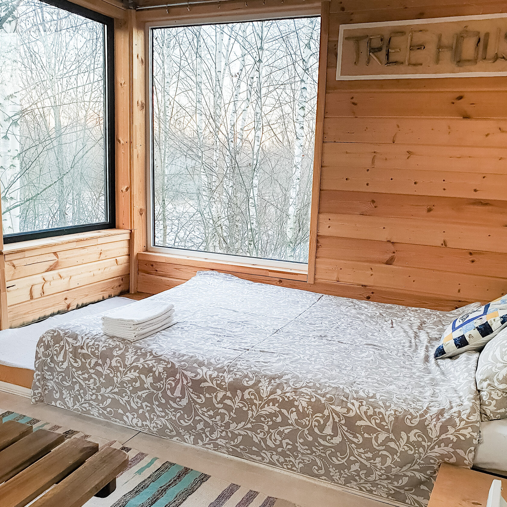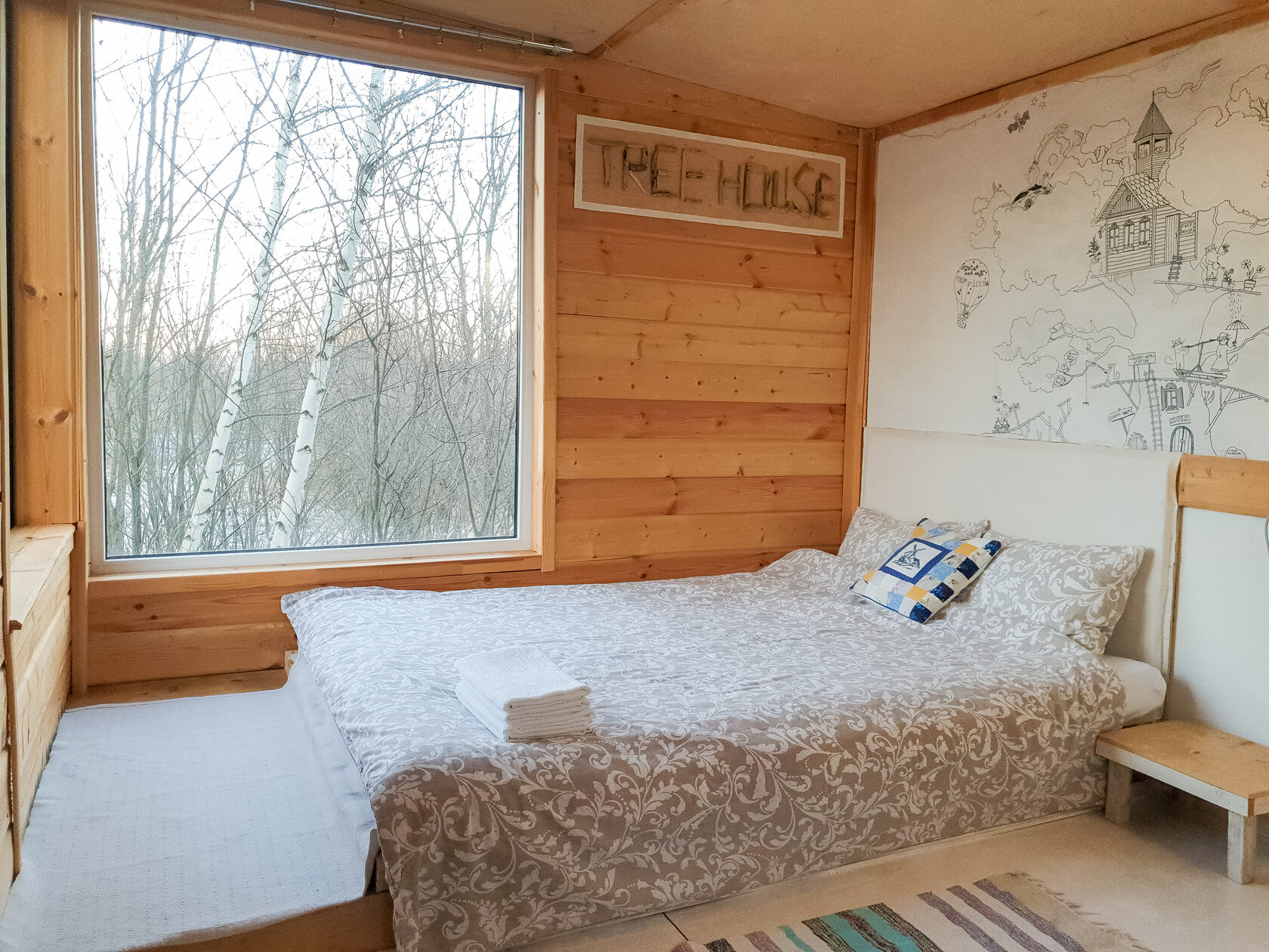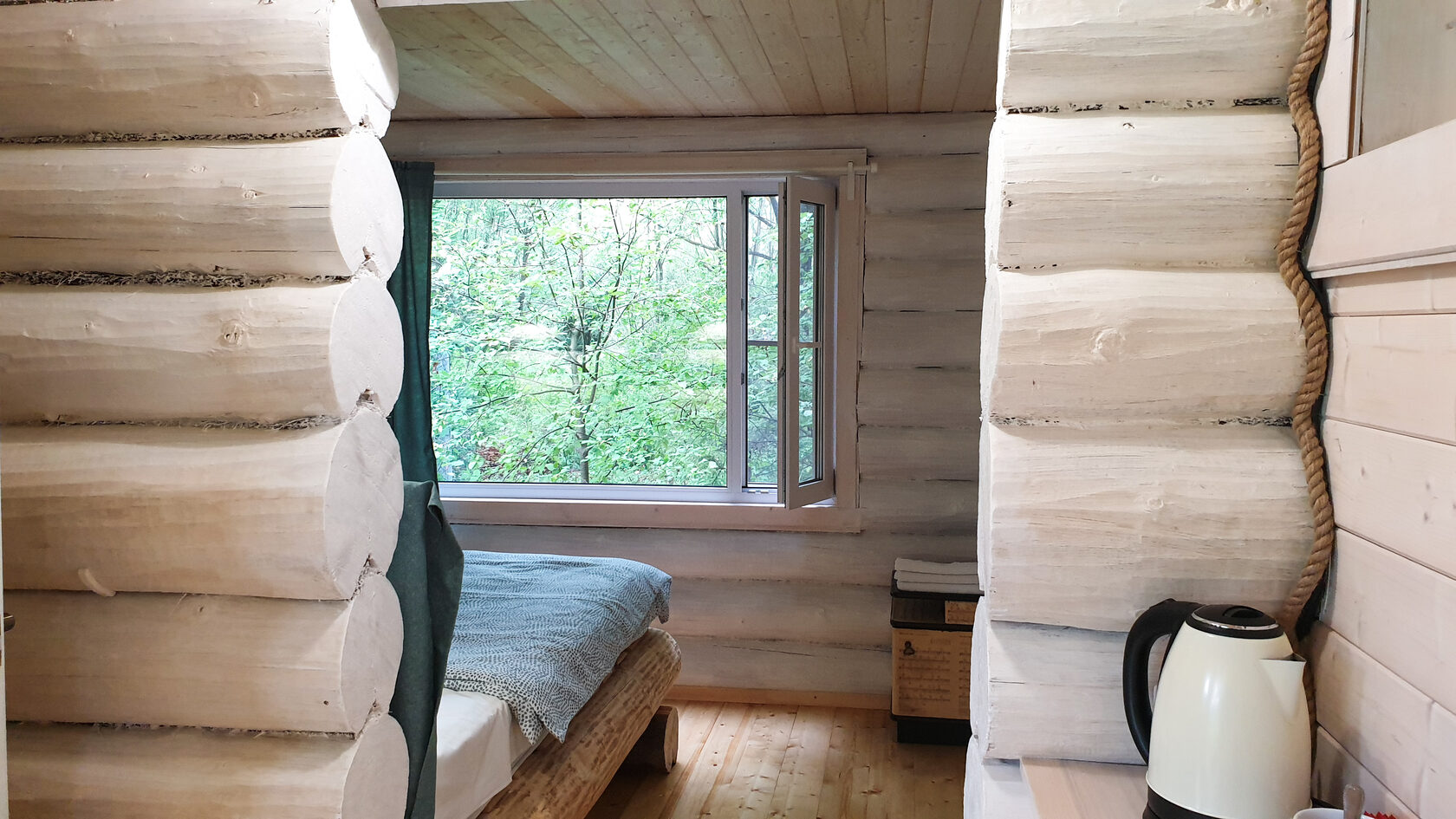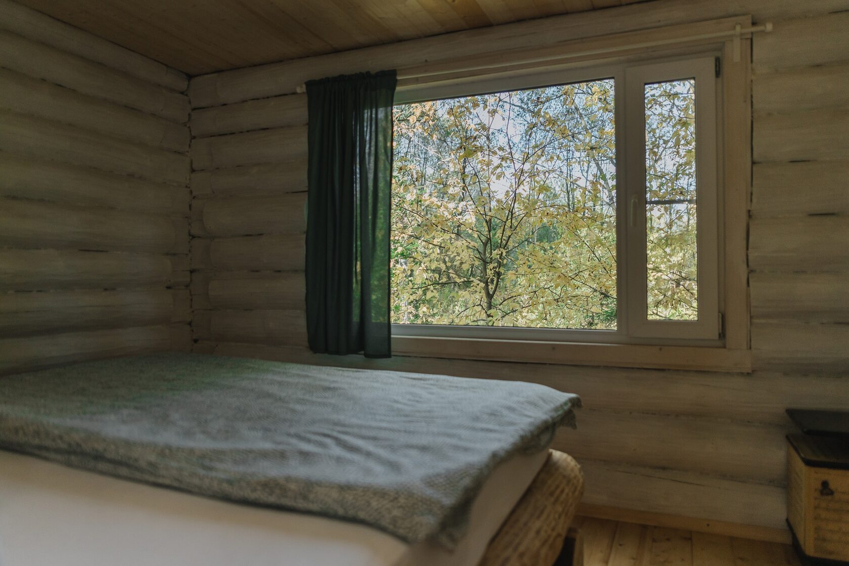 Большое окно из спальни выходит на лес Национального Парка. Стены домика из бревен, полы деревянные, а на большой бревенчатой кровати можно разместиться двум взрослым и 1 ребенку.