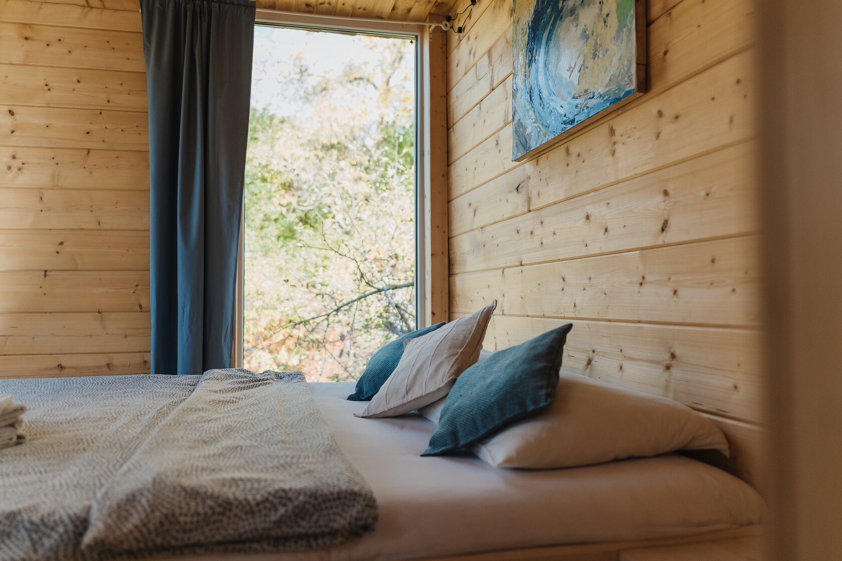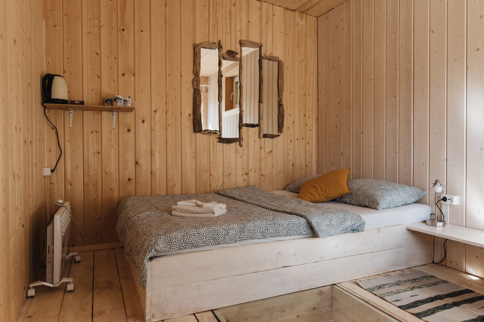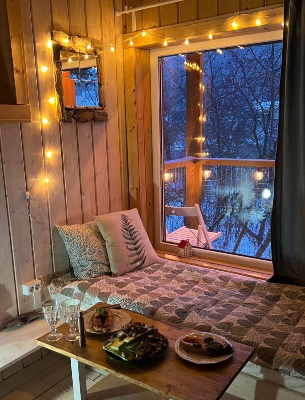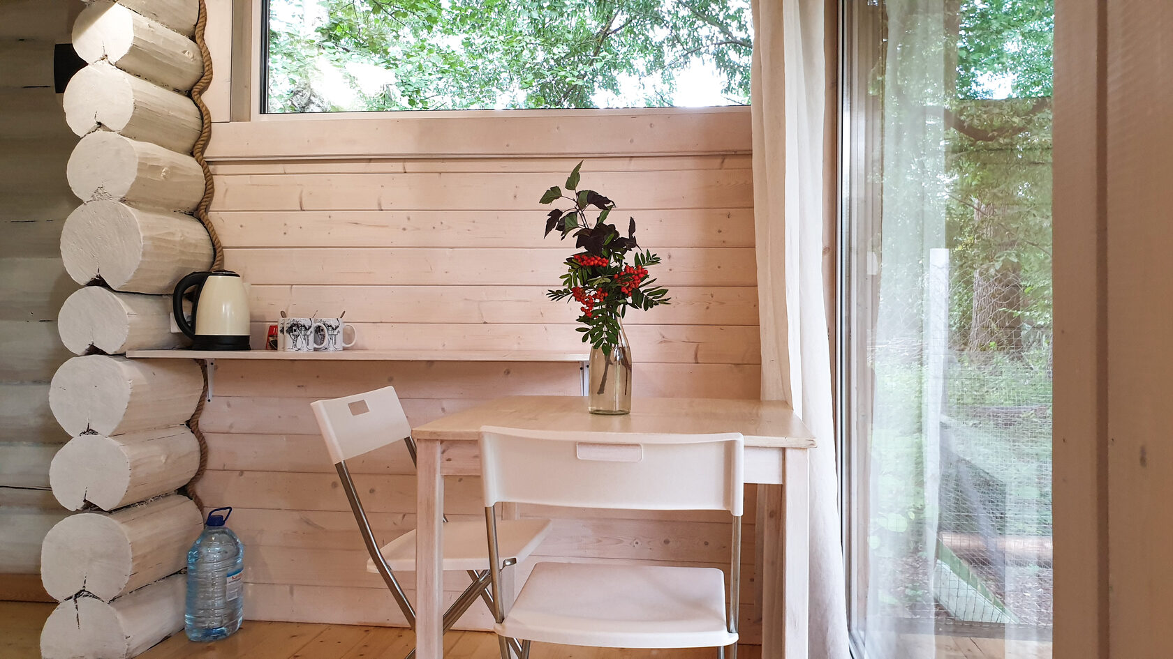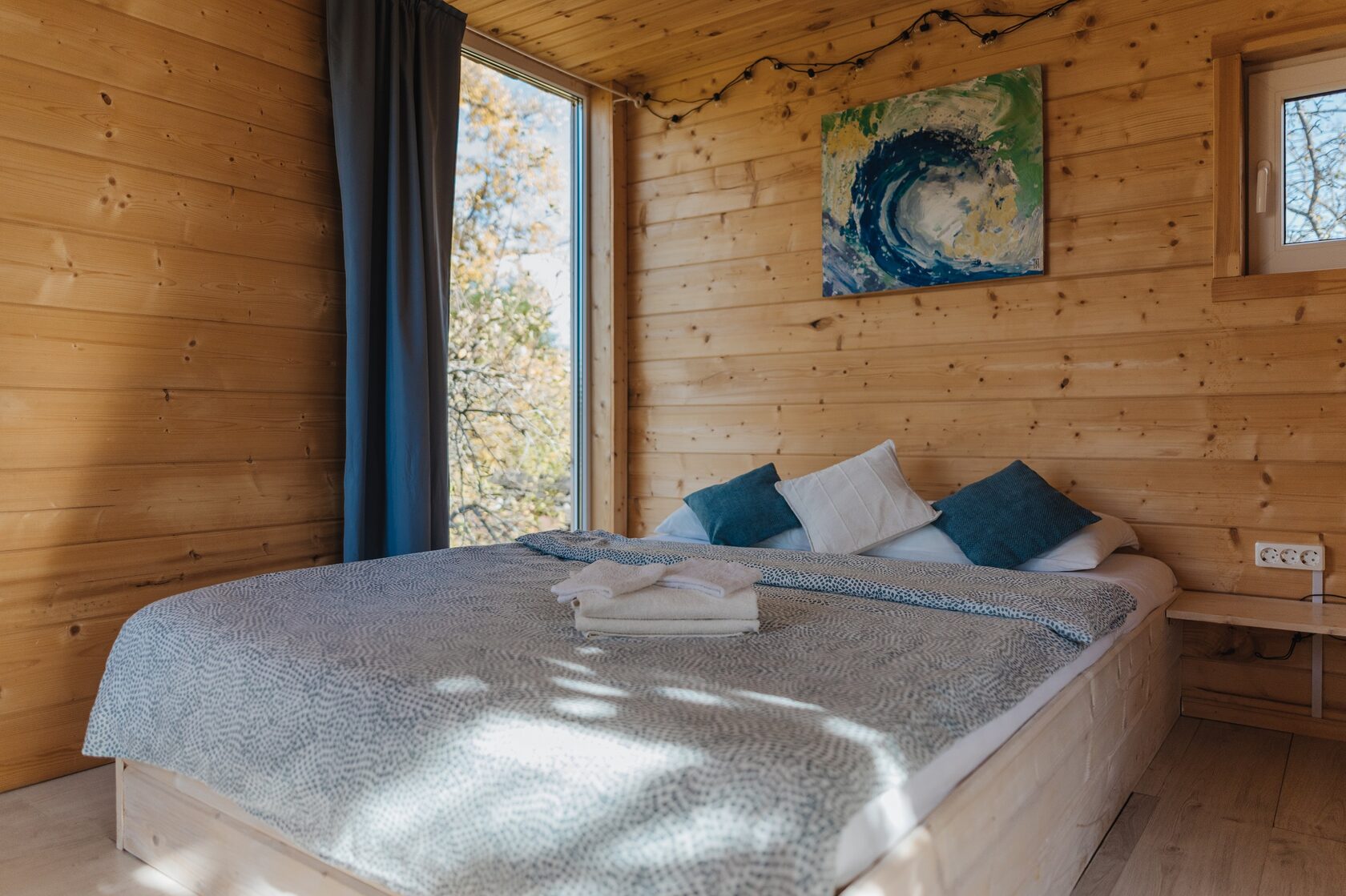 Большое окно из спальни выходит на лес Национального Парка. Стены домика из бревен, полы деревянные, а на большой бревенчатой кровати можно разместиться двум взрослым и 1 ребенку.