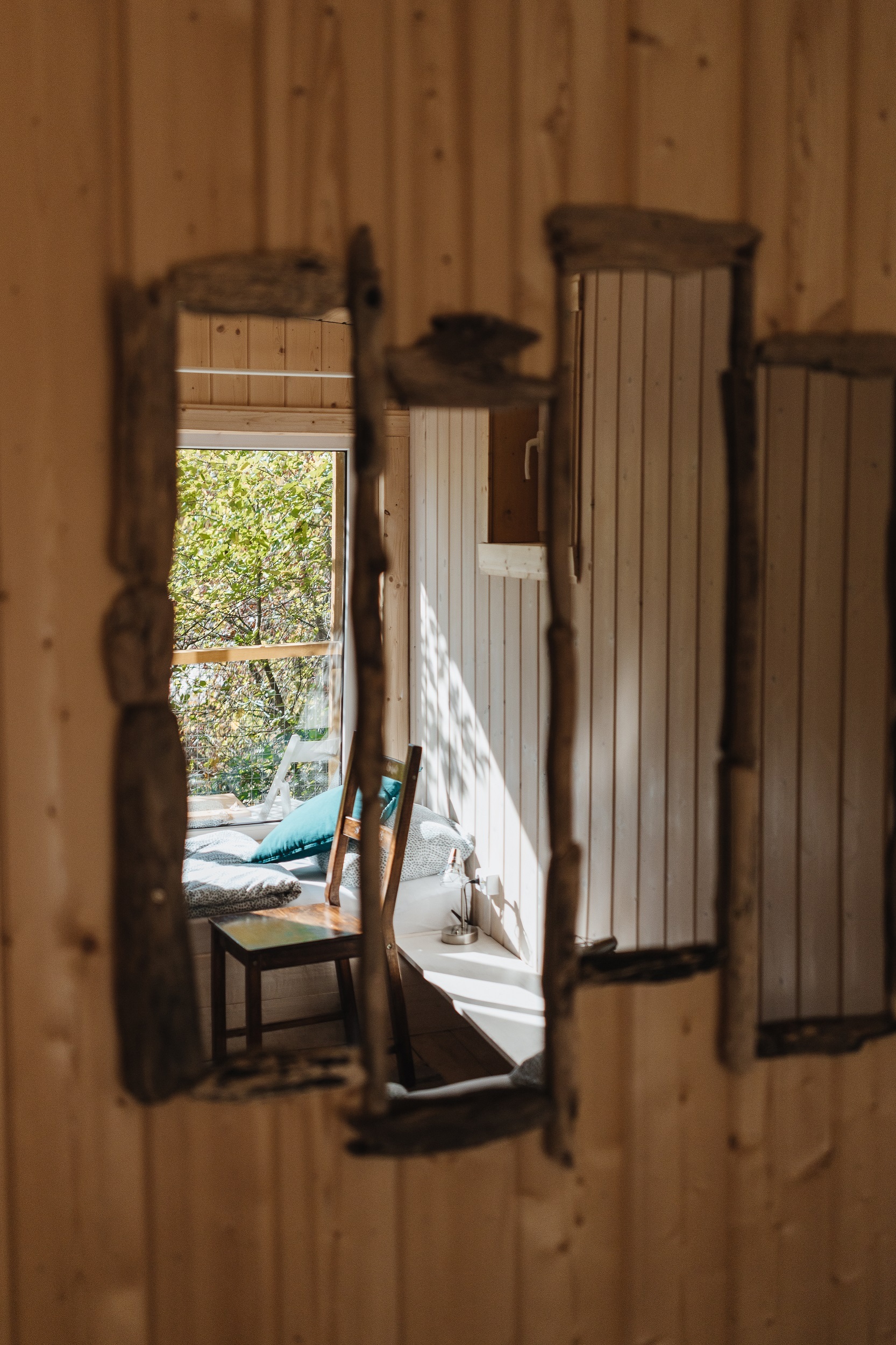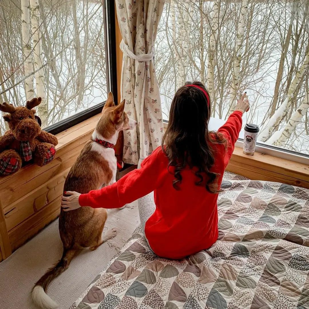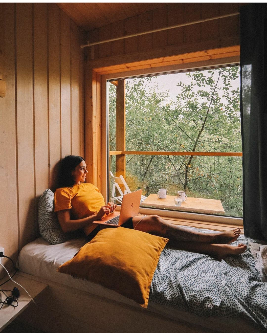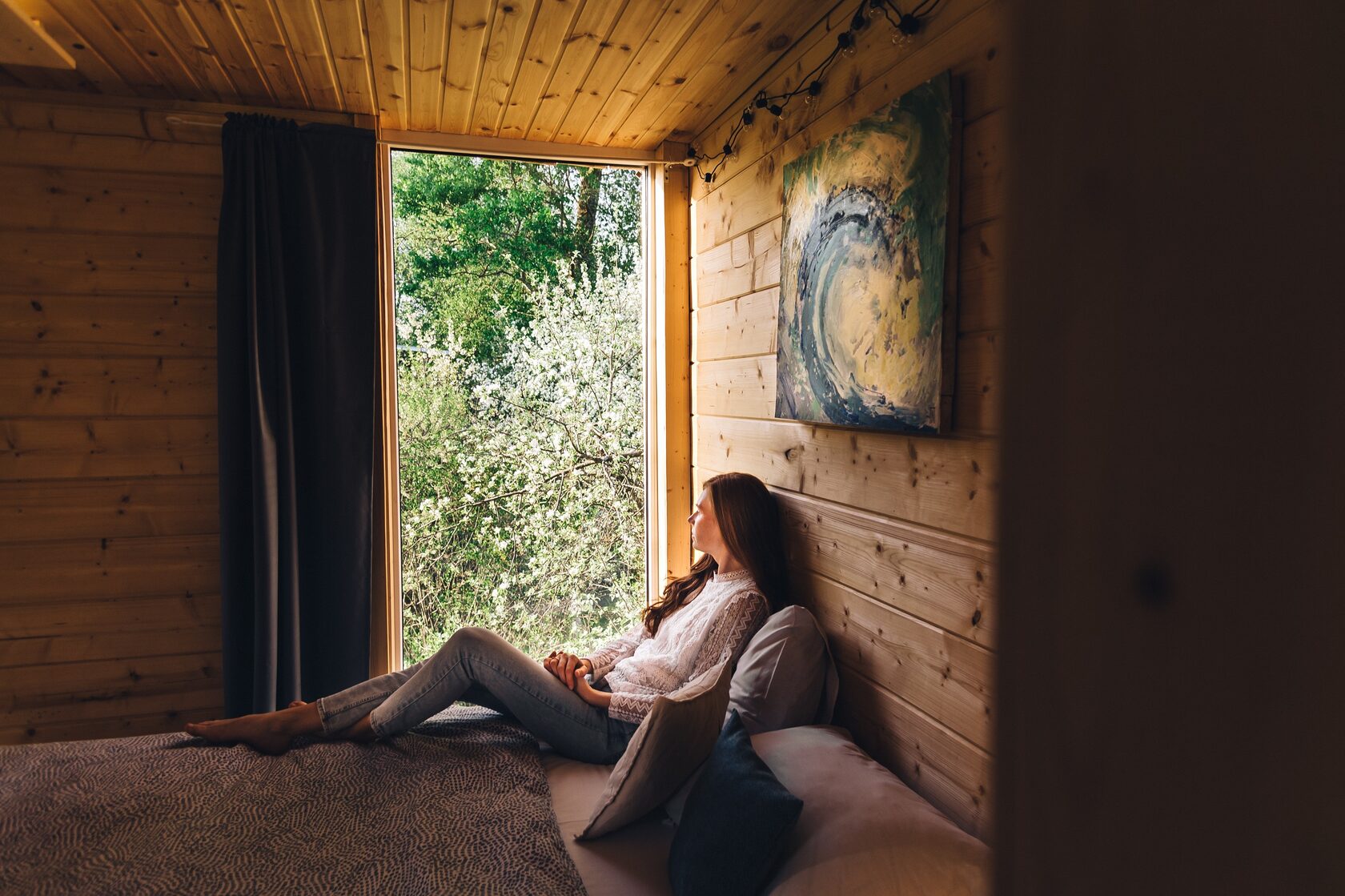 Большое окно из спальни выходит на лес Национального Парка. Стены домика из бревен, полы деревянные, а на большой бревенчатой кровати можно разместиться двум взрослым и 1 ребенку.