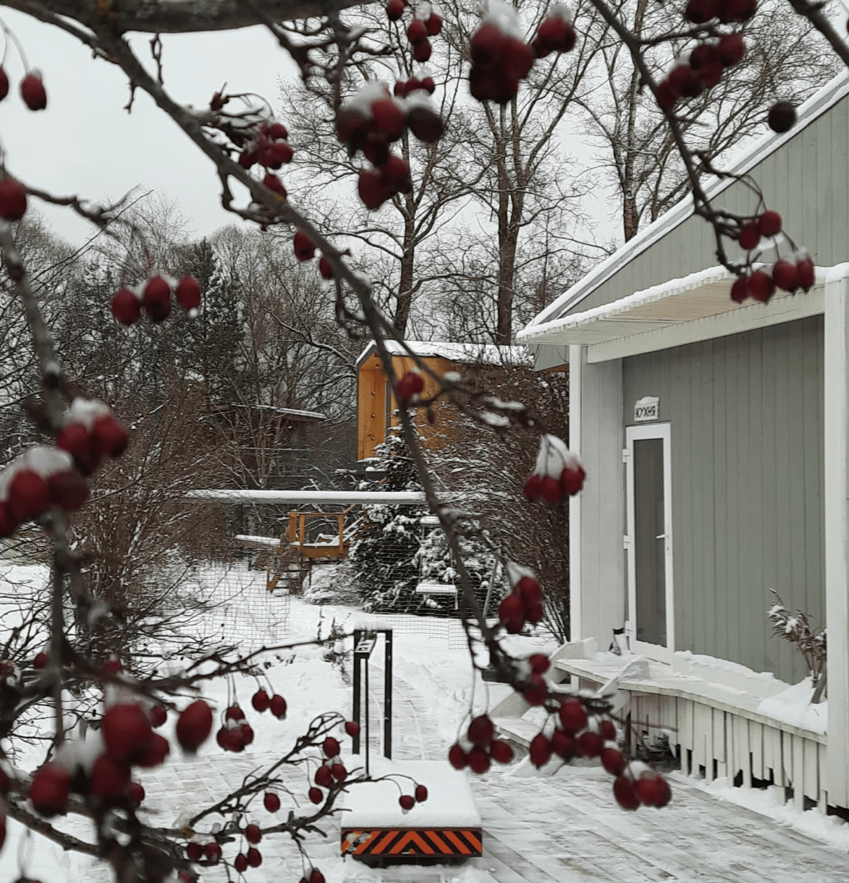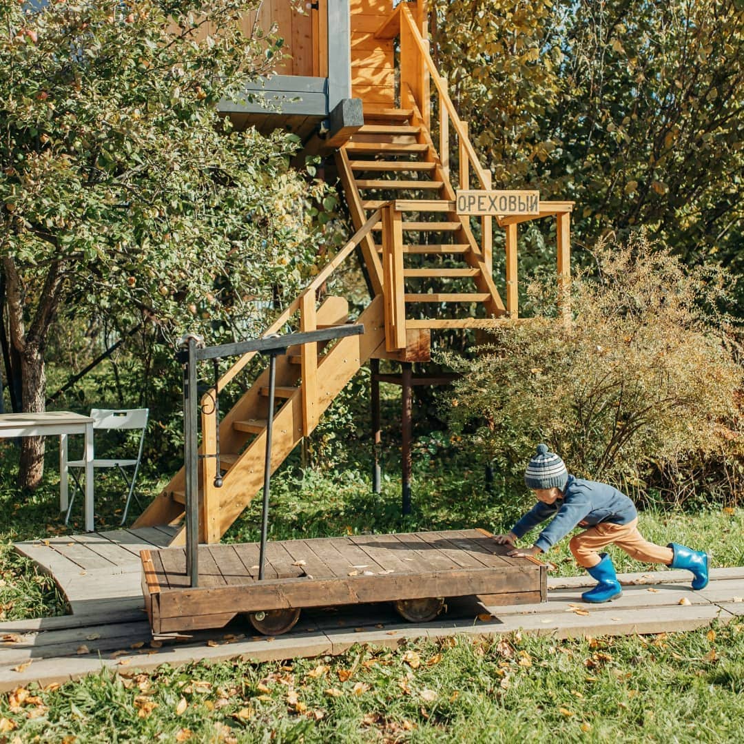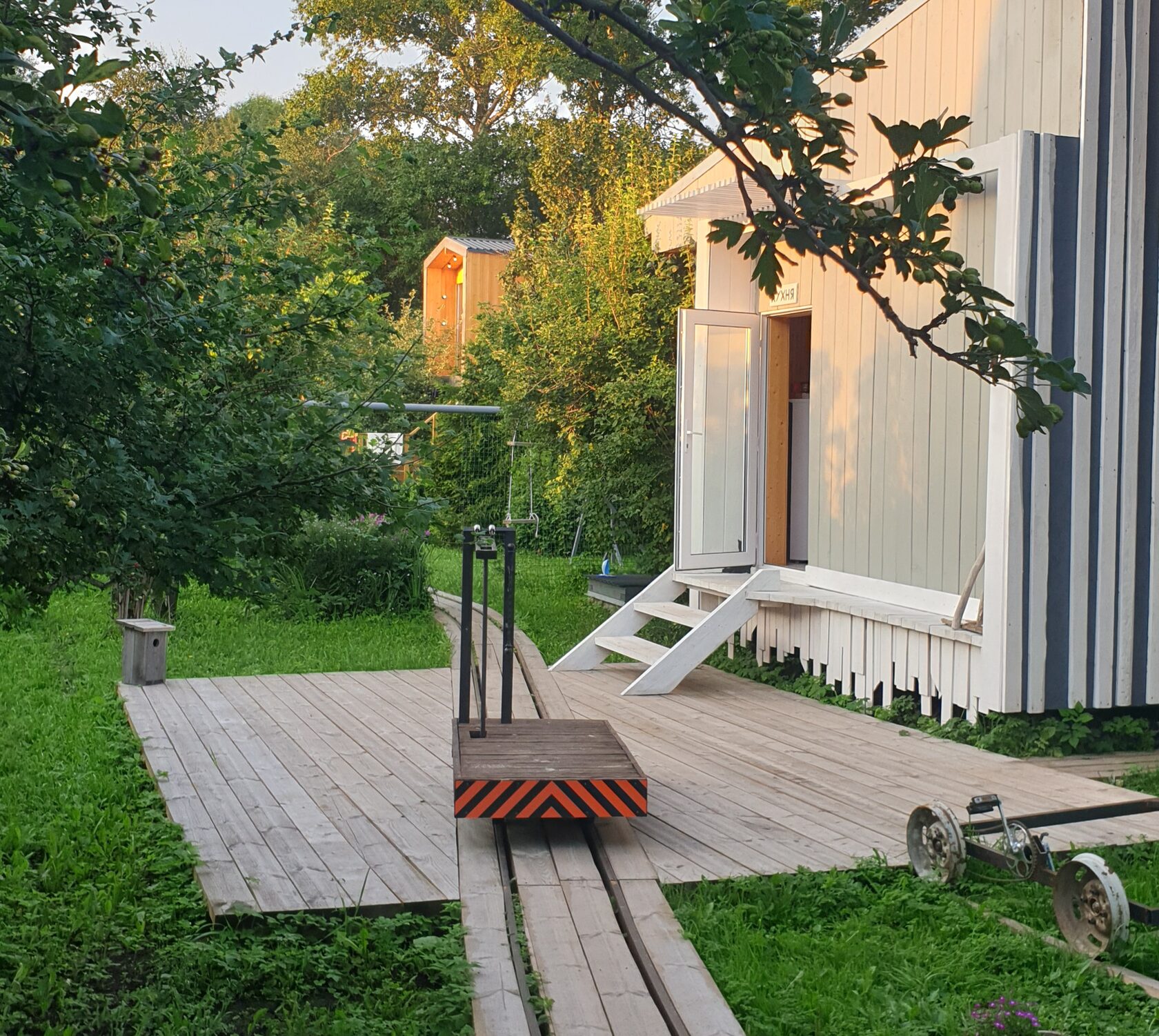 По территории мимо домиков проложена деревянная дорожка, в которую встроены рельсы, и по рельсам ходит ручная дрезина. Дрезина проезжает мимо каждого домика. Кататься на дрезине — это развлечение для всех. Дети просто в восторге! Но не забывайте, что дети должны ехать только со взрослым.