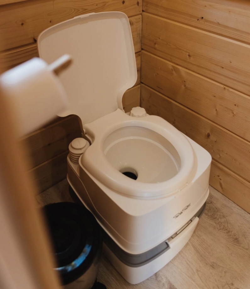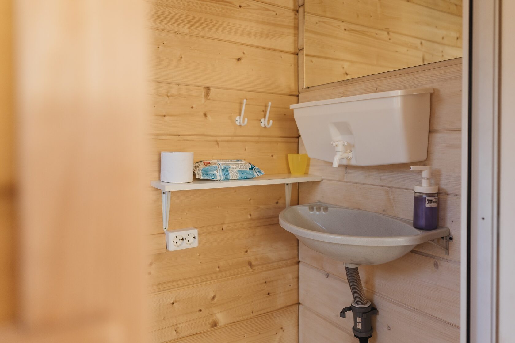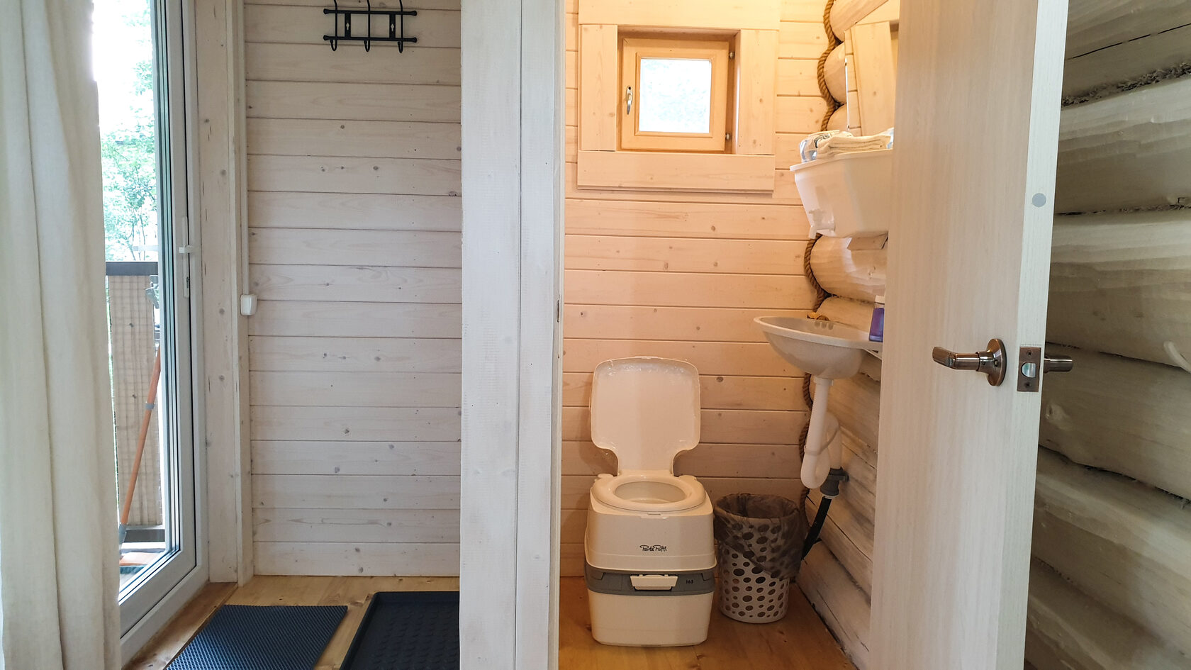 — полноценный санузел с душем находится в общем здании в 70 метрах от домика: