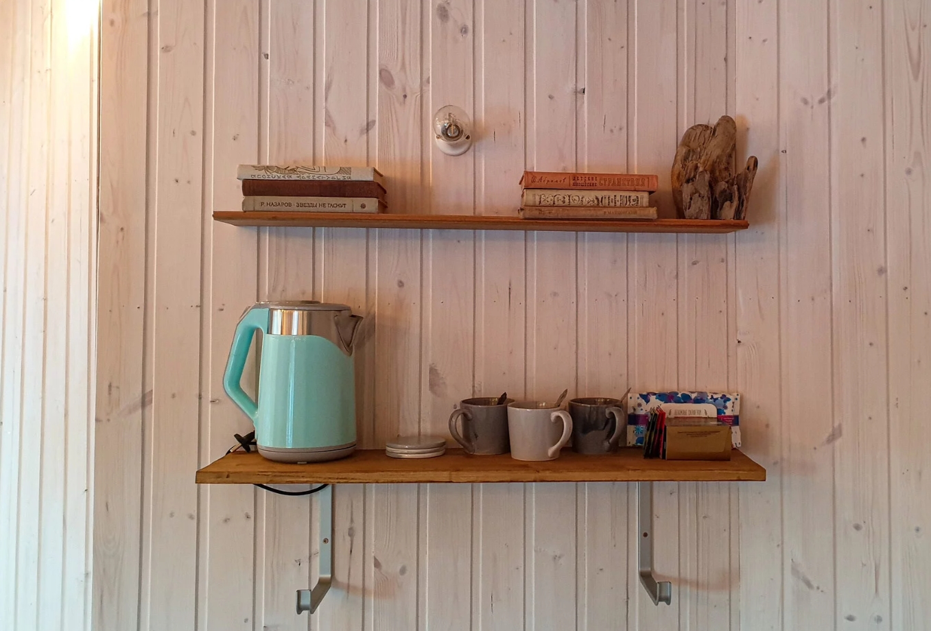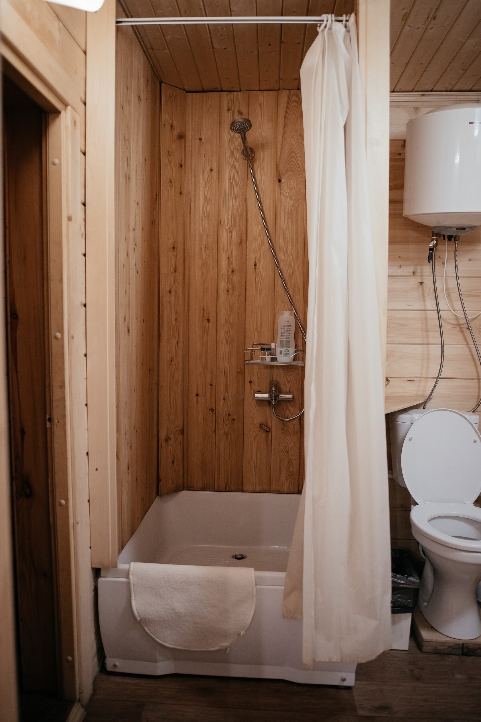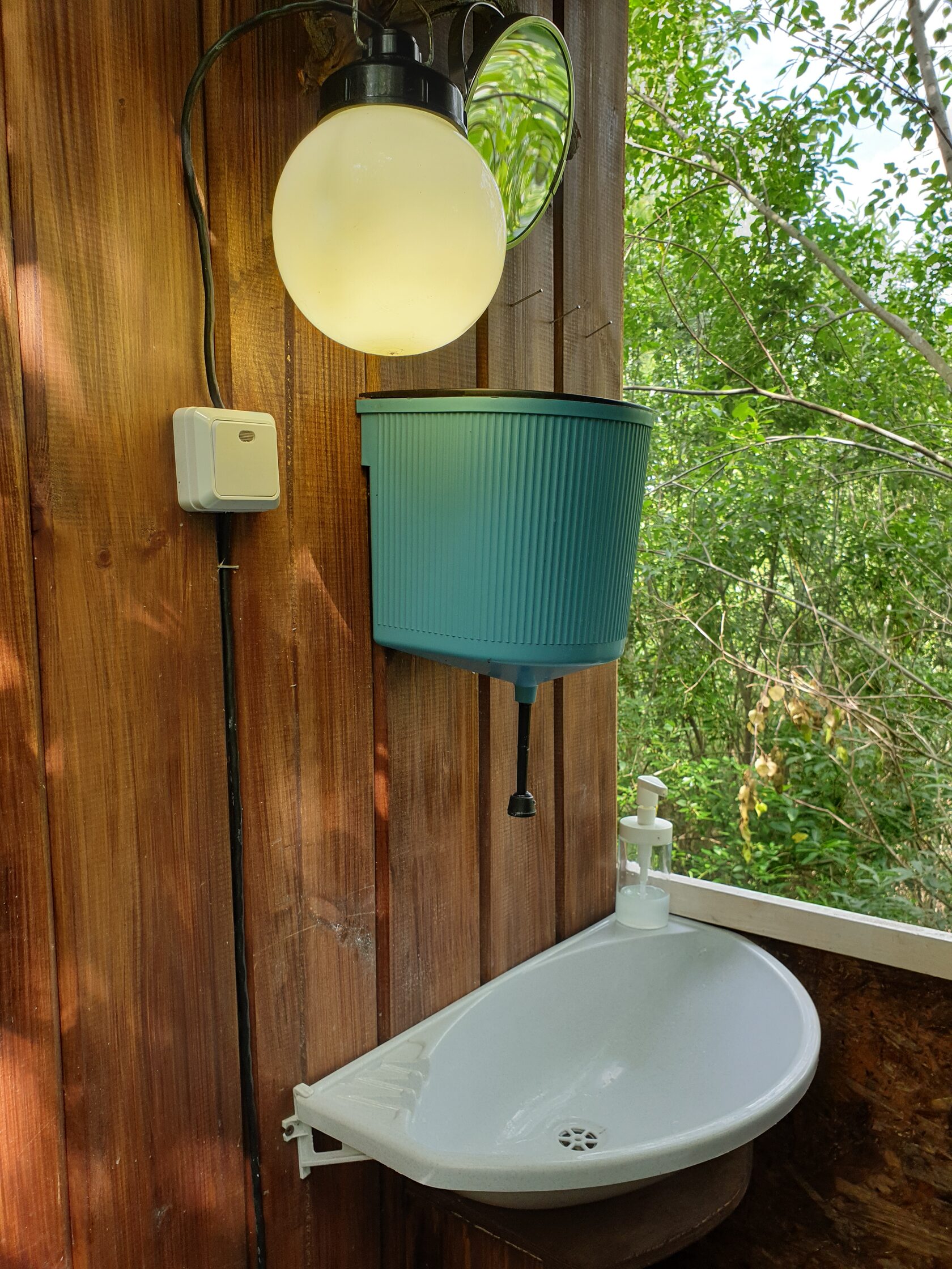 — полноценный санузел с душем находится в общем здании в 50 метрах от домика: