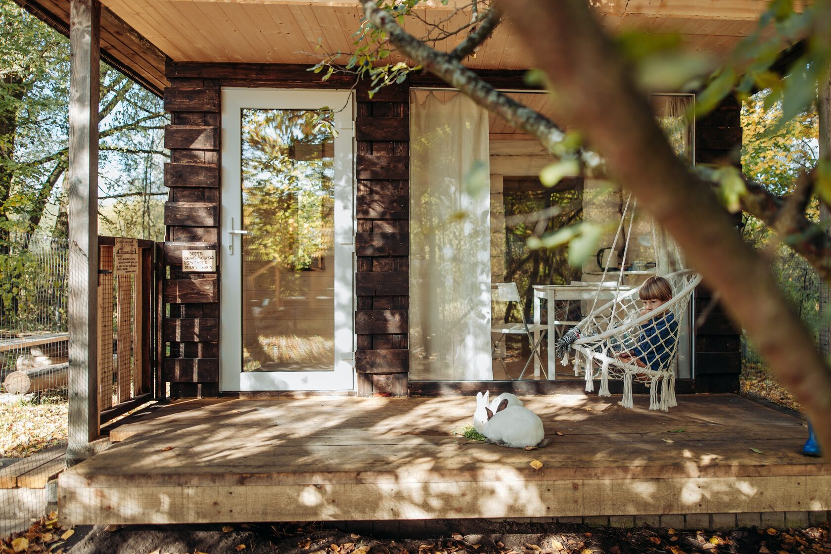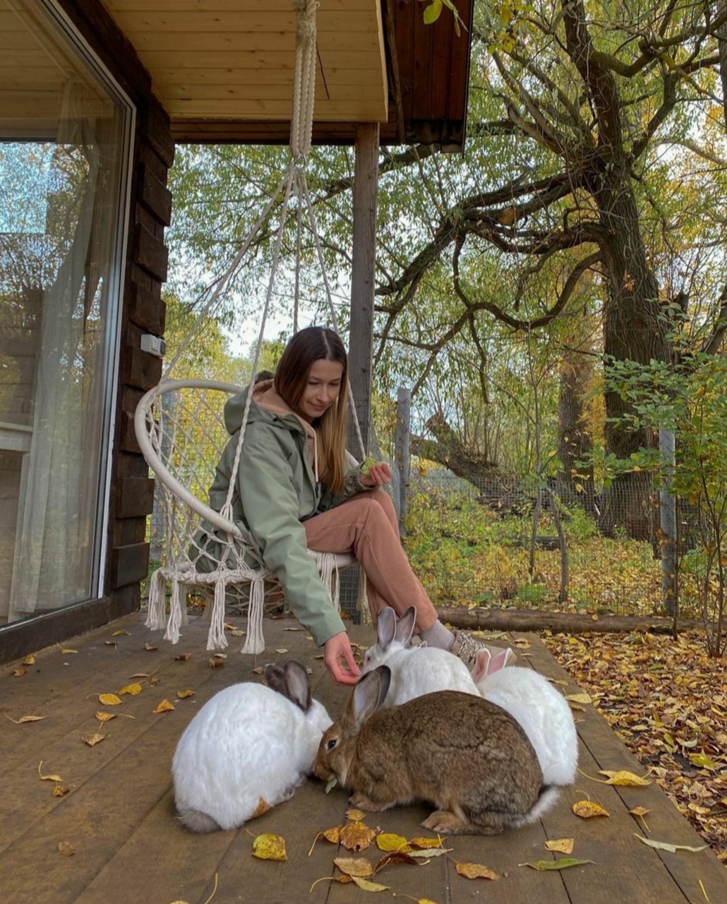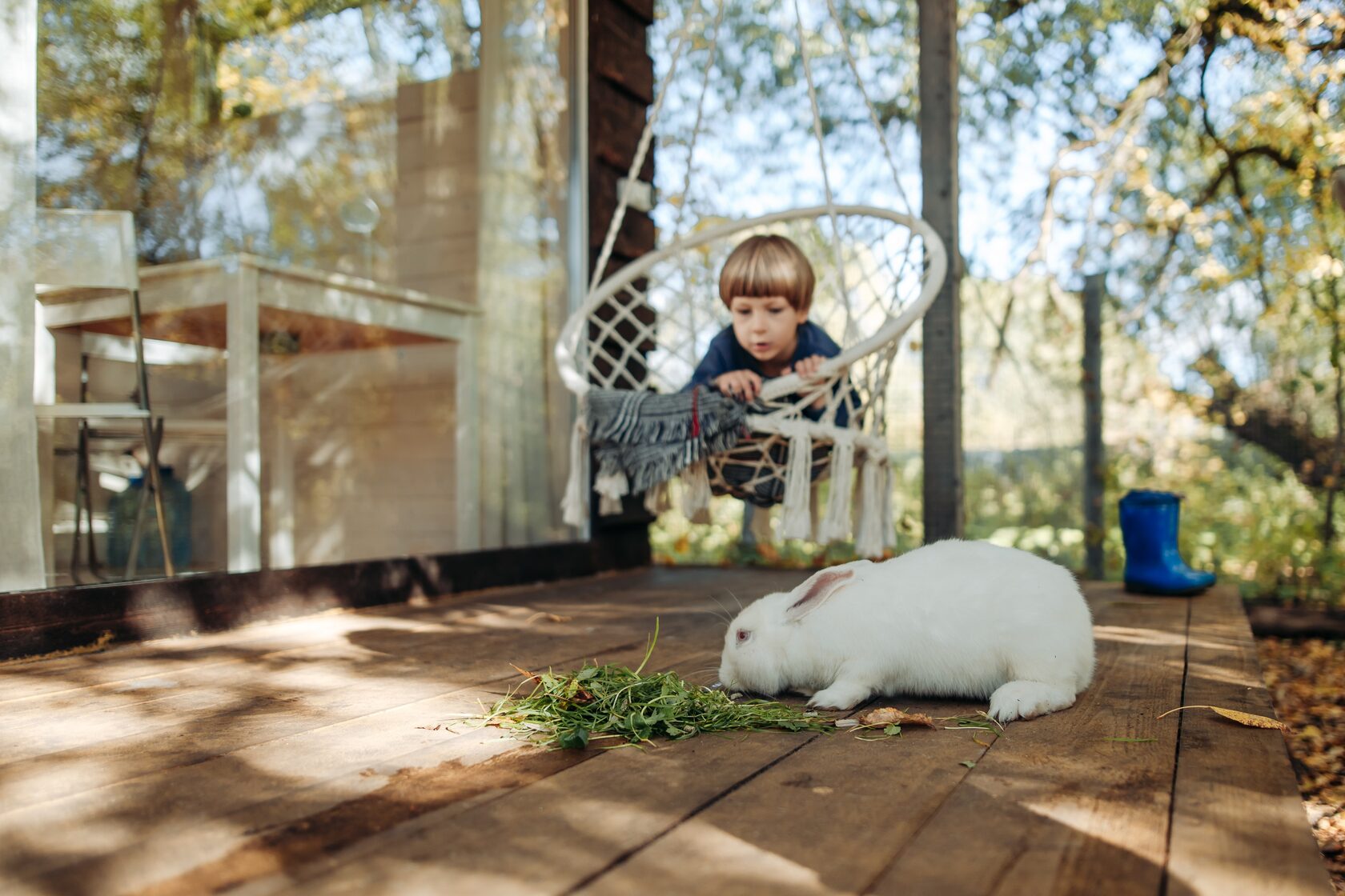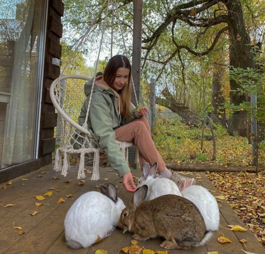 Летом возле домика живет семья кроликов, за их жизнью можно наблюдать через панорамное окно или сидя на веранде. Кроликов можно кормить и гладить.