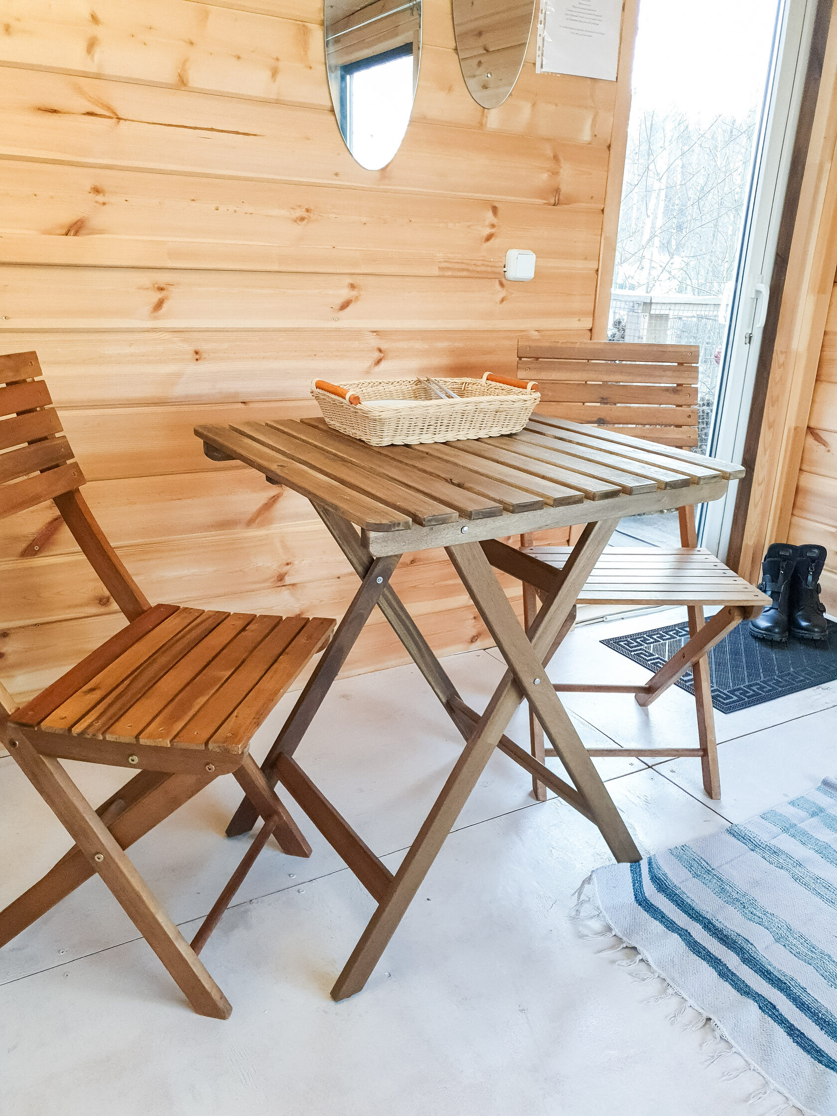— терраса под домиком: столик, кресло-качель, ретро-гирлянда;