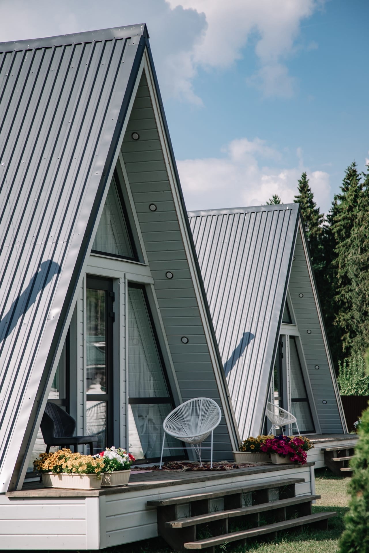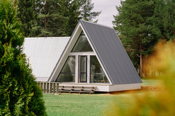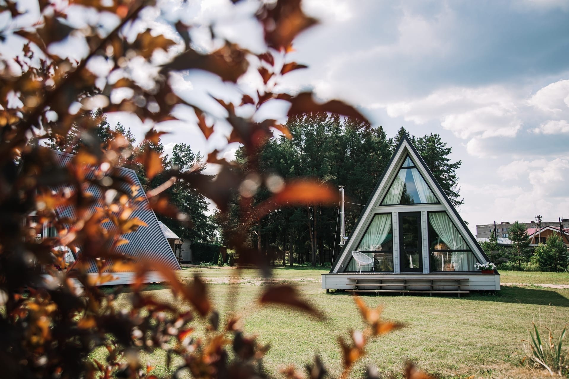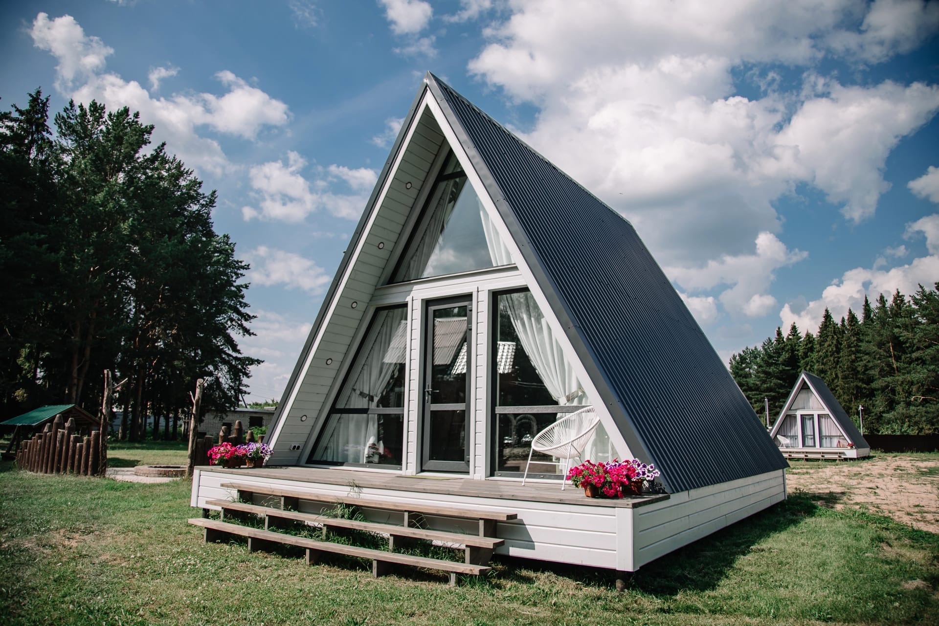 Четыре отдельных домика с панорамным видом на лес.