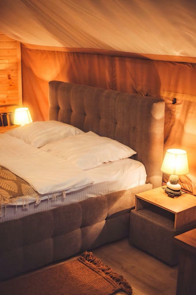 Внутри бунгало: двуспальная кровать 160х200, мягкий двухместный диван, стол, стулья, комод для вещей, этажерка, прикроватные тумбочки, напольный торшер и чайная станция, тёплые полы, электрические обогреватели («тепловые пушки»), электропростыни с датчиком регулировки температуры. И много красивого атмосферного декора - тёплый коврик, оригинальные светильники и другие уютные мелочи.