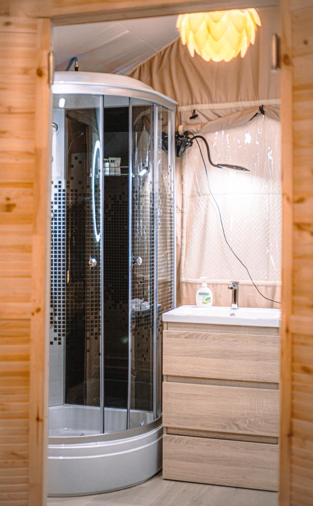 В бунгало установлен полноценный банный модуль с душевой кабиной, раковиной и биотуалетом, есть полотенца и банные халаты. Зеркало с подсветкой. И большое окно с красивым видом на лес (разумеется, окно закрывается, обеспечивая, когда нужно, необходимую приватность)