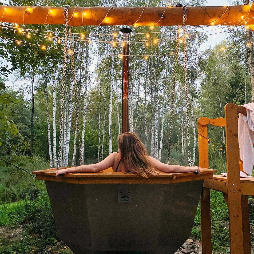 Настоящая русская баня в лесу у озера и банный чан на открытом воздухе.