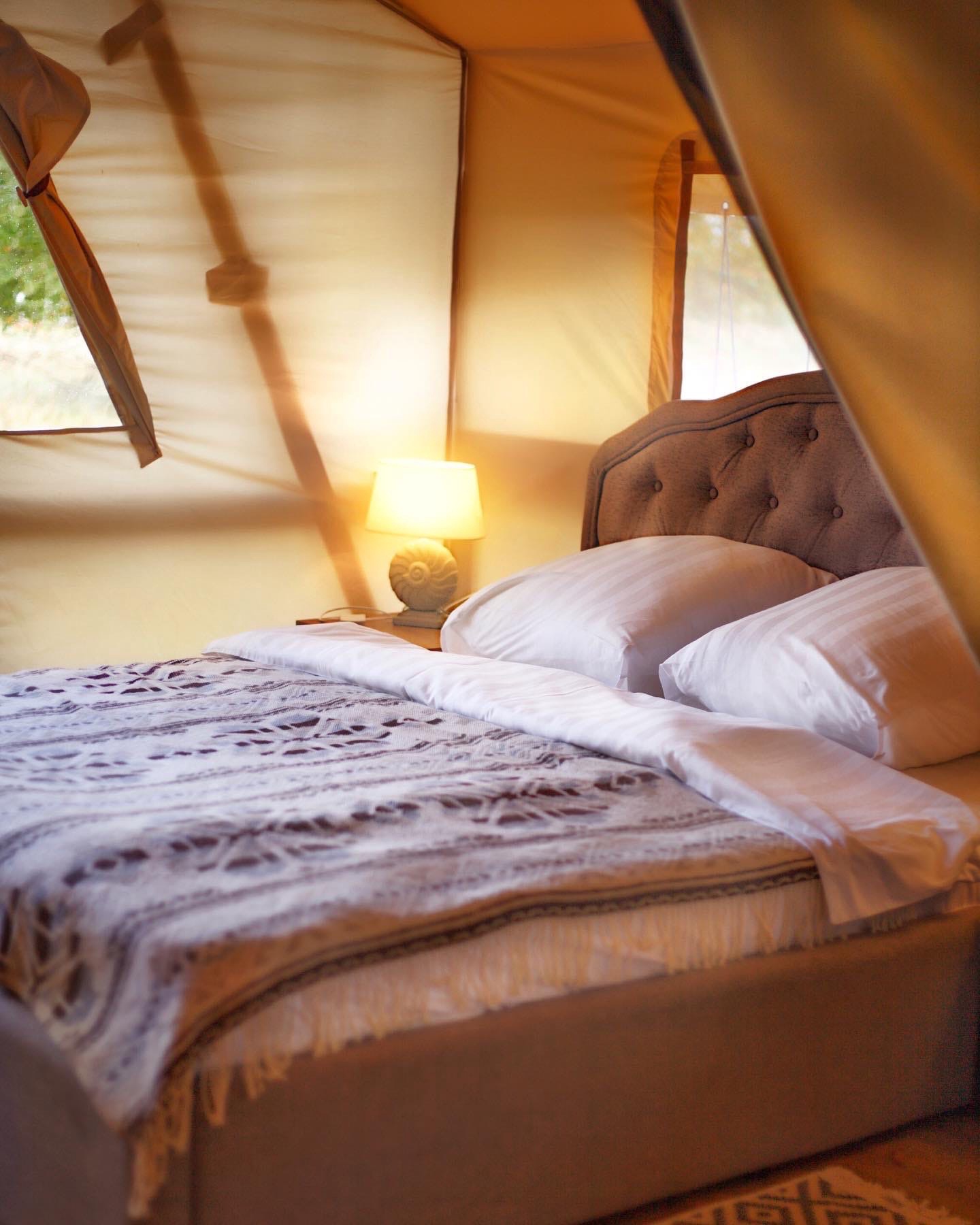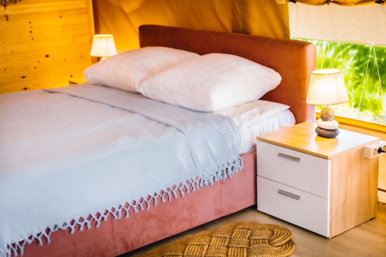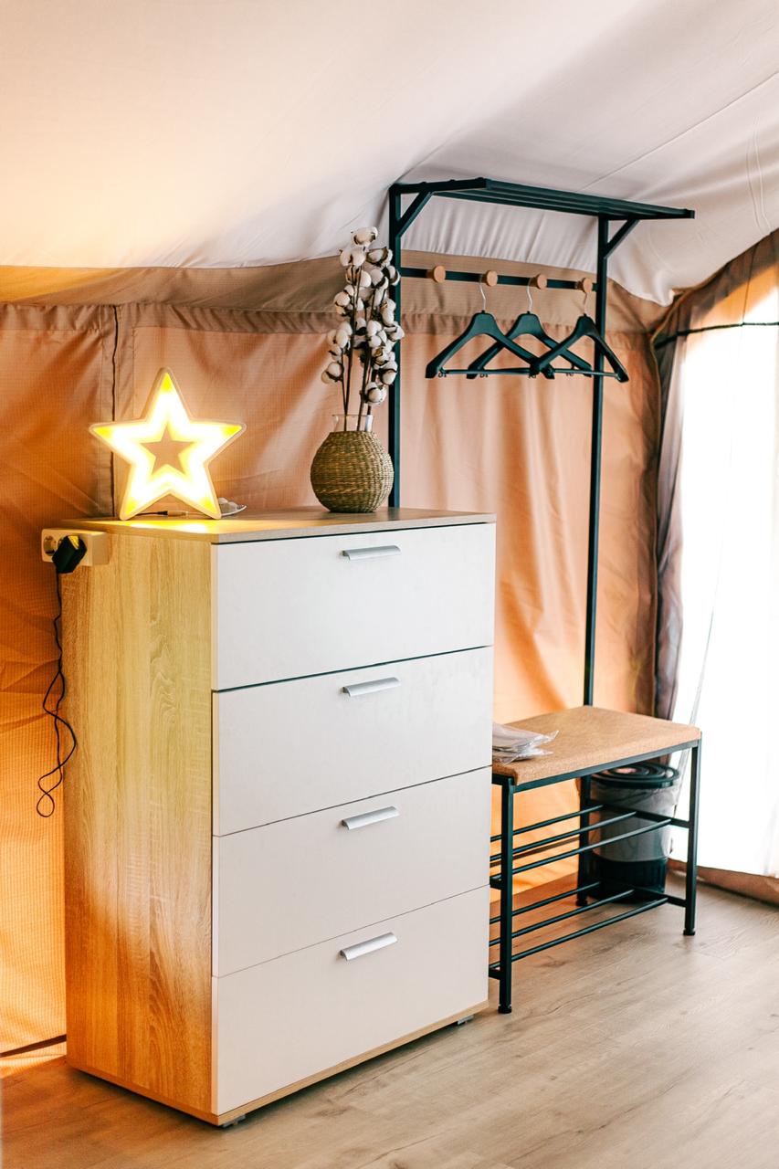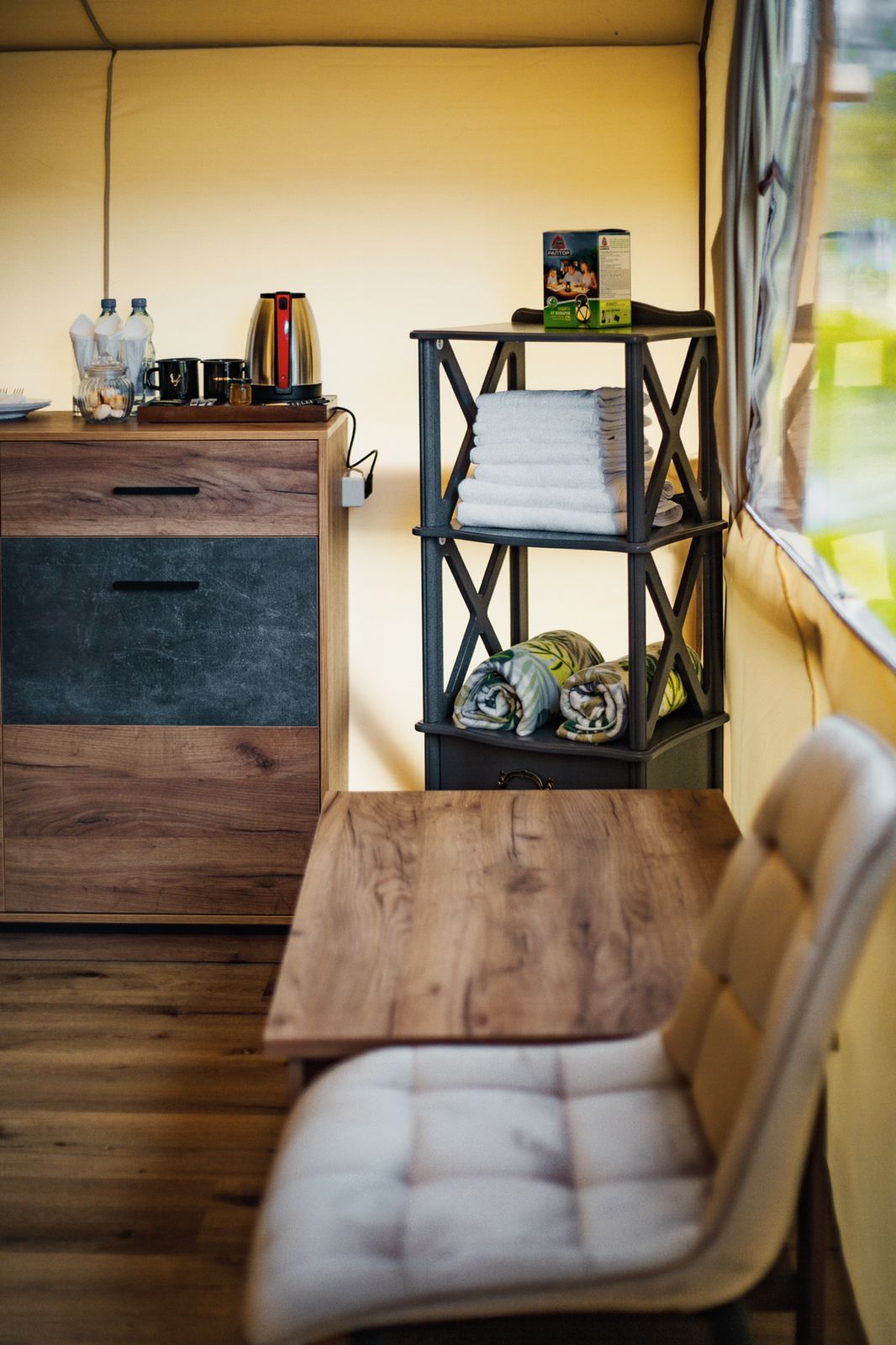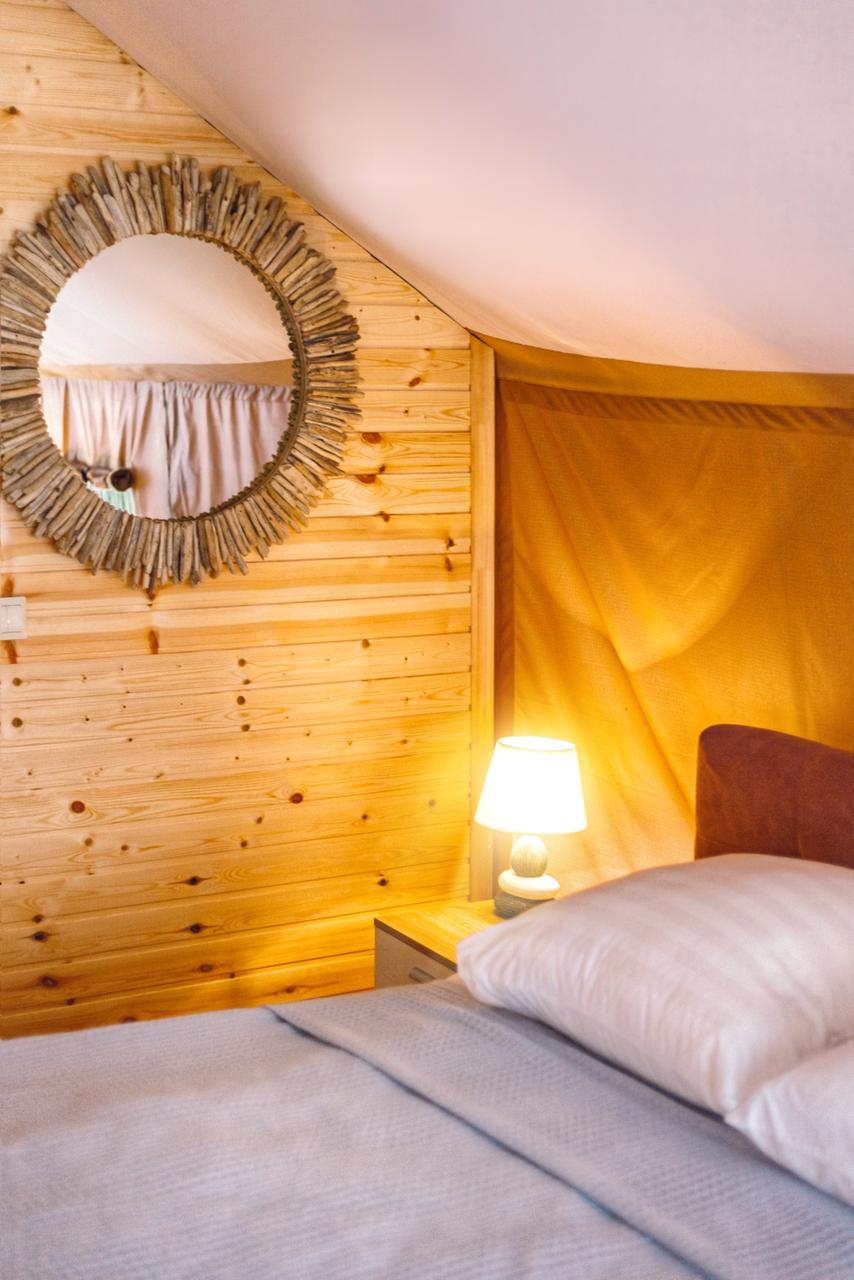 В палатке «Солнечный домик» - круглая кровать, прикроватные тумбочки, 2 столика, стулья, вешалка. Разумеется, чайная станция, пледы и средства от комаров.