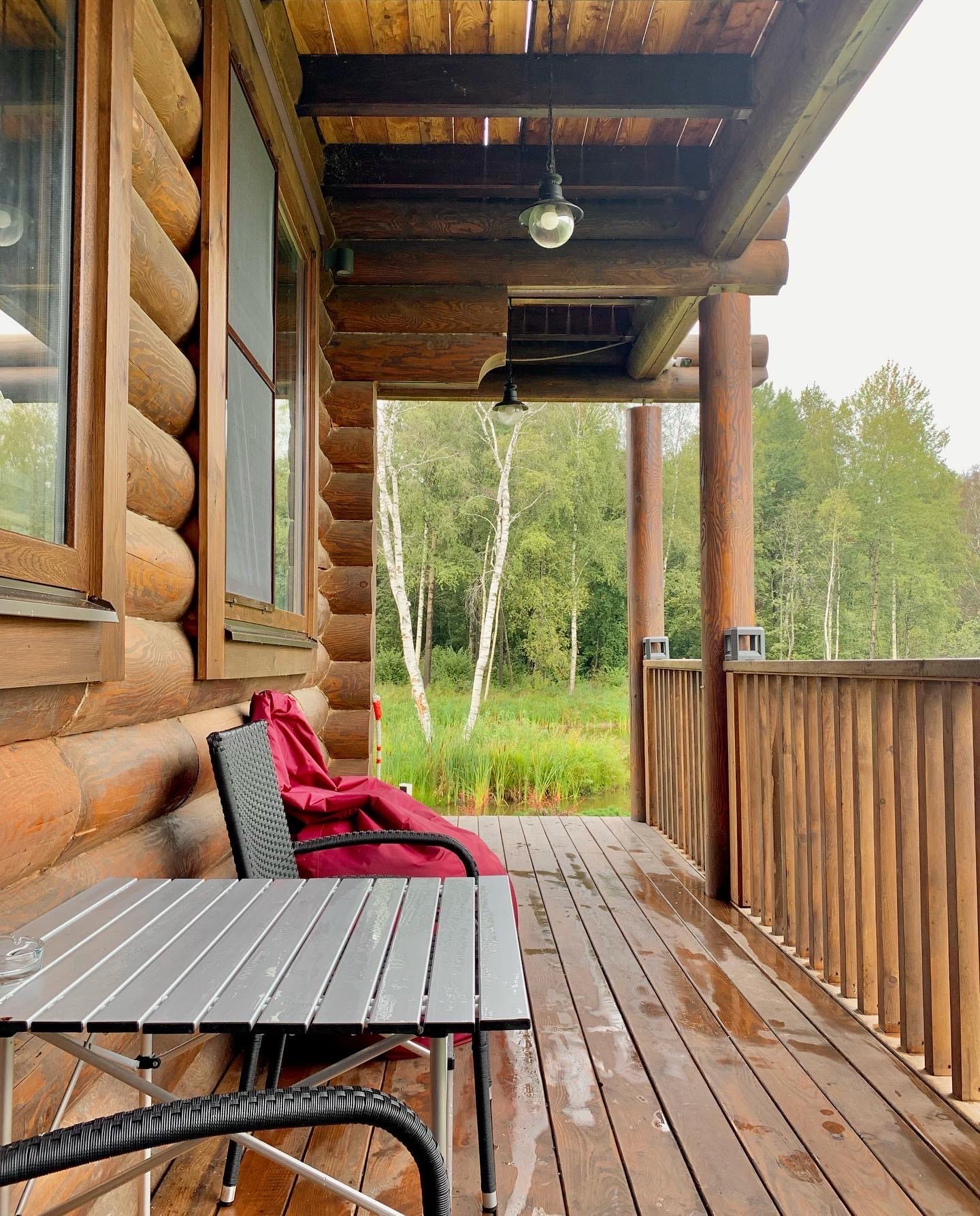 На уютной веранде (она, кстати, закрывается на случай холодной погоды) - шезлонги и столик, возле бунгало висит гамак и установлен мангал.