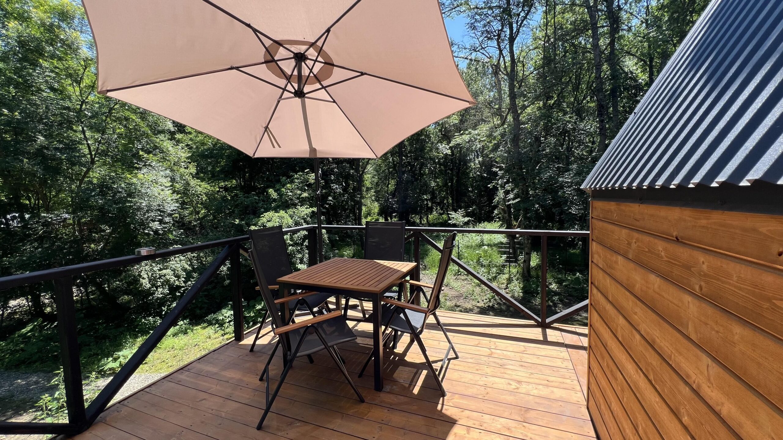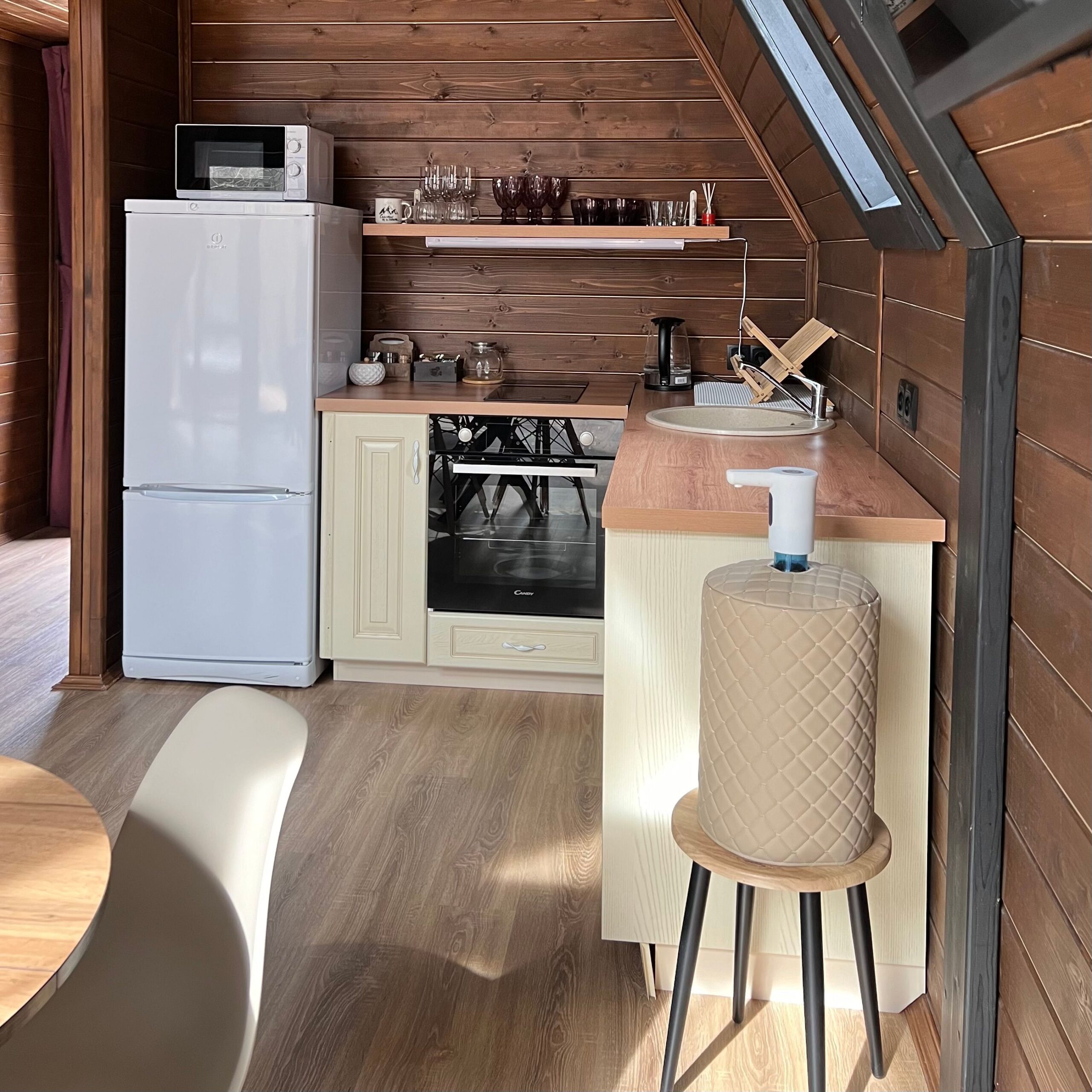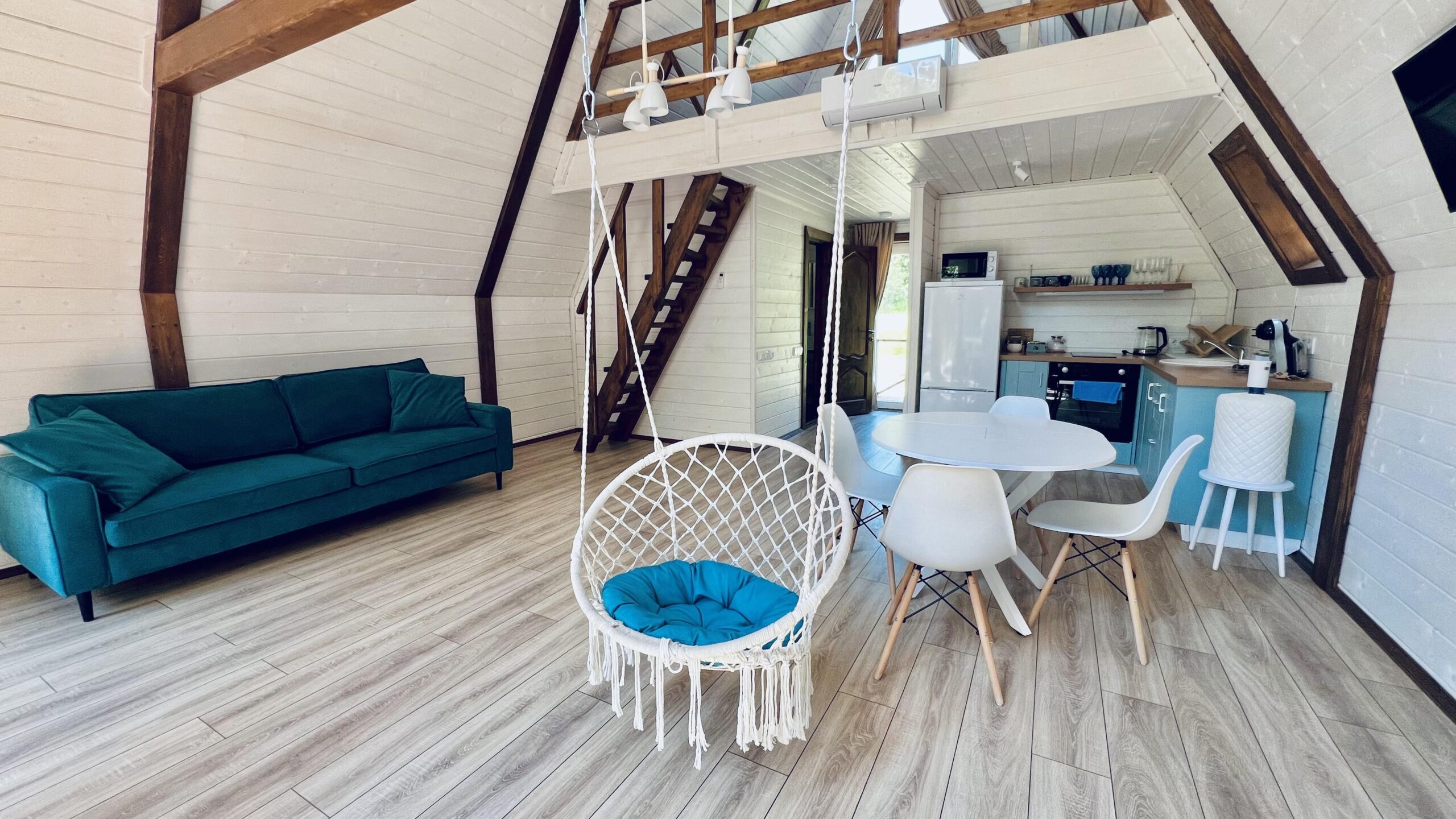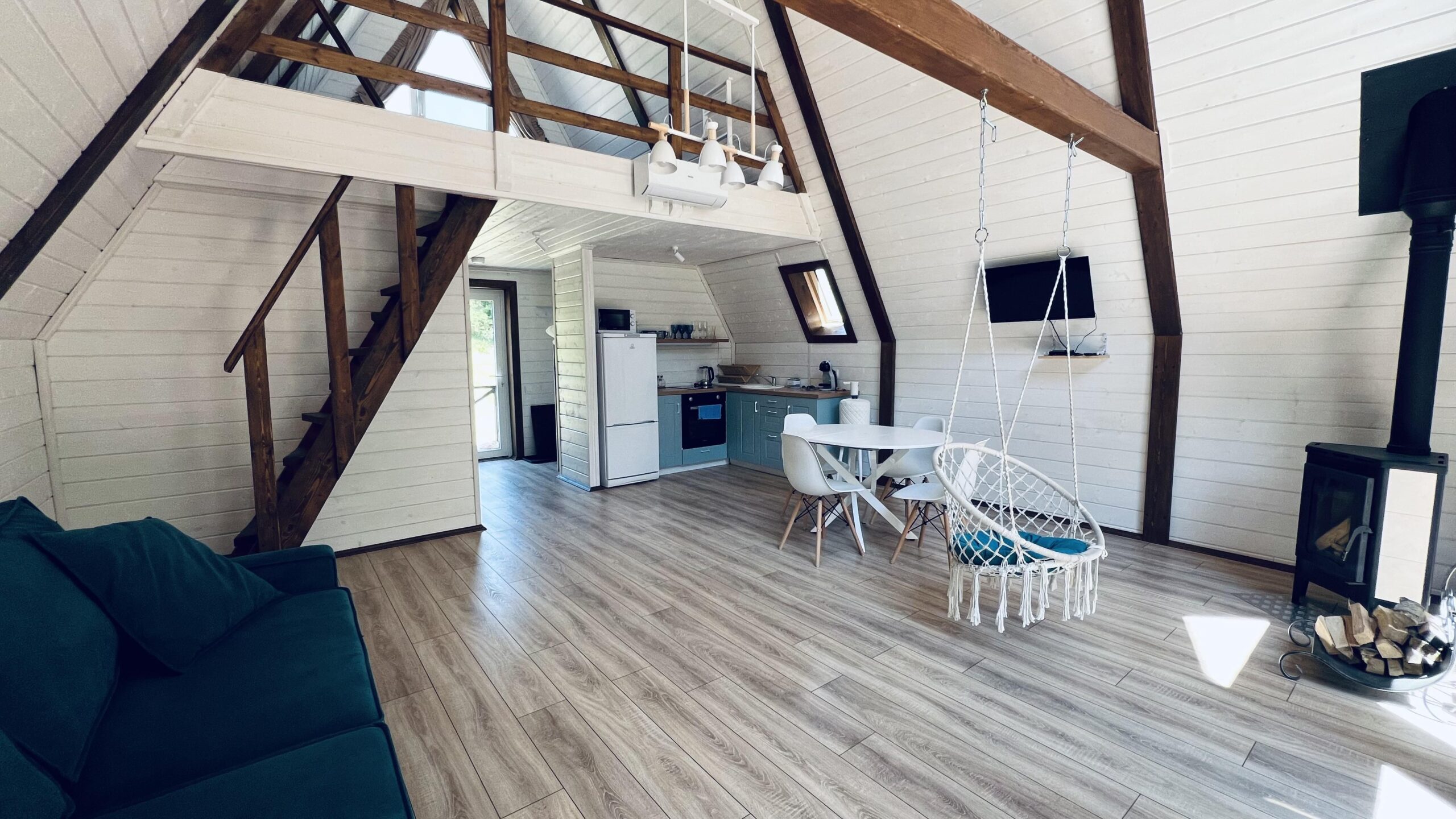 Для проживания доступны три стильных треугольных домика. У каждого номера индивидуальный дизайн: «Море», «Лес», «Пещера». Все а-фреймы и баня имеют панорамный вид на дикий лес, террасу, уличную купель джакузи с подогревом и индивидуальную зону гриль.