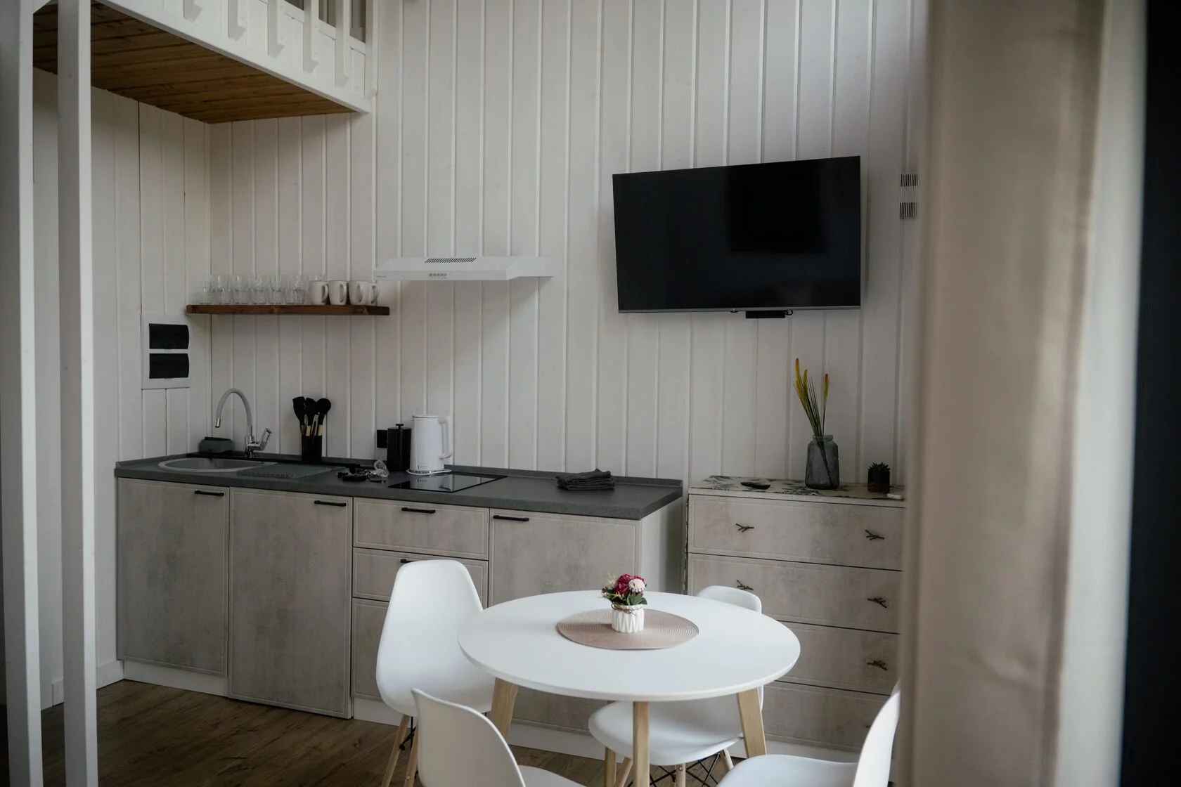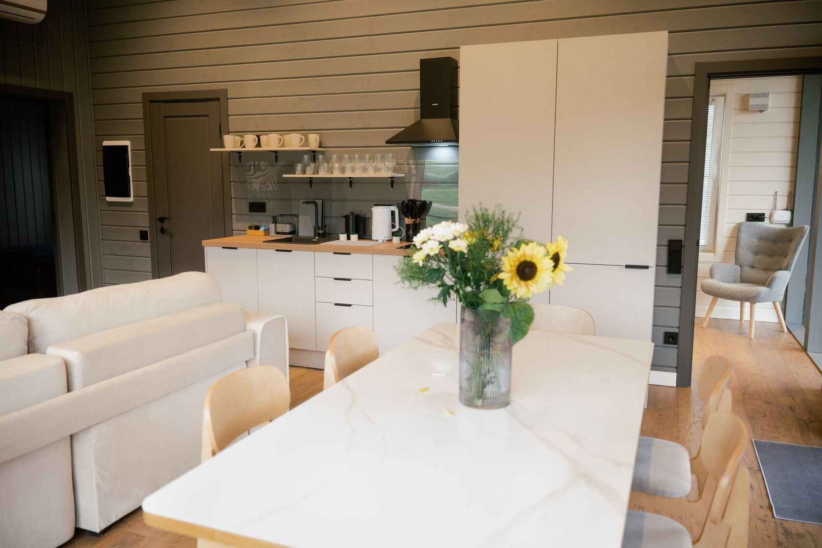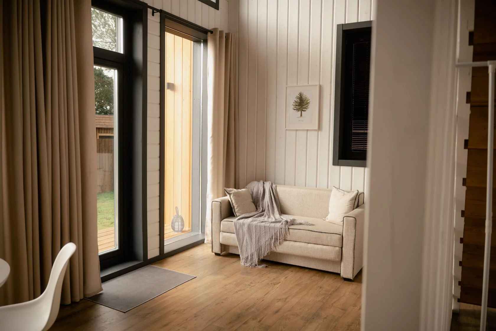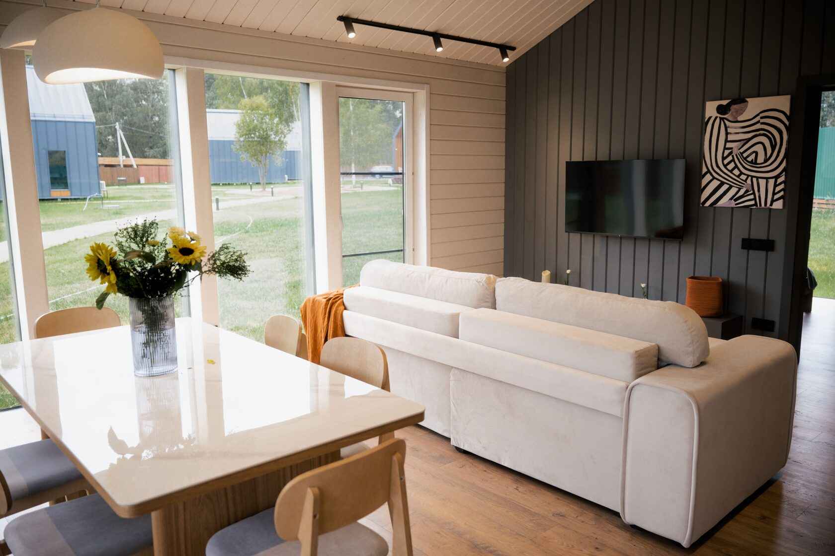 Для проживания гостей глэмпинга Хвоя доступны четыре стильных домика в стиле барнхаус с панорамными окнами и приватной зоной для уединенного отдыха. Внутри удобные кровати, собственная ванная комната, отопление и все необходимые удобства. Из каждого домика открывается вид на лес, который позволяет наслаждаться чистым воздухом круглый год. Из развлечений доступны велопрогулки, SUP-борды, а также шикарный банный комплекс с баней, купелью и травяным чаем.