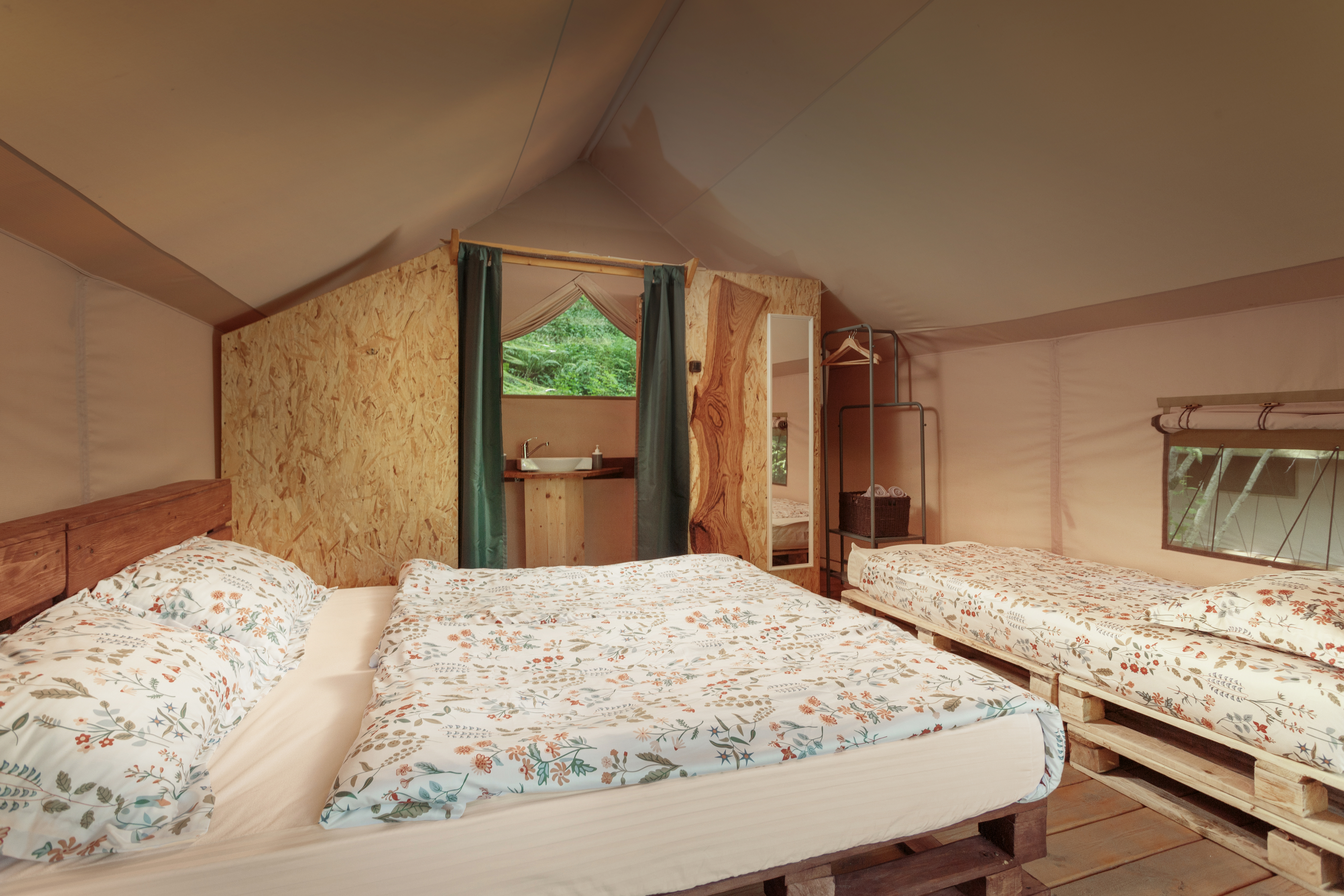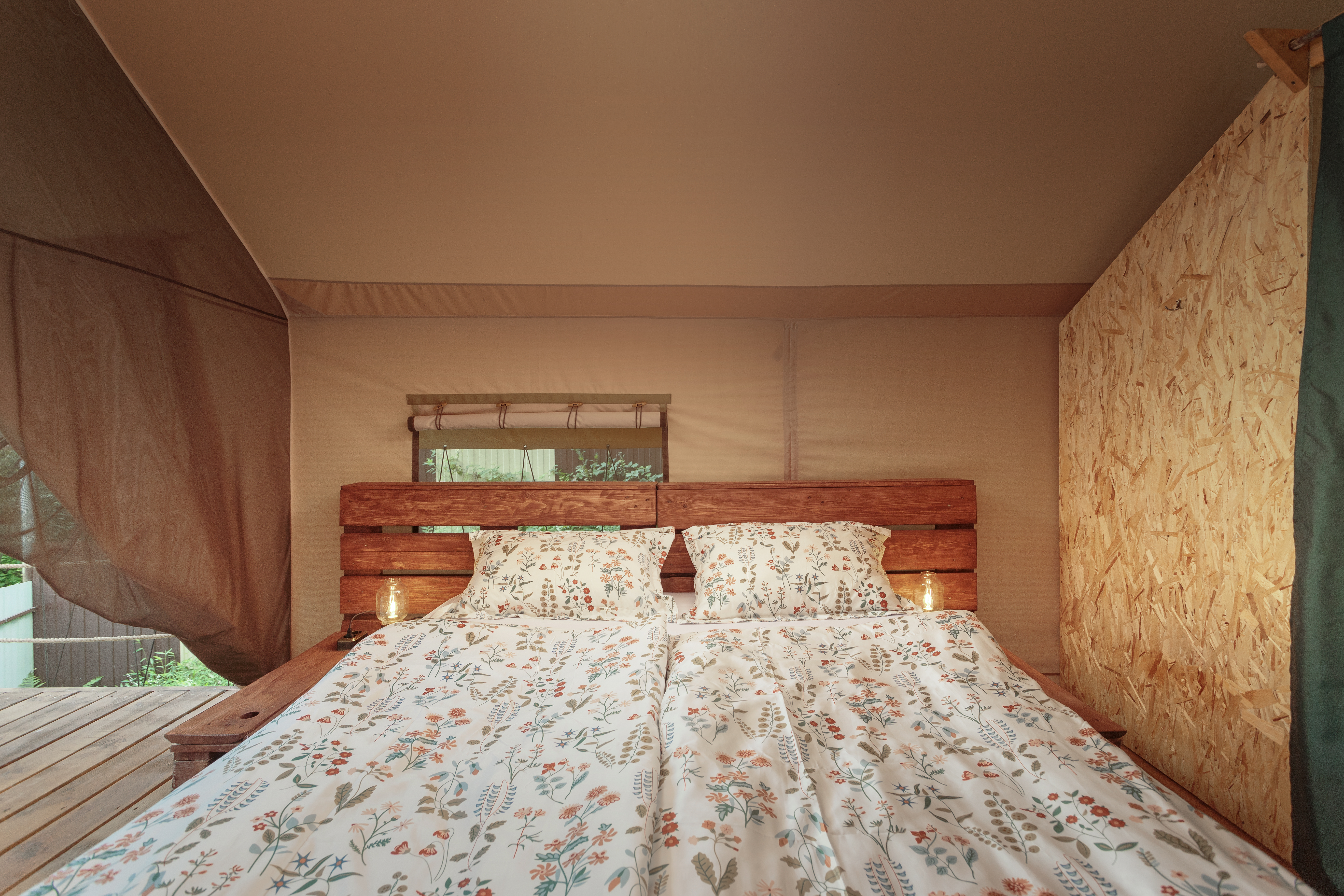 Оснащение каждого тент хауса: двуспальная кровать king size, прикроватные тумбы, ночные лампы, зеркало, вентилятор.