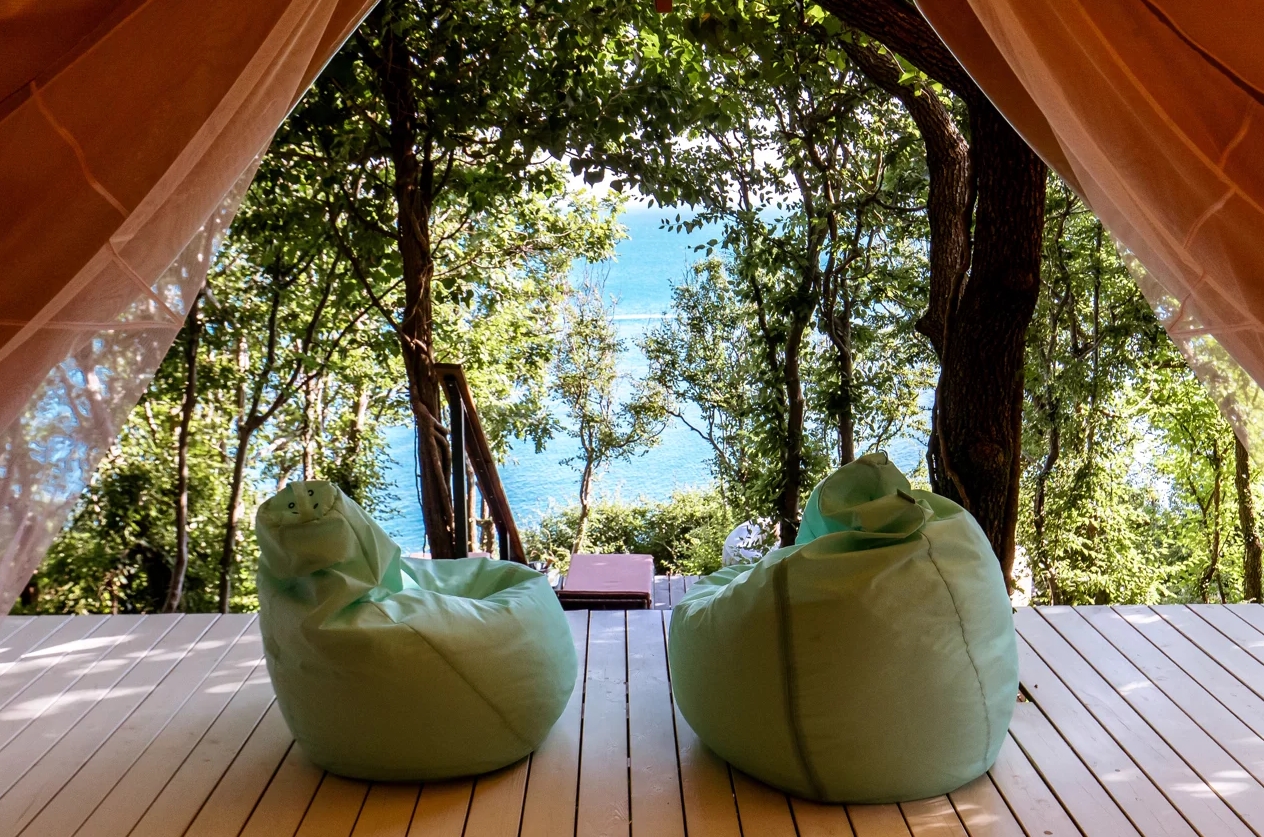 Каждый шатёр оснащен собственной террасой, с бассейном-джакузи и шезлонгами, откуда открывается великолепный вид на лазурное море и Прохоровский пляж.