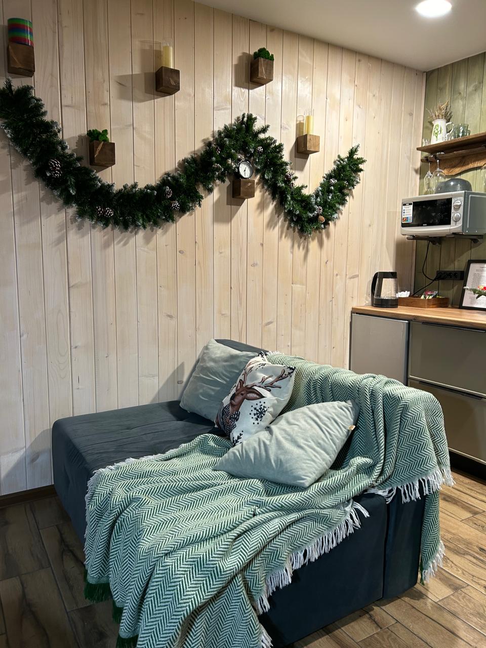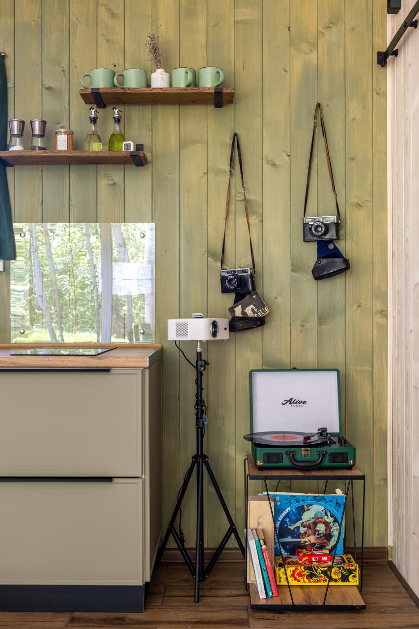 - Кухня гостиная с раскладным диваном, проектором, кондиционером и виниловым проигрывателем.