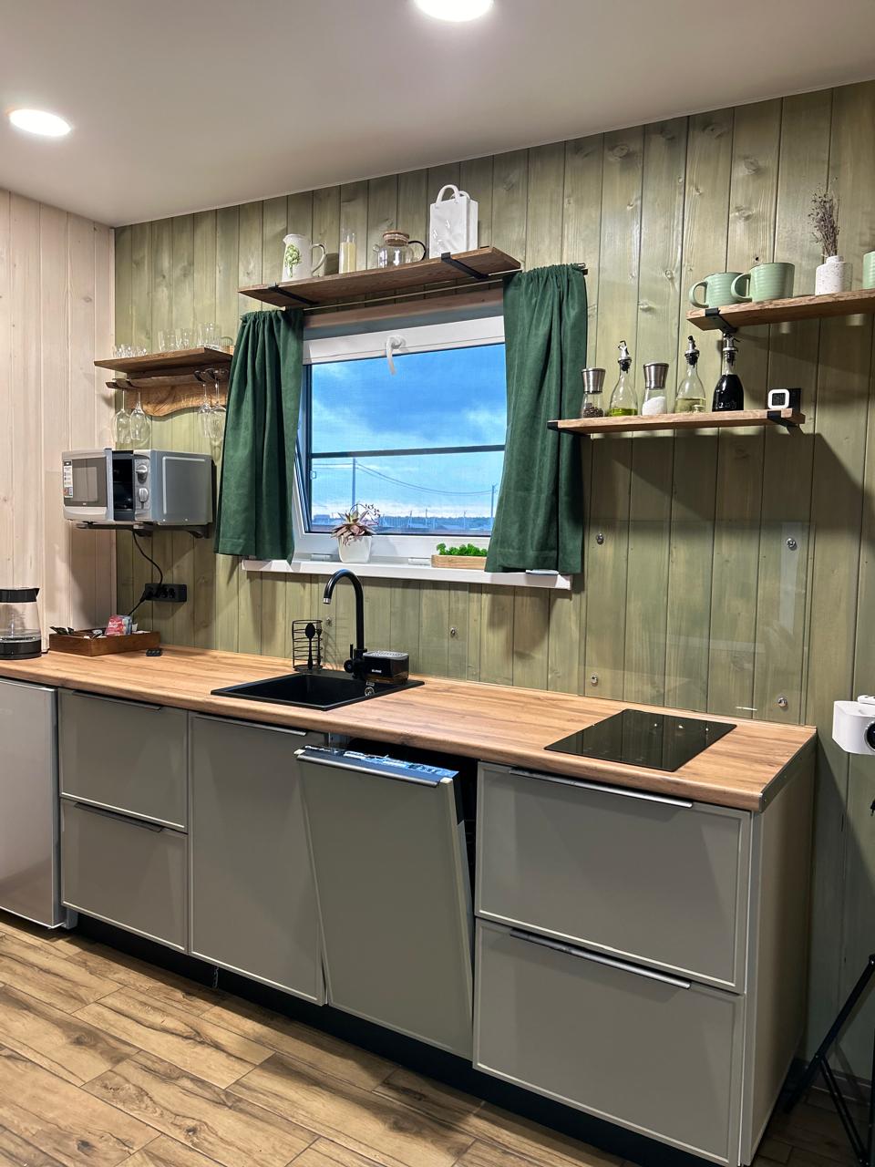 - Укомплектованная кухня с посудомоечной машиной, варочной индукционной панелью, микроволновкой и всей необходимой посудой.