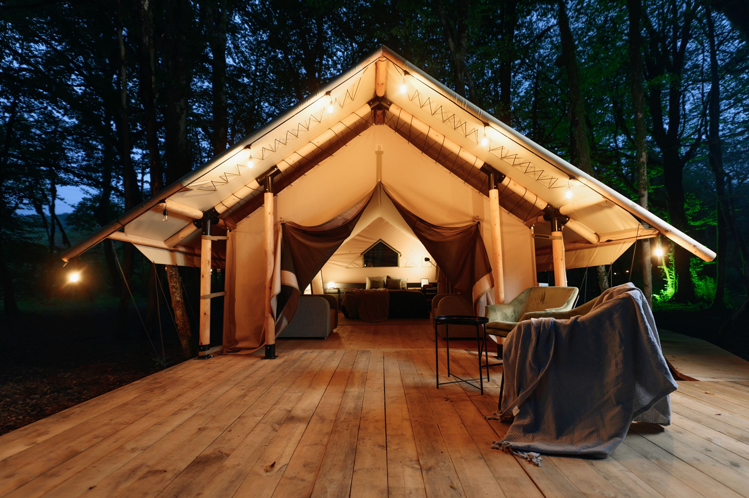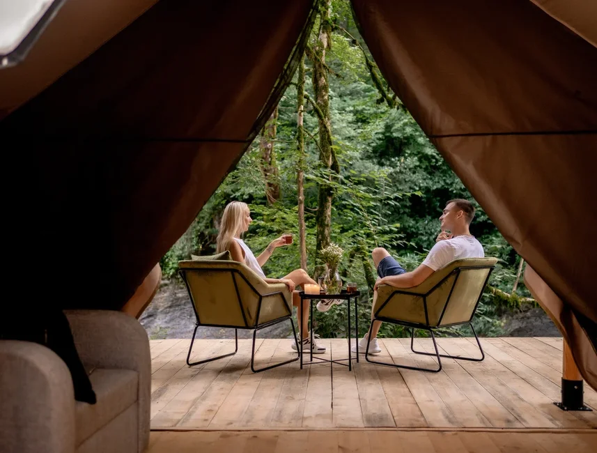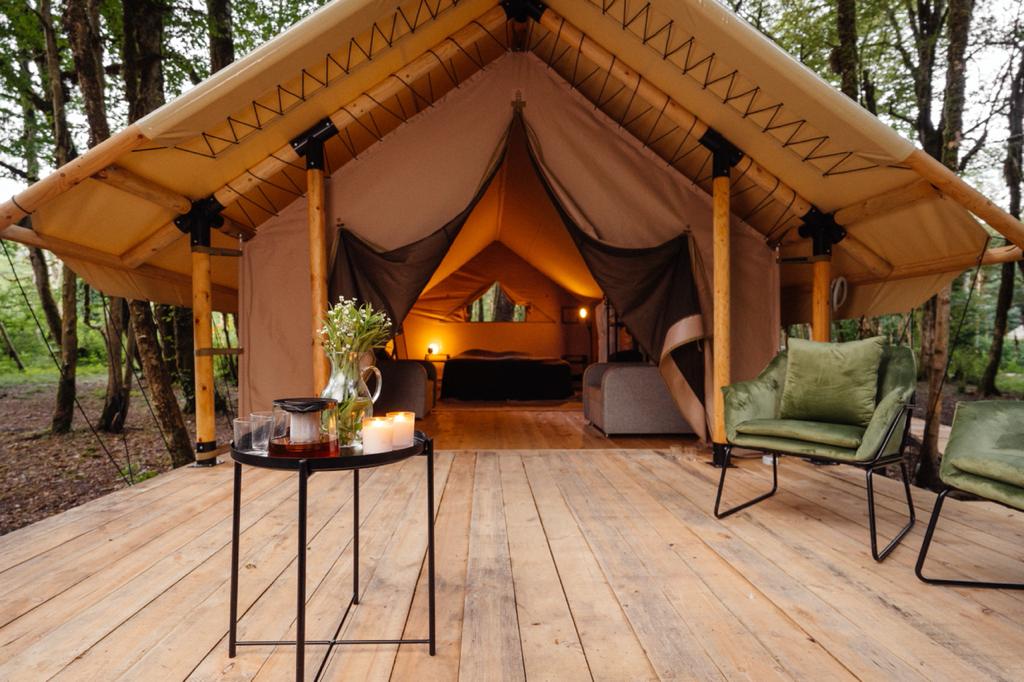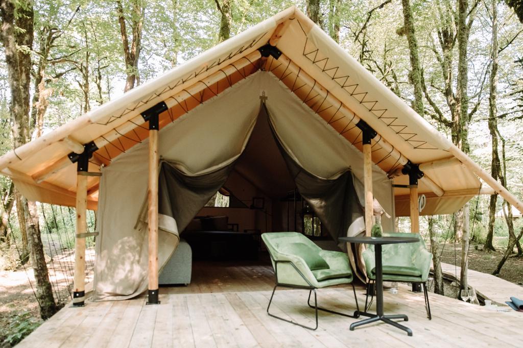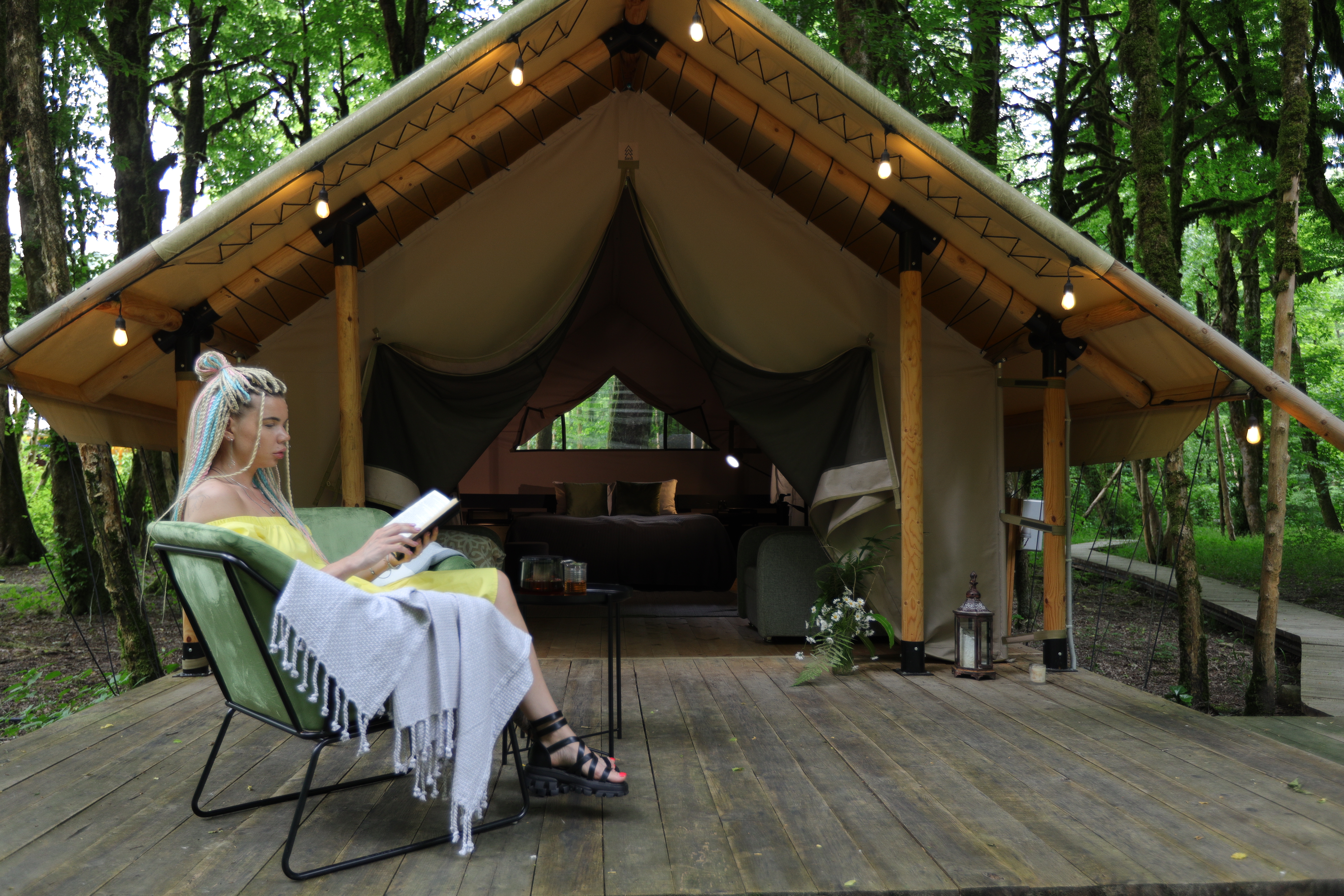 Здесь гостиничные номера находятся в комфортных сафари-тентах. В номерах тепло и уютно: двуспальные кровати, гардеробная зона, освещение, электричество и WiFi. Индивидуальные террасы с незабываемым видом на лес или горную реку.
