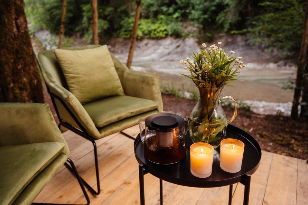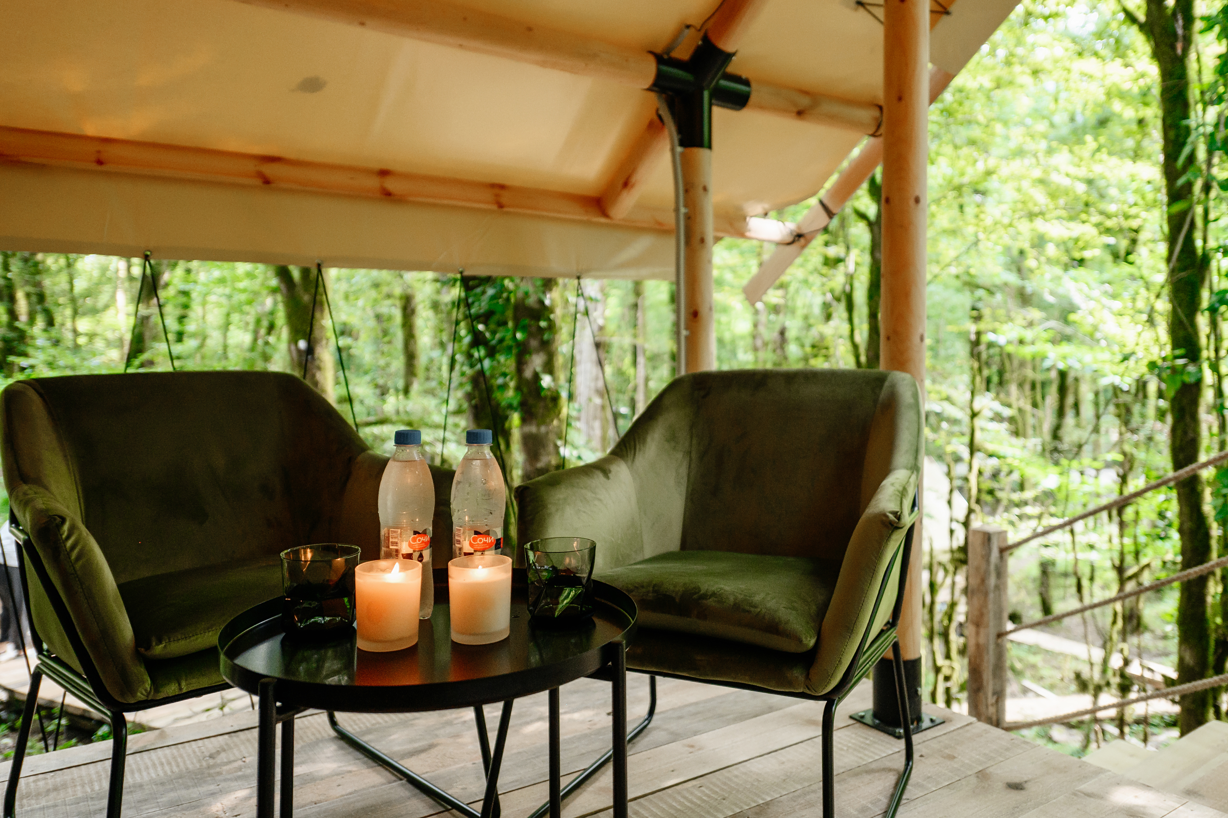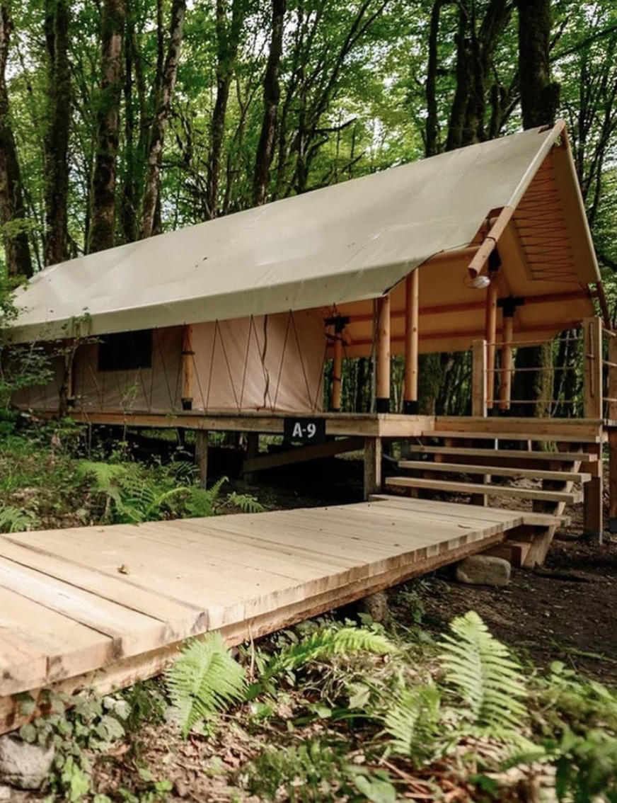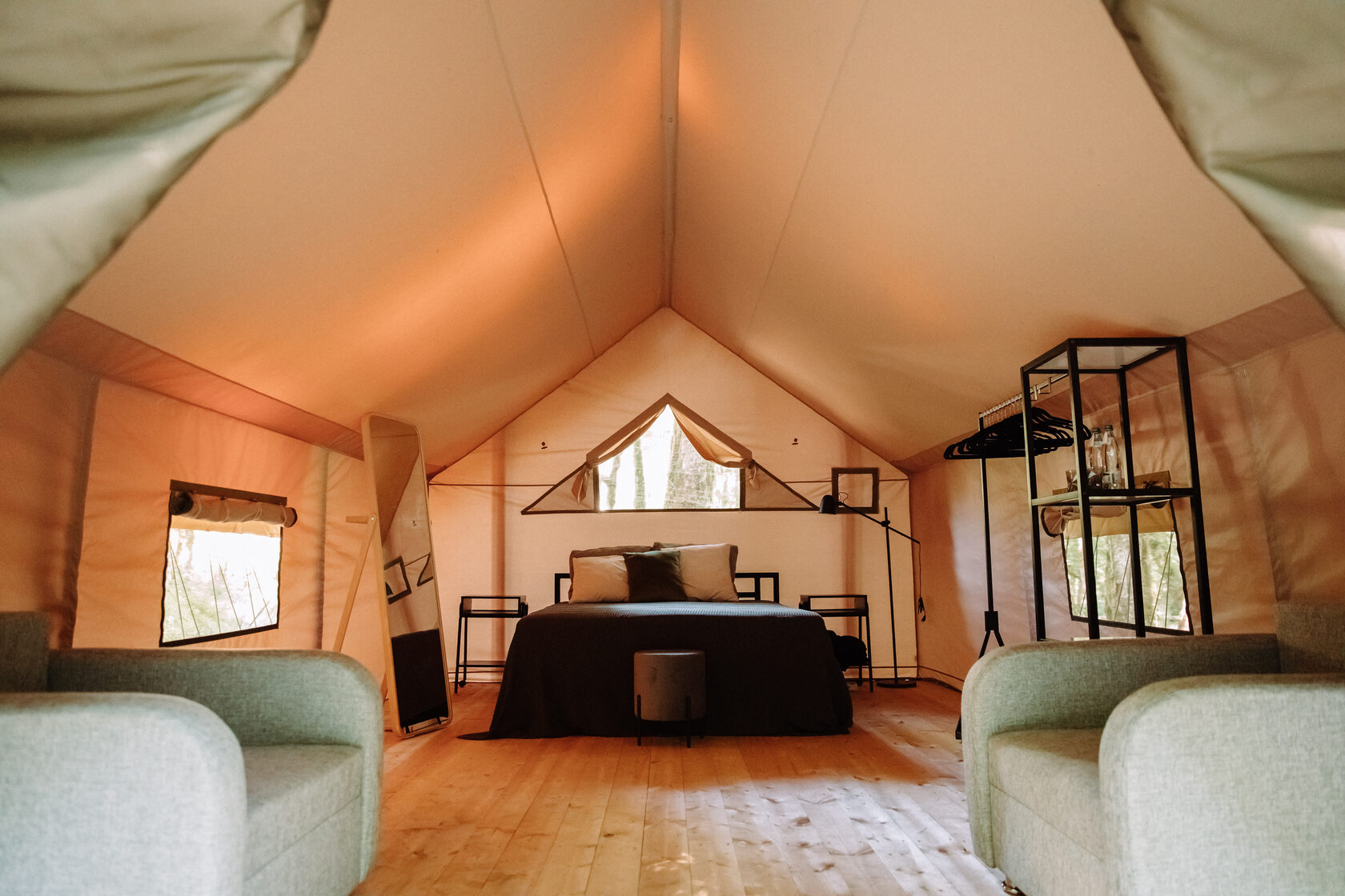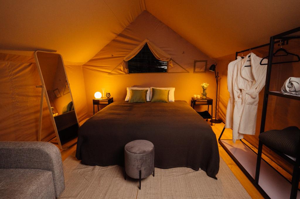 Здесь гостиничные номера находятся в комфортных сафари-тентах. В номерах тепло и уютно: двуспальные кровати, гардеробная зона, освещение, электричество и WiFi. Индивидуальные террасы с незабываемым видом на лес или горную реку.