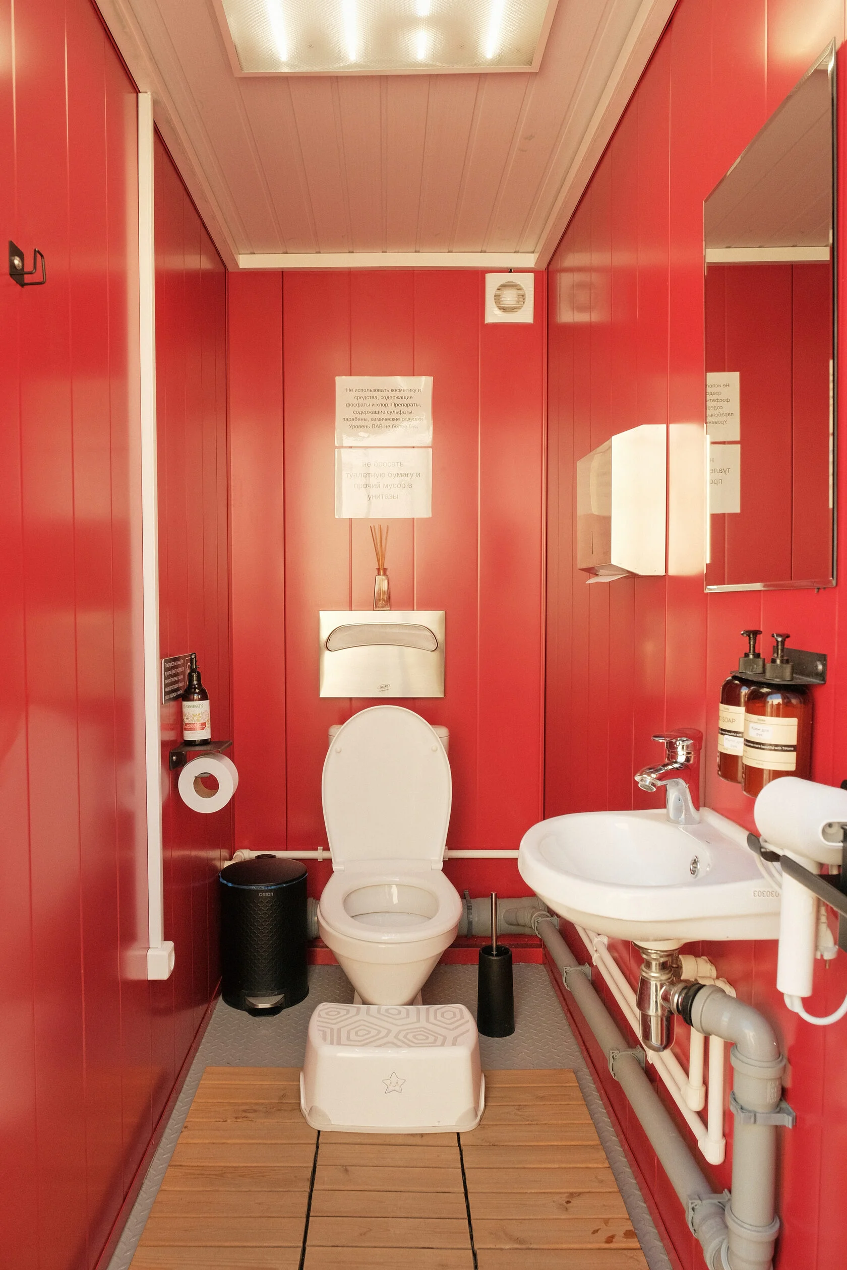 На территории находится 4 обогреваемых душевых и 4 туалетных комнат всего в нескольких метрах от кафе-бистро. Горячая вода в доступе всегда, эко-косметика в каждой кабинке (мыло, крем для рук, гель для тела, шампунь и бальзам для волос, фены, зеркала, а также махровые белоснежные полотенца для лица и тела.)
