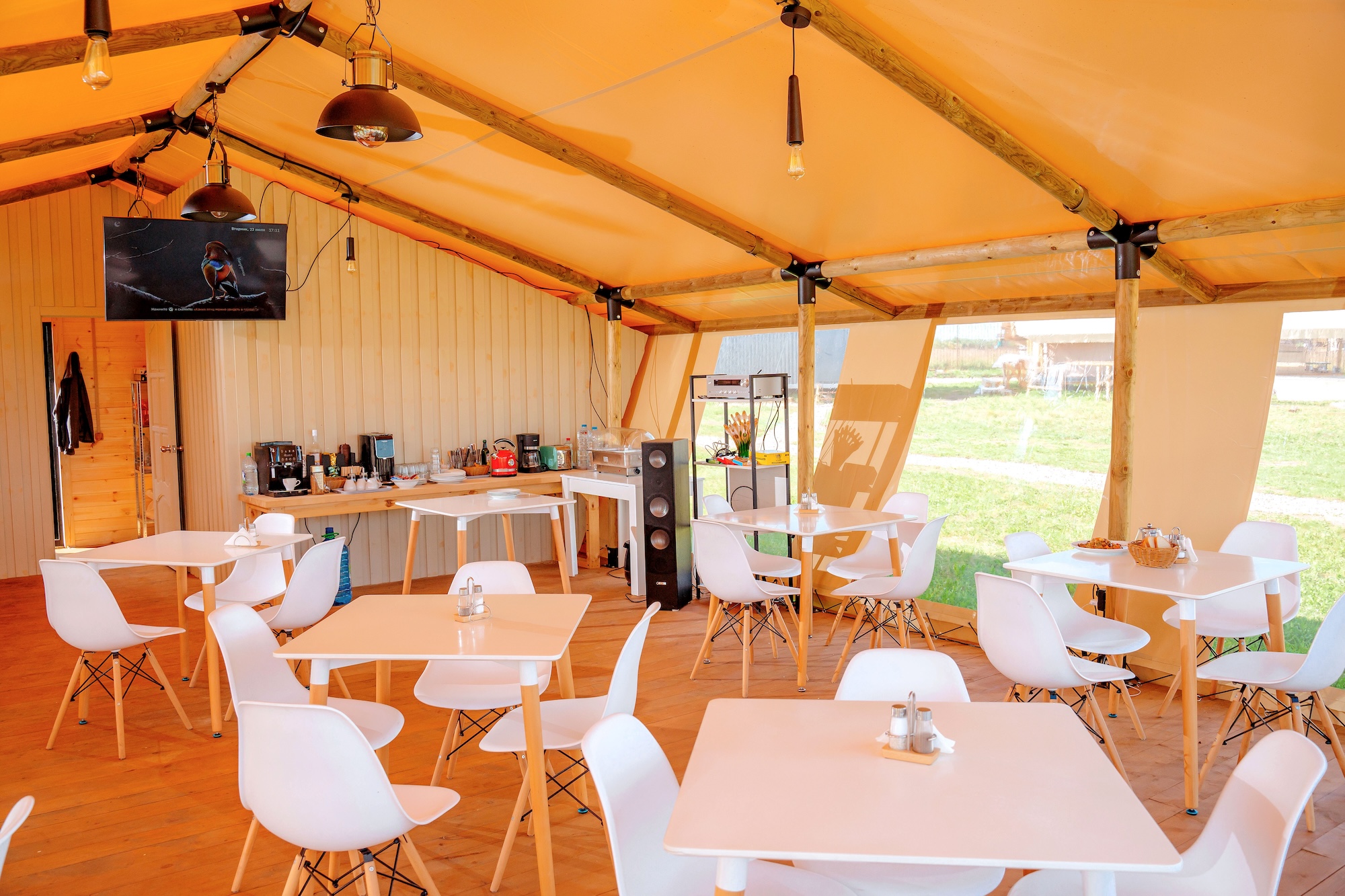 На охраняемой территории глэмпинга на 6 га расположены 12 комфортабельных, благоустроенных сафари-тентов, а также вся инфраструктура, необходимая для яркого и незабываемого отдыха на природе с семьей или друзьями. 2х- и 4х-местные сафари-тенты с удобствами, посудой, мебелью и даже собственной террасой с мини-огородом.