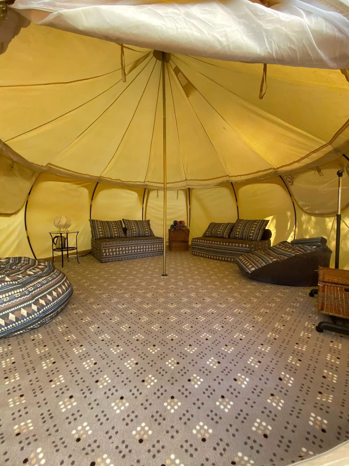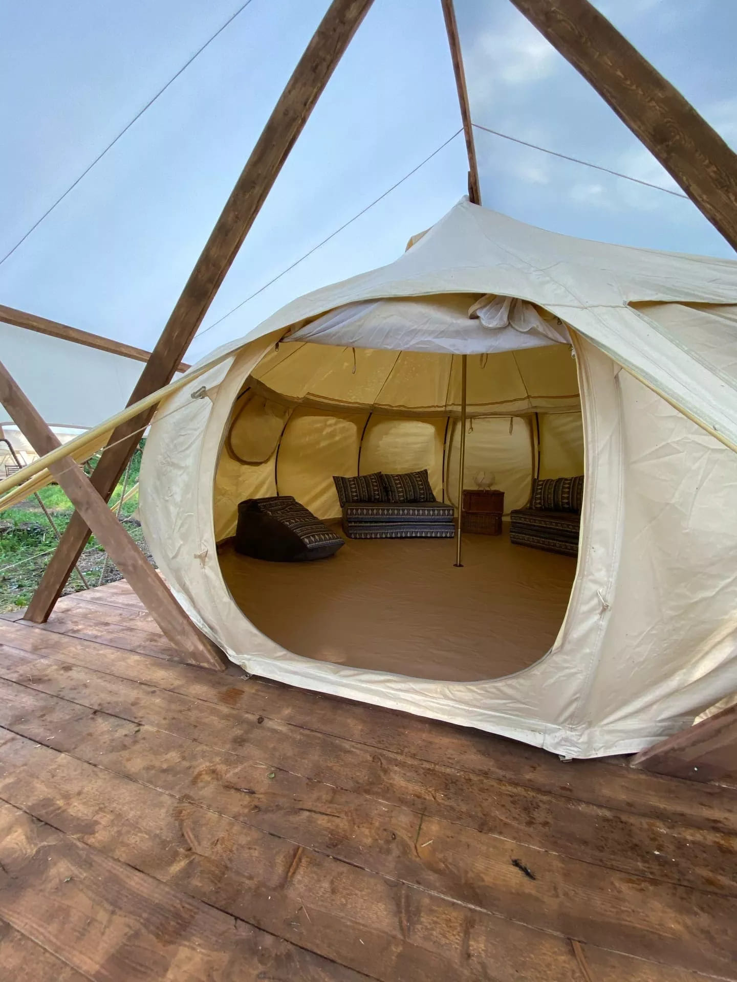 Уютные шатры типа Белл-тент под навесом. На территории вокруг шатра находятся большой стол, костровая зона, гамаки, качели.