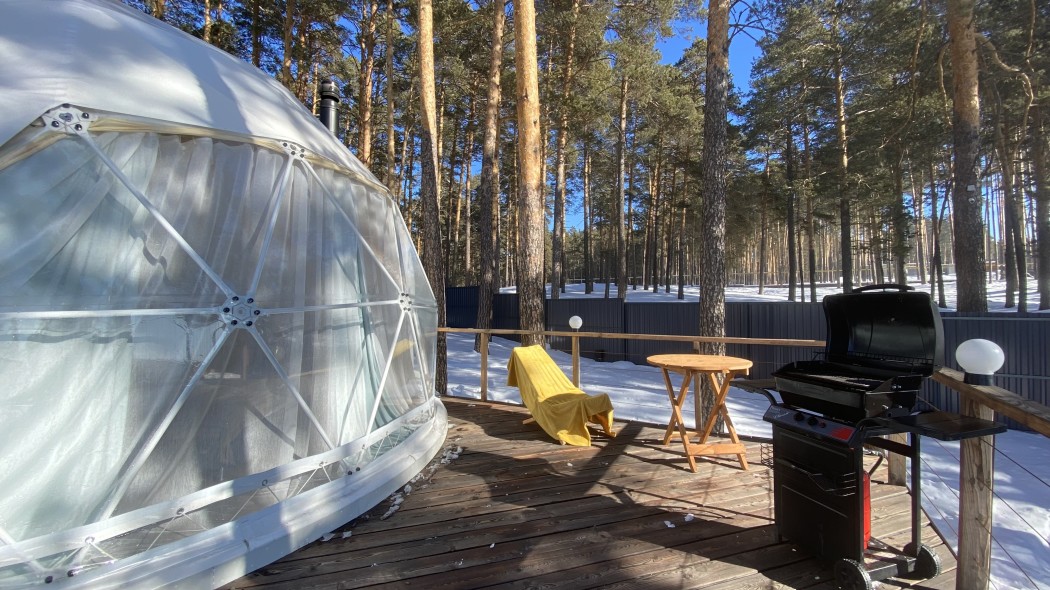 - Терраса из натуральной лиственницы, лаунж зона, мангальная зона и детская площадка на территории Глэмпинг парка!