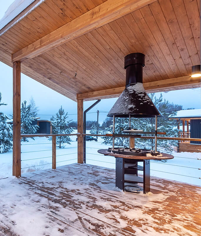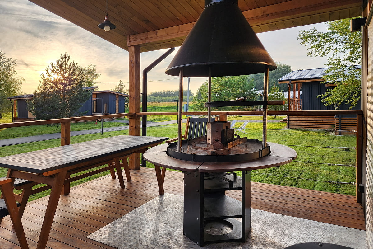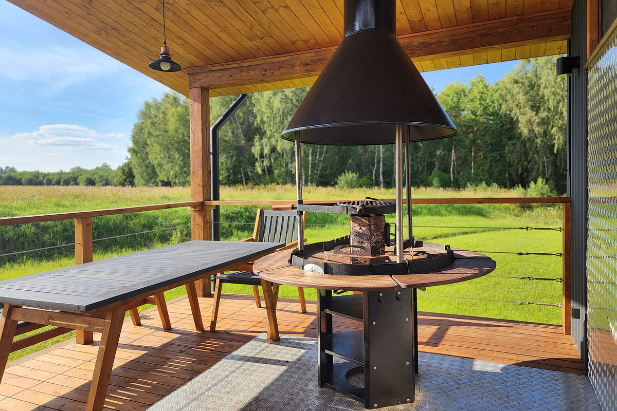 - На террасе уличный стол с двумя креслами и скамейкой, финский дровяной гриль с шампурами и решеткой