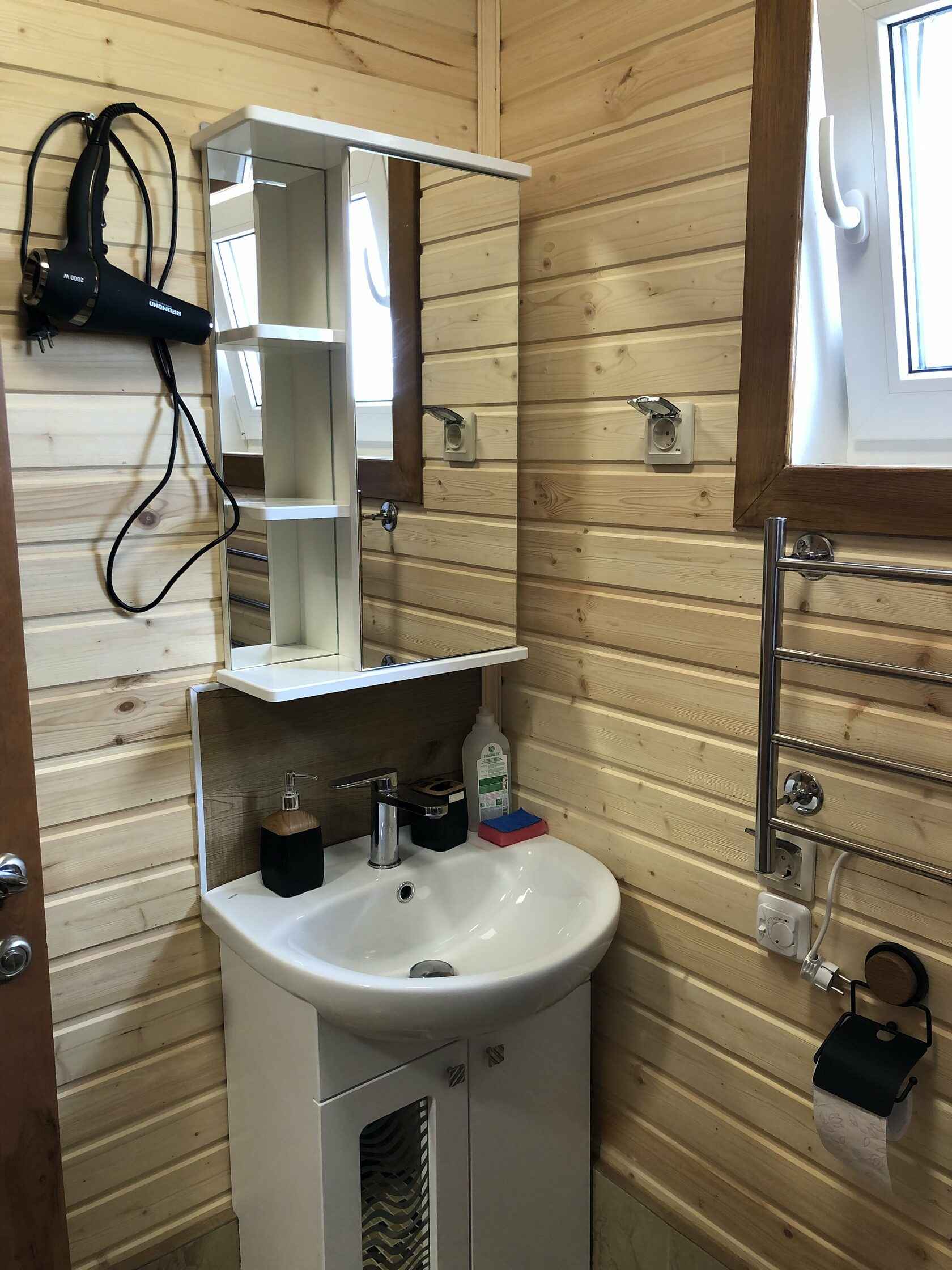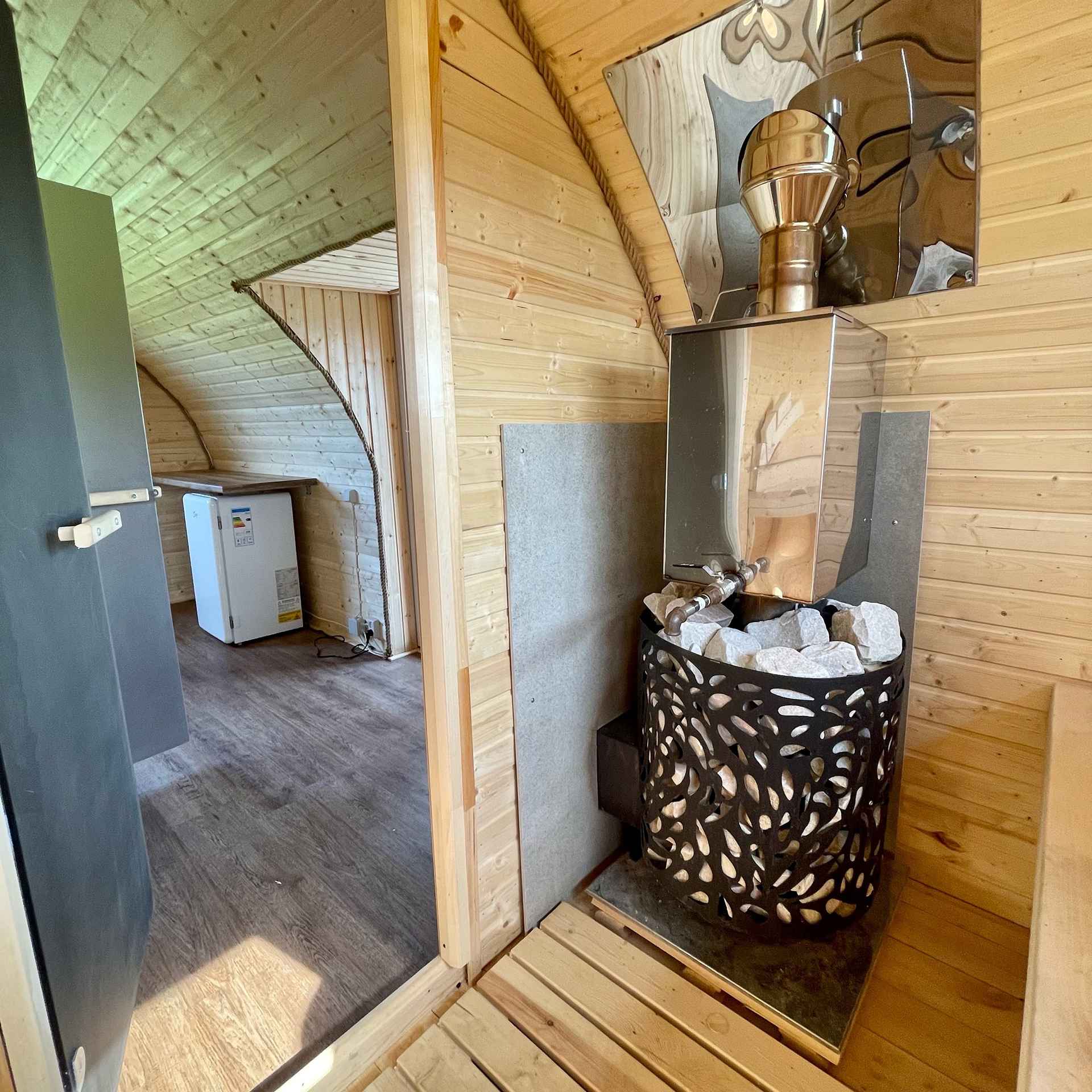 Баня с подогреваемым чаном: большая парная, уборная с душем и ведром для обливания, стол и скамейки для комфортного отдыха внутри, холодильник.