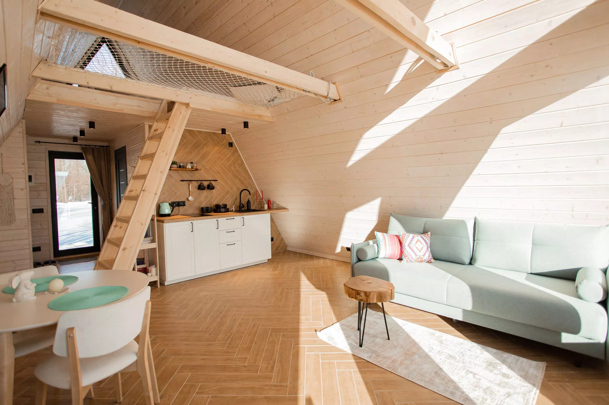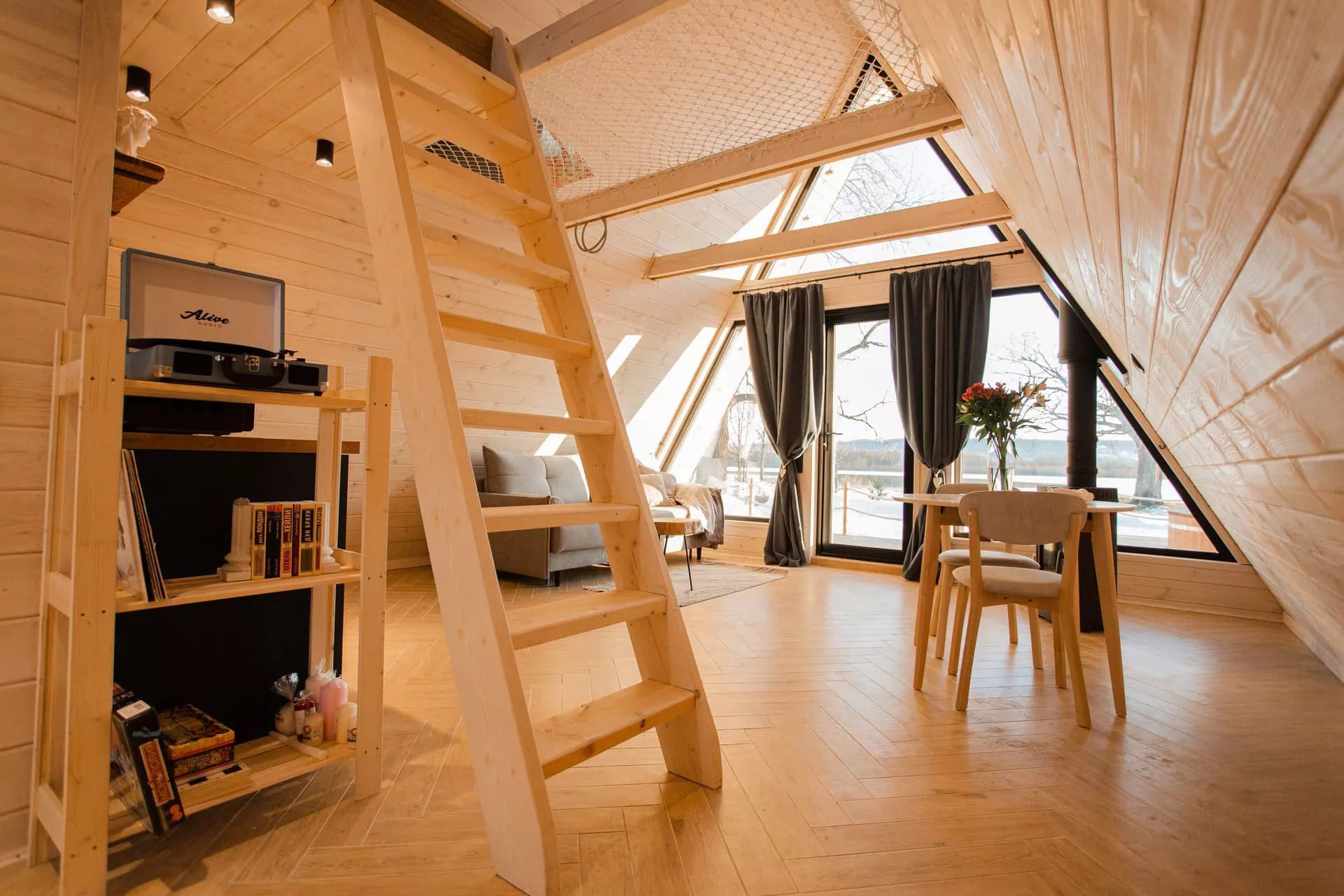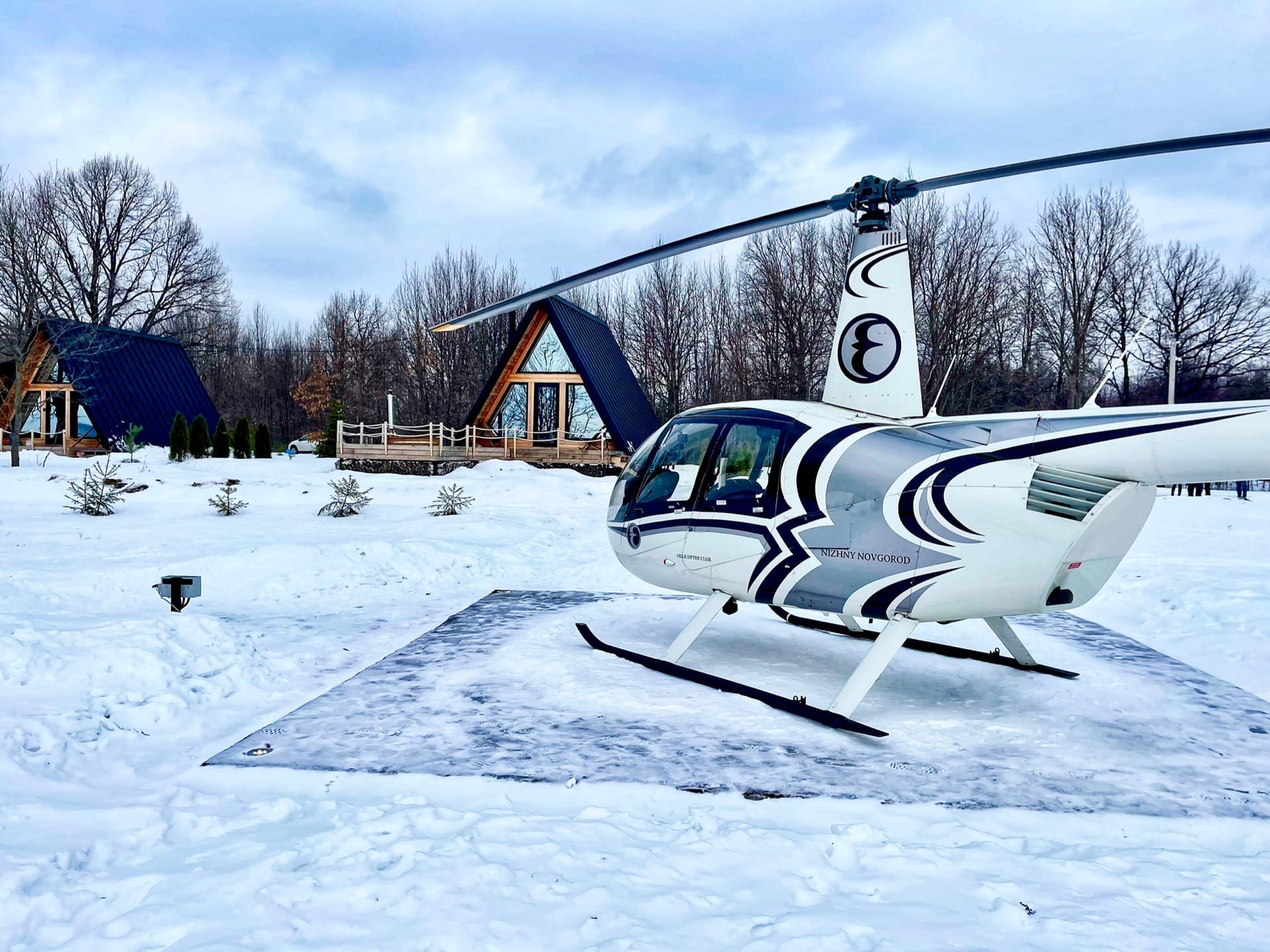 Глэмпинг Ривер в Нижнем Новгороде включает в себя 4 А-фрейм домика, выполненные из экологичных материалов.