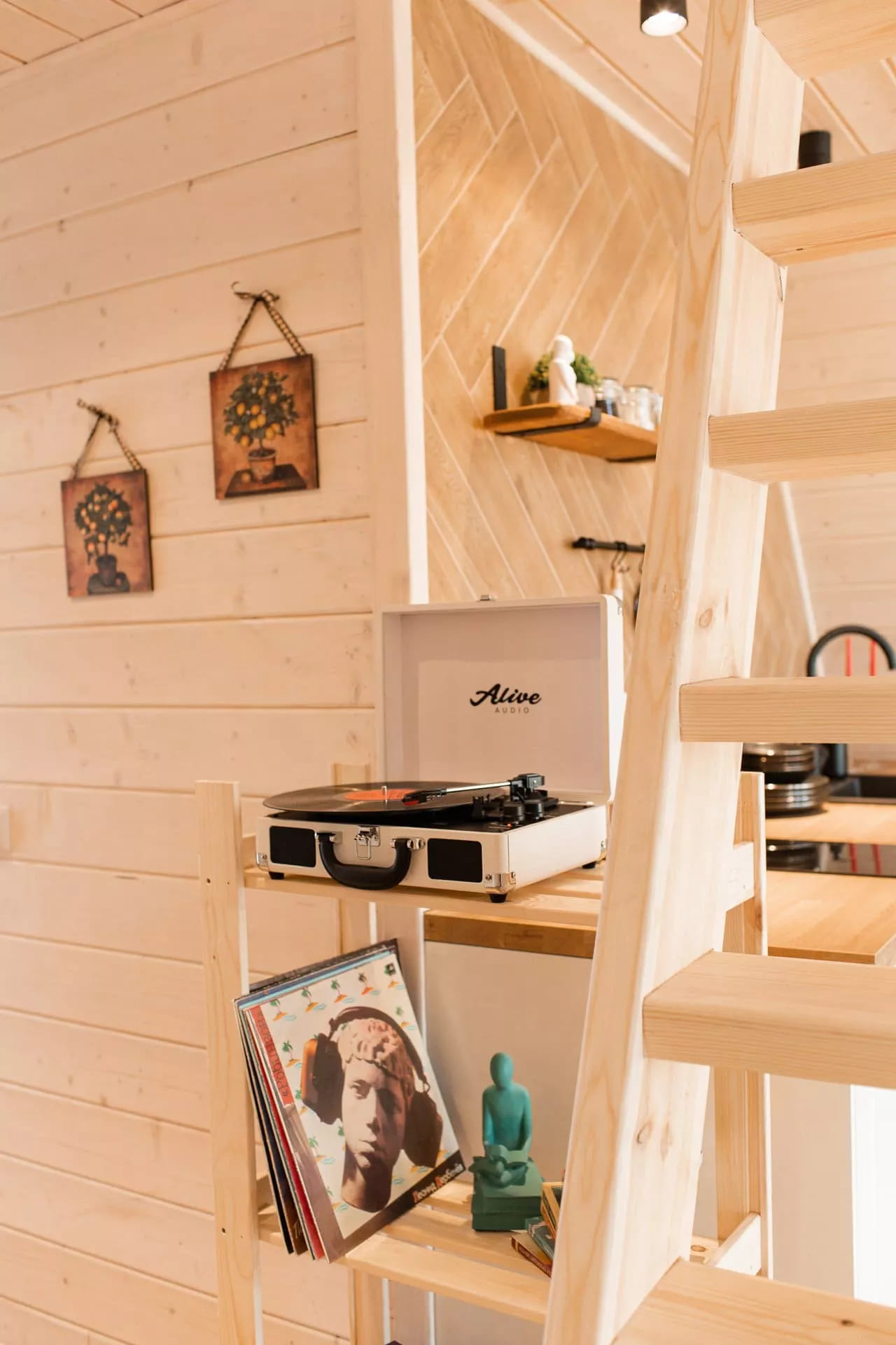 - Уютная зона с диваном, книгами, виниловым проигрывателем и игровой приставкой
