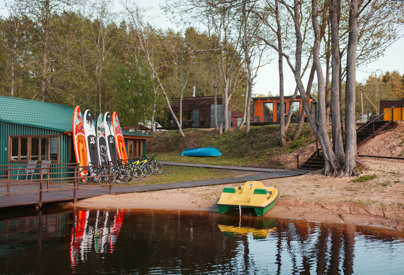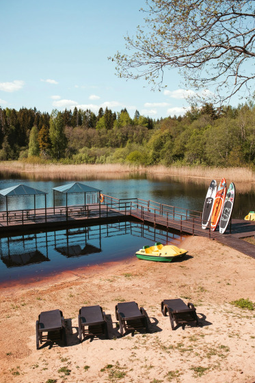 На территории есть свой собственный песчаный пляж, понтон для рыбалки, русская баня, собственный прокат лодок, катамаранов, сап бордов, велосипедов, сигвеев. Имеется своя собственная рыбная ферма, где выращивается форель и осётр.