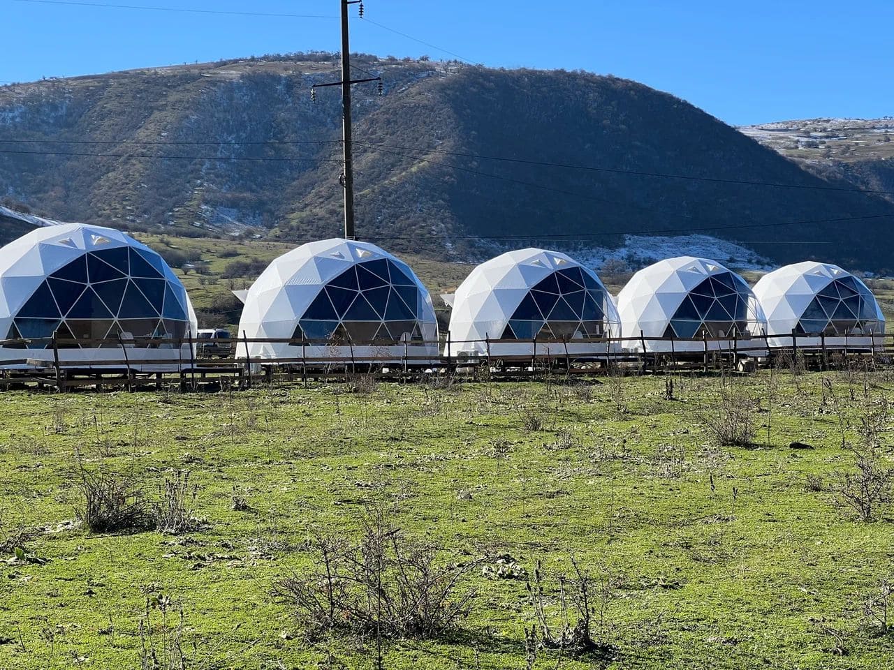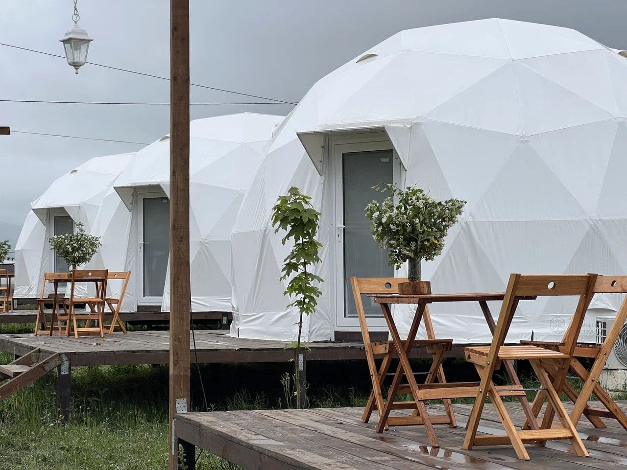 Глэмпинг Утро в горах состоит из уютных домиков в виде купола, каждый из которых оснащен всем необходимым для комфортного проживания.