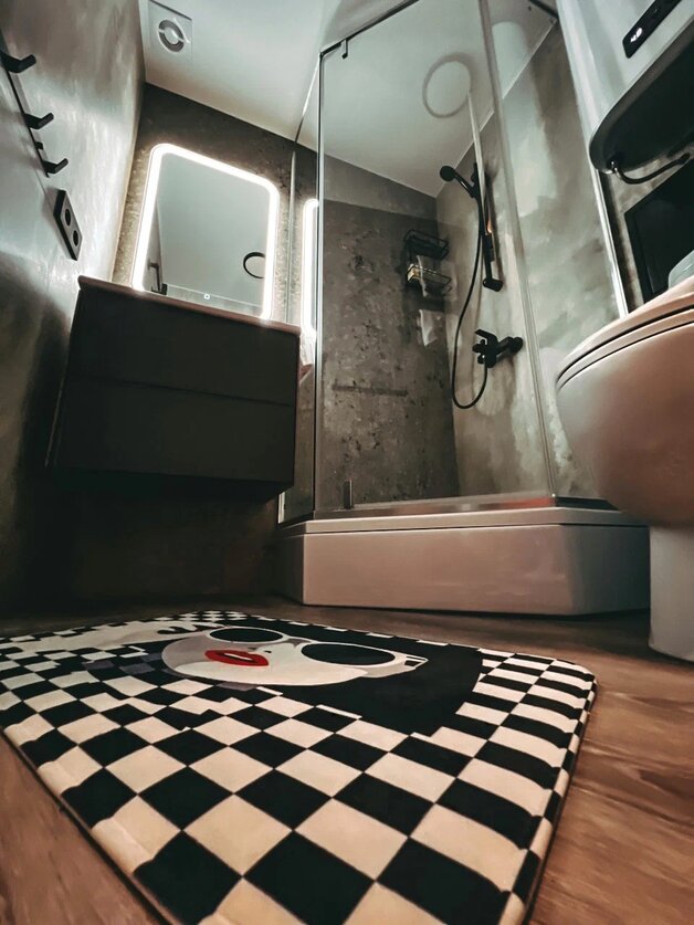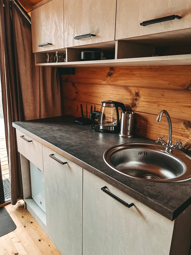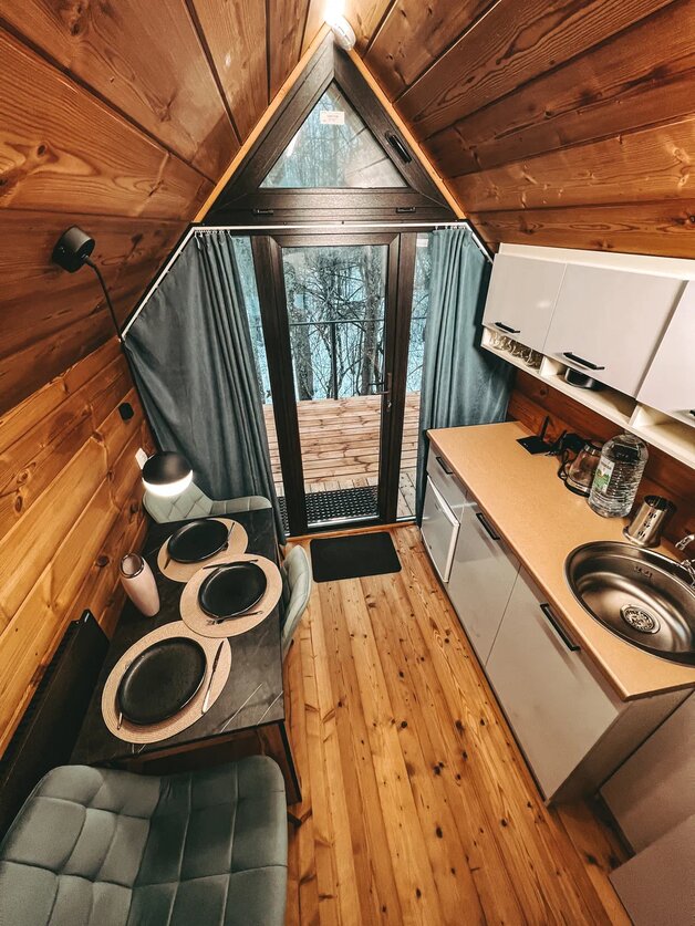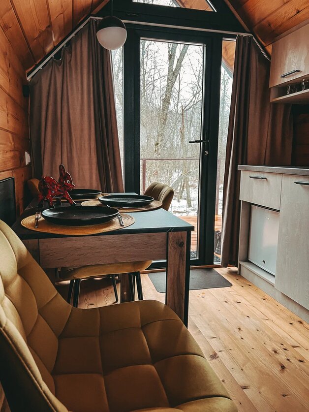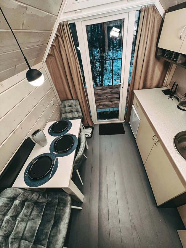 В домике предусмотрена мини-кухня, обеденный/рабочий стол и компактный санузел с душем. Максимально продуманный и эргономичный интерьер, естественная циркуляция воздуха. Природные фактуры и натуральные цвета в отделке. Кровать у самого окна с видом на лес.