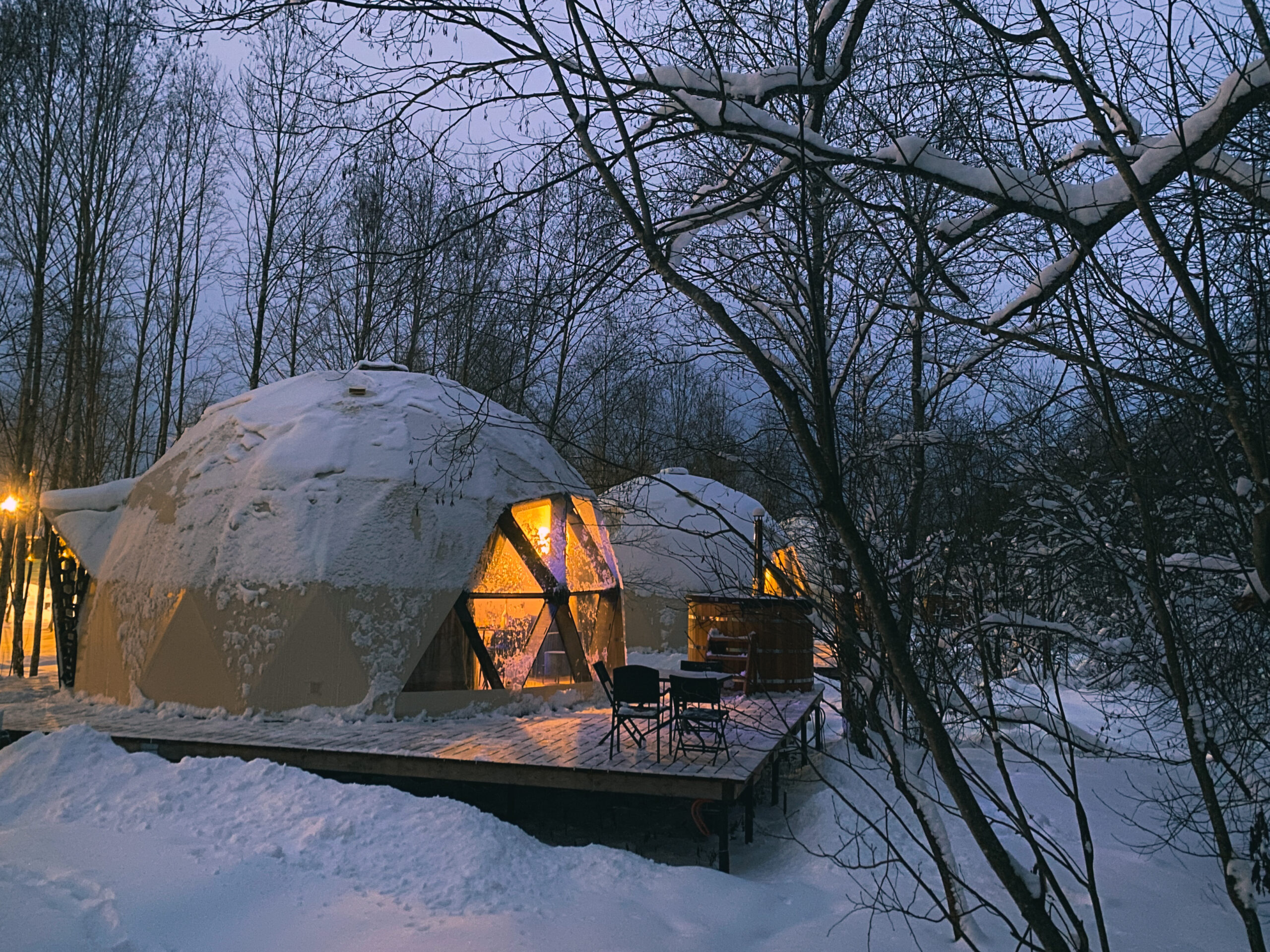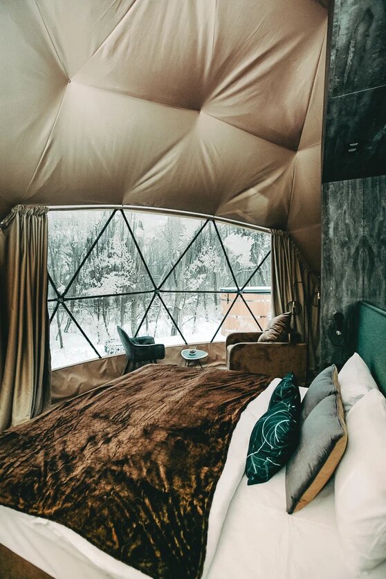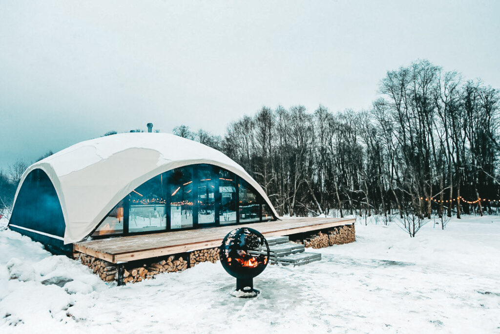 Круглогодичный геокупол с панорамным окном, через которое открывается чудесный вид на густой лес.