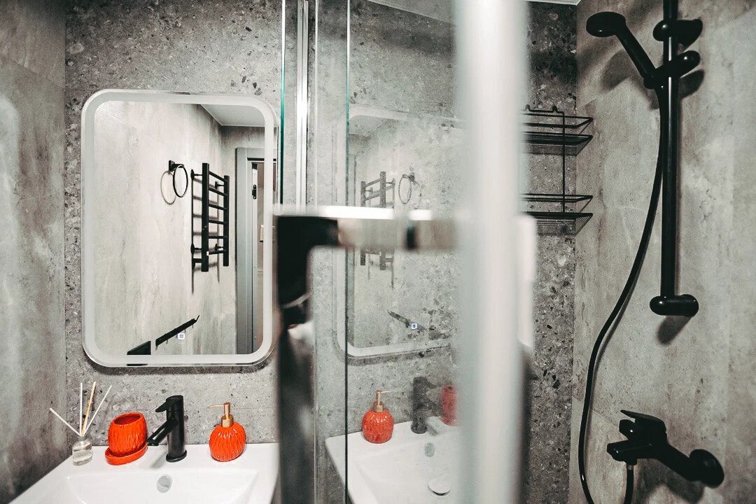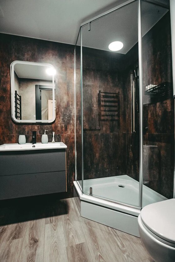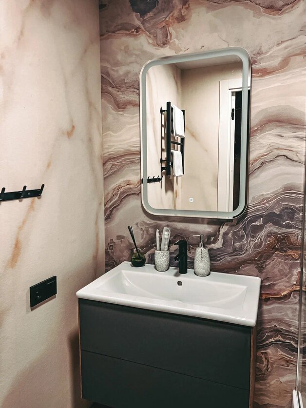 Авторский дизайн, теплый пол, продуманная система освещения, шторы blackout, фактурные материалы в отделке.