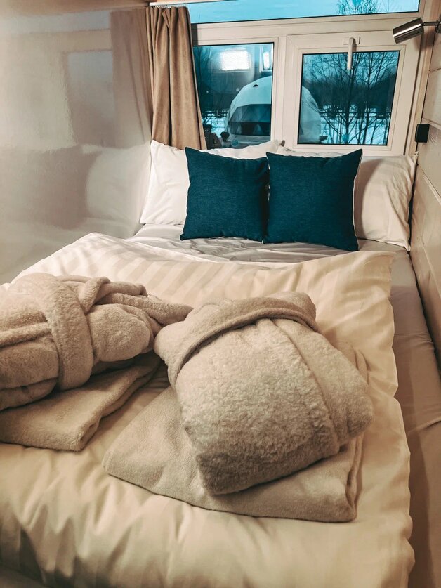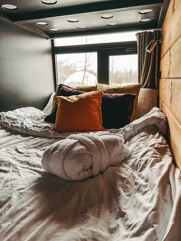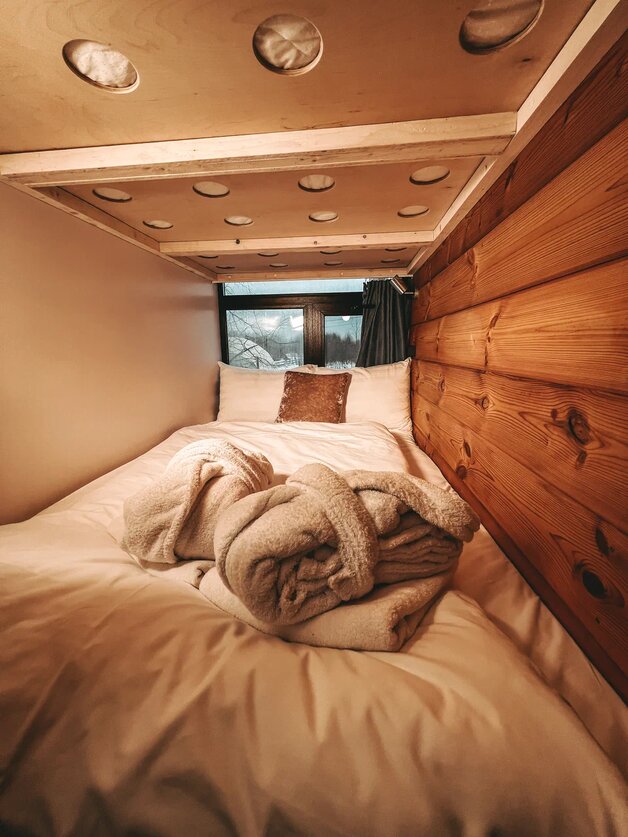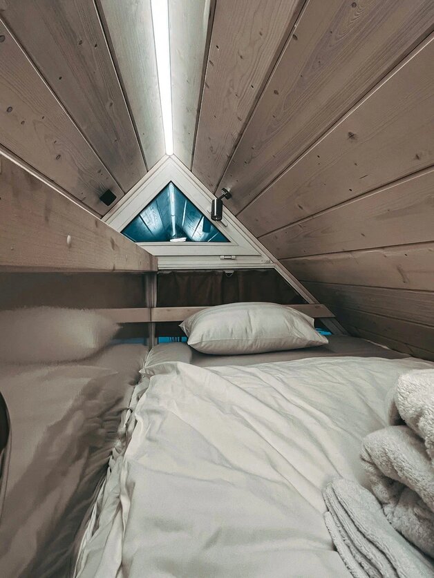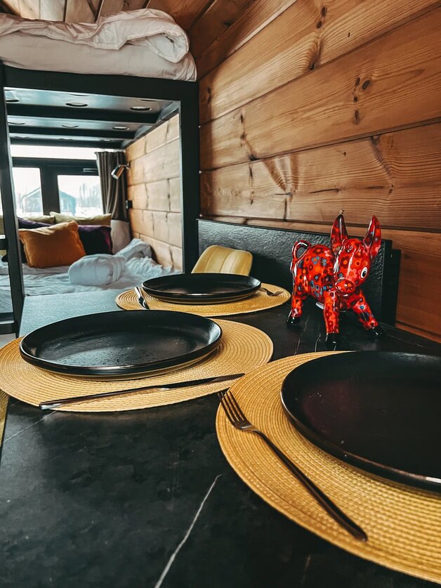Максимально продуманный и эргономичный интерьер, естественная циркуляция воздуха. Экологичные материалы, природные фактуры, запах настоящего дерева и натуральные цвета. Панорамные виды, кровать у самого окна, кухонный уголок и санузел с душем.