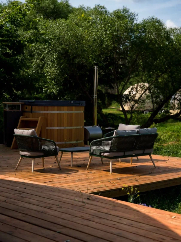 Терраса с грилем для вашего отдыха, неспешных завтраков и пикников под открытым небом, а также собственная горячая купель фурако.