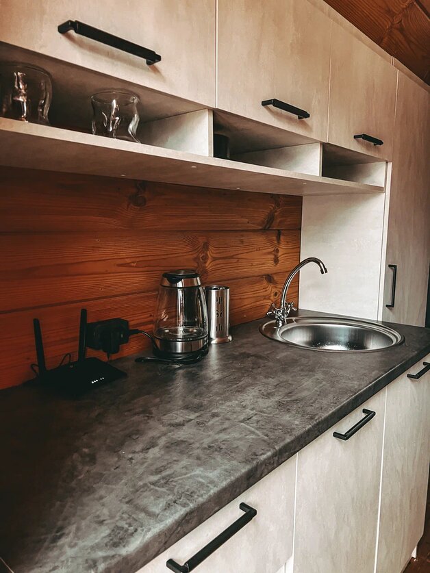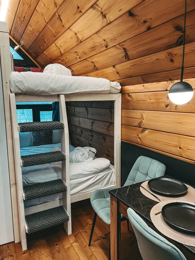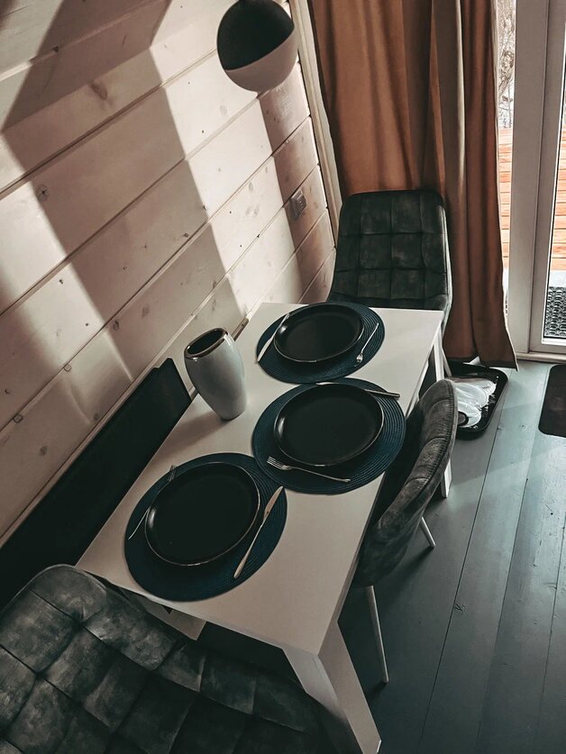 Кровать у окна с панорамным видом на лес, кухонный уголок, рабочее/обеденное место и санузел с душем. Эргономичный интерьер, продуманный до мелочей. Экологичные материалы, натуральные цвета и природные фактуры в отделке. Предусмотрен для вашего комфортного отдыха круглый год.
