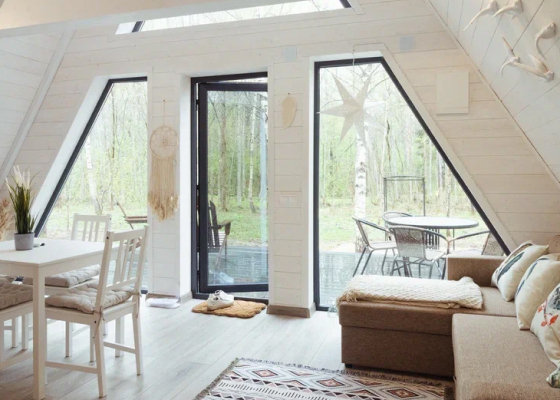 Авторский дизайн и огромное, во всю стену окно, благодаря которому в домике так много света и воздуха.