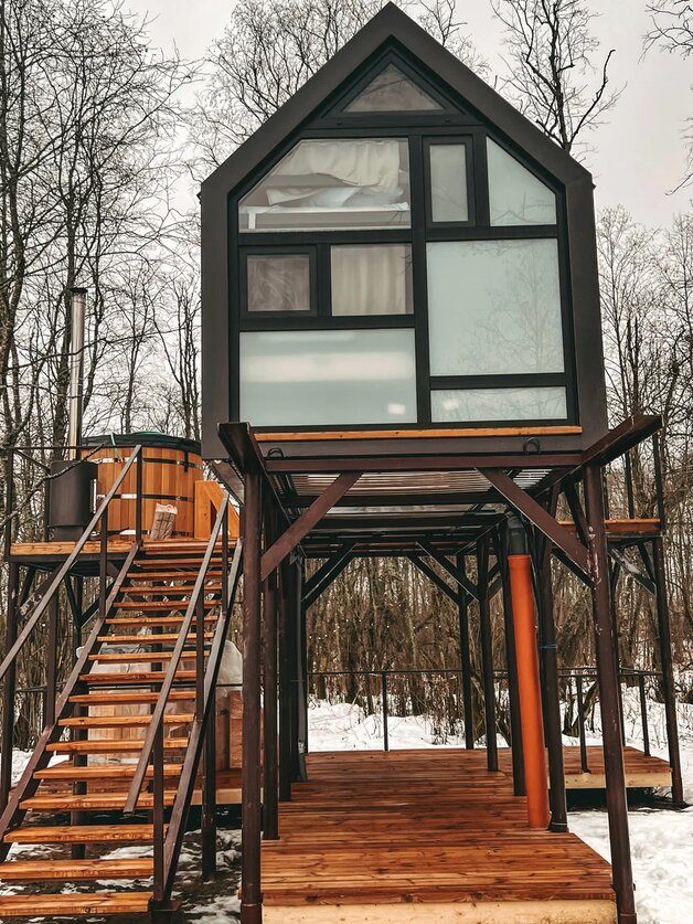 Круглогодичный небольшой и невероятно уютный домик, расположенный на высоте 3 метров над землей. Спрятан от посторонних глаз среди ветвей деревьев. Это тайное место, о котором вы так мечтали в детстве, где будете чувствовать себя в полной безопасности.