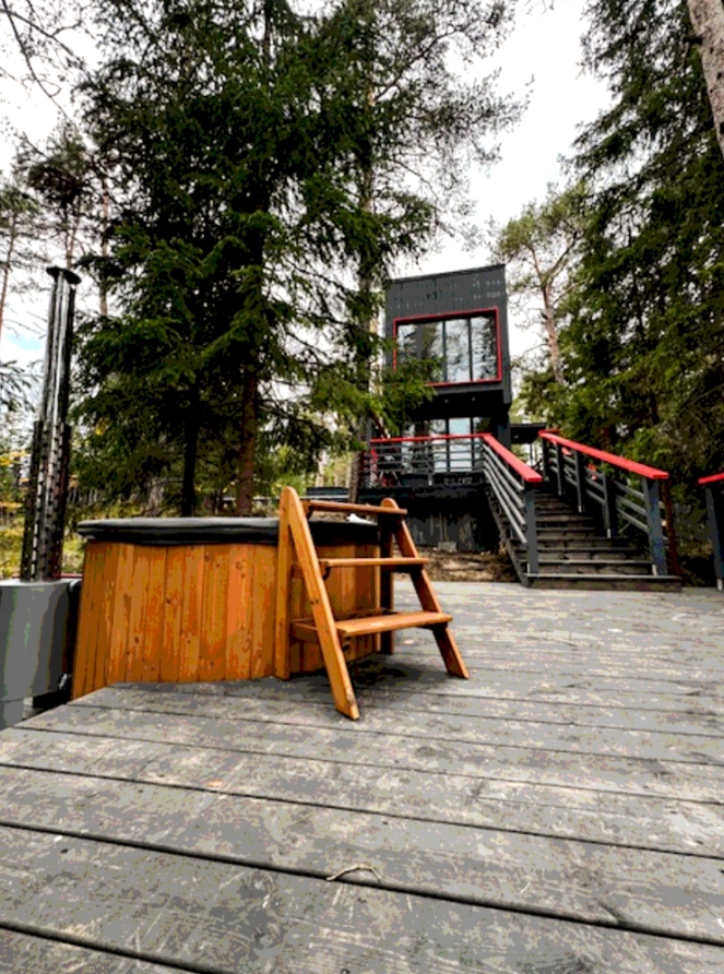 У каждого дома есть свои открытые двух или трех уровневые террасы с собственным BBQ , мебелью для комфортного времяпровождения на открытом воздухе, а так же дровяные купели для SPA процедур в окружении хвойного леса с видом на Ладогу!