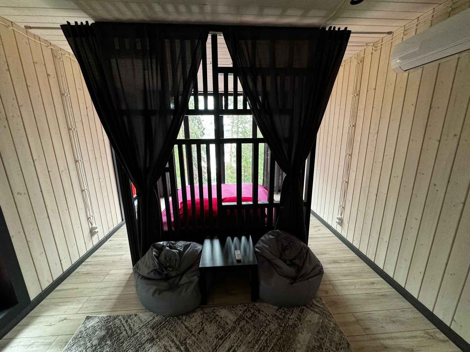 Домики оборудованы печкой камином, теплым полом, кондиционерами с функцией обогрева на каждом этаже, панорамными окнами, телевизором, холодильником, электроплитой, wi-fi роутером, и всем необходимым для приготовления пищи.