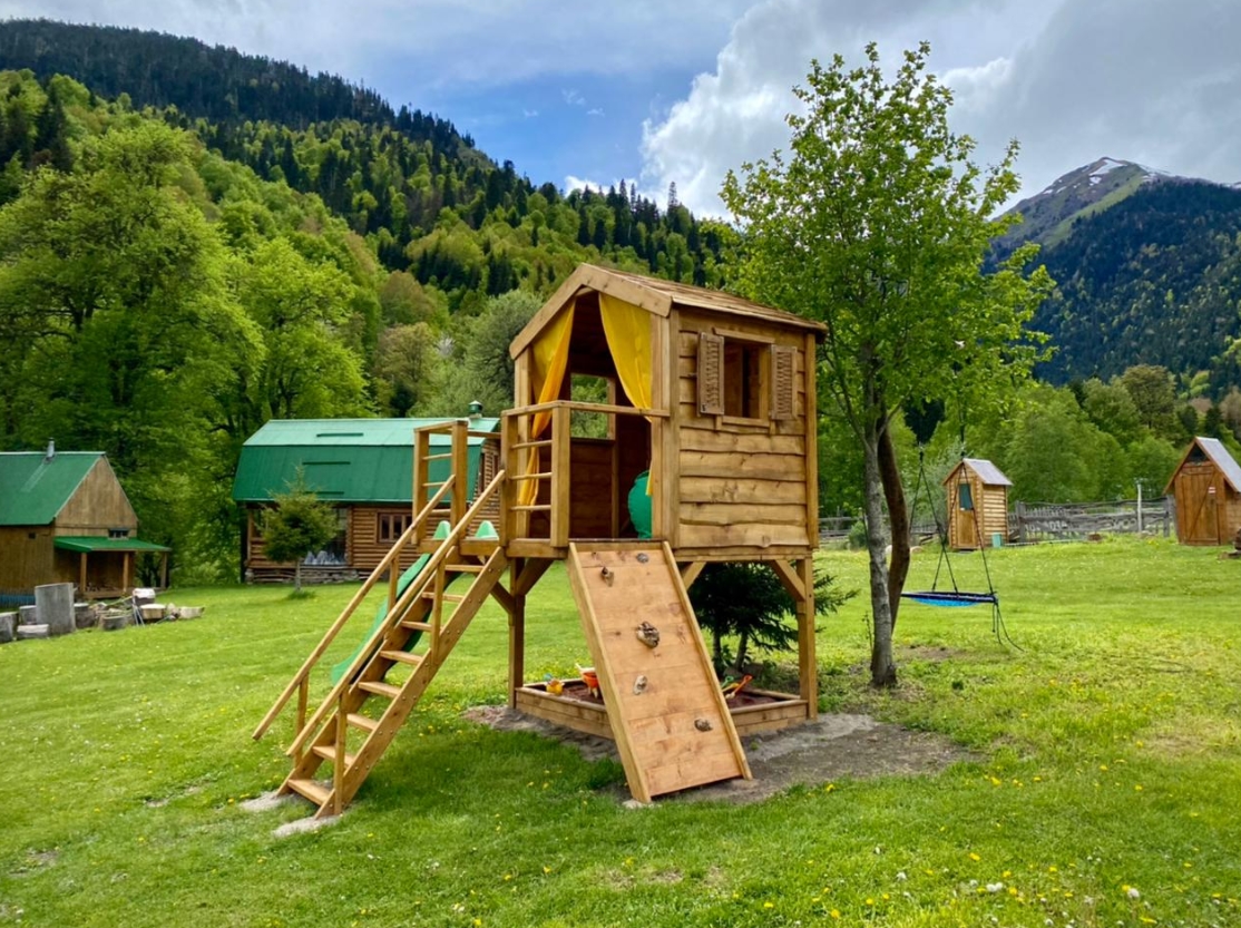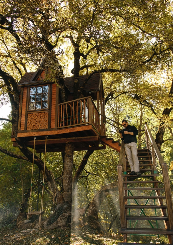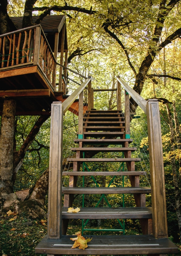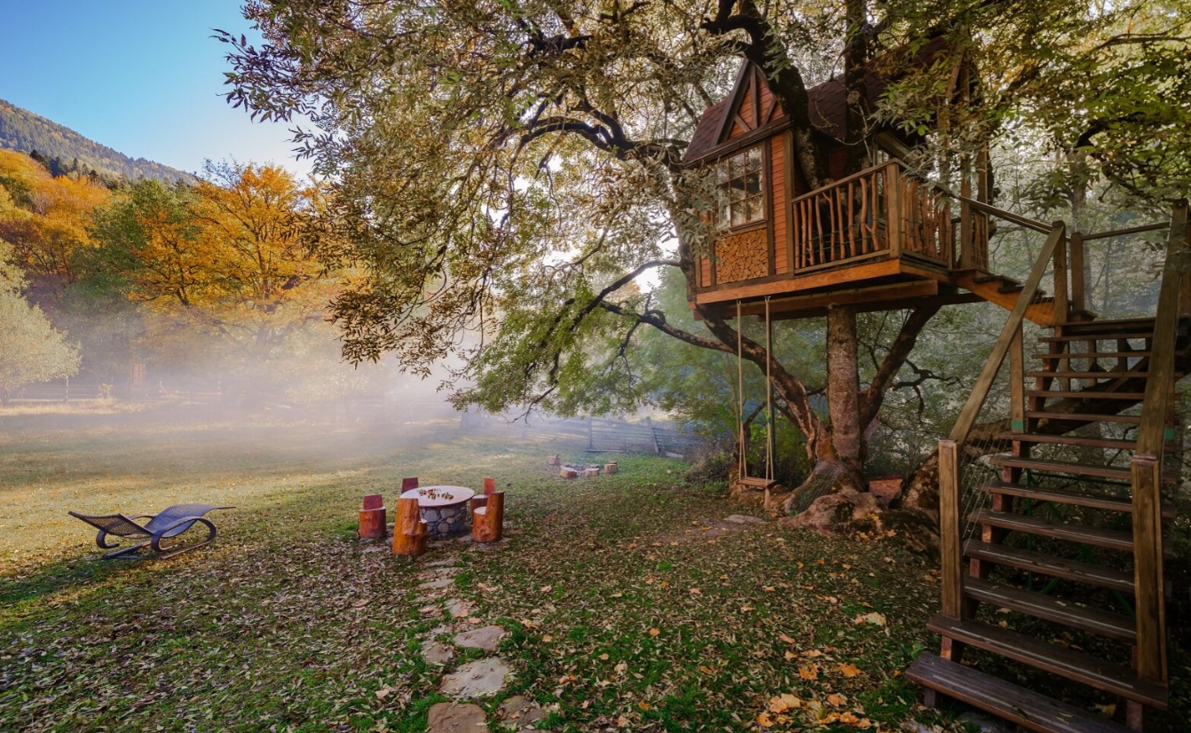 Домик построен на стволе ясеня на высоте 4 метра. С одной стороны от домика находится просторная поляна, с другой - берег горной реки. В домике есть водопровод, отопление и электричество, двухспальная кровать и балкон с видом на горы. Под кроной дерева находится обеденная зона и подвесные качели.