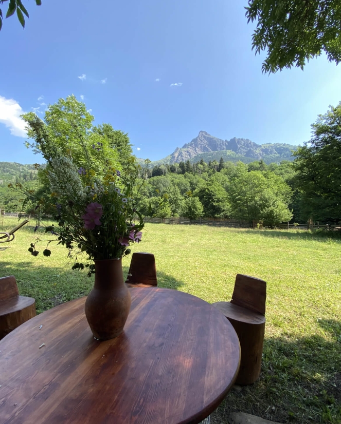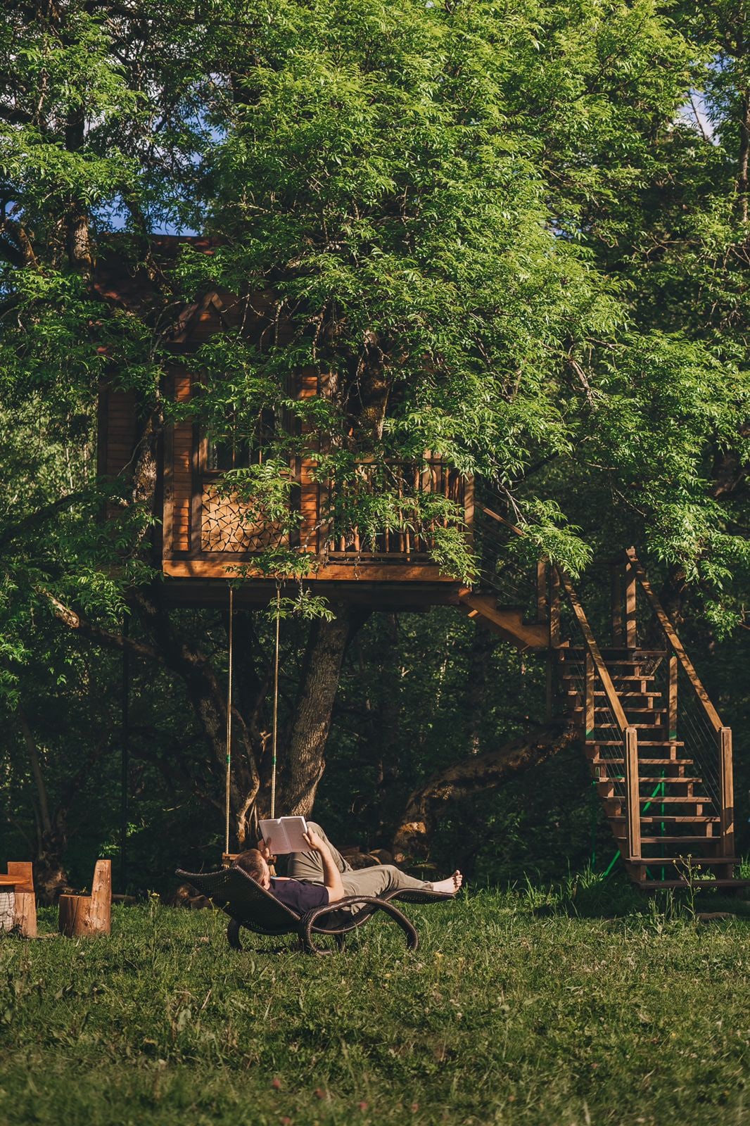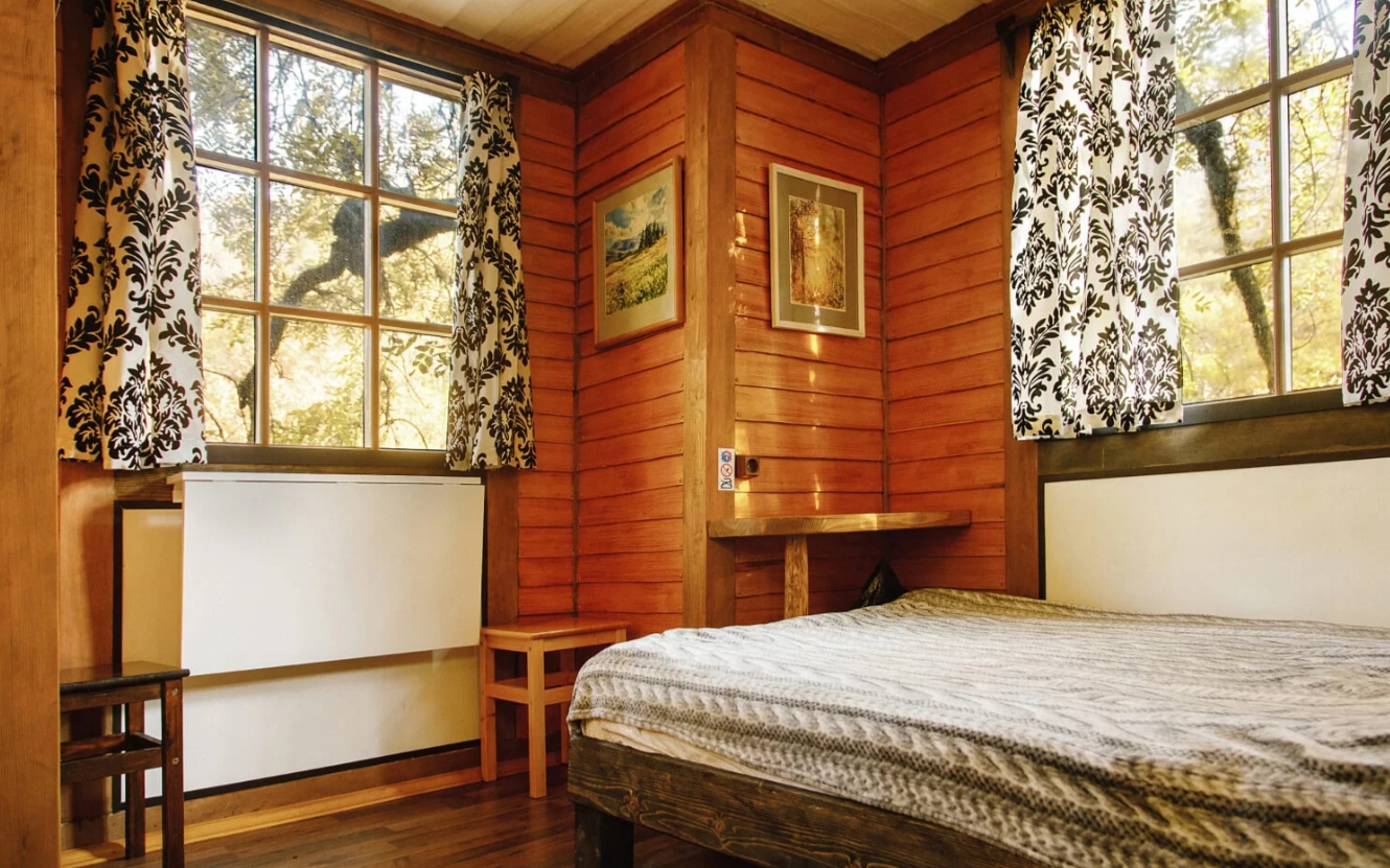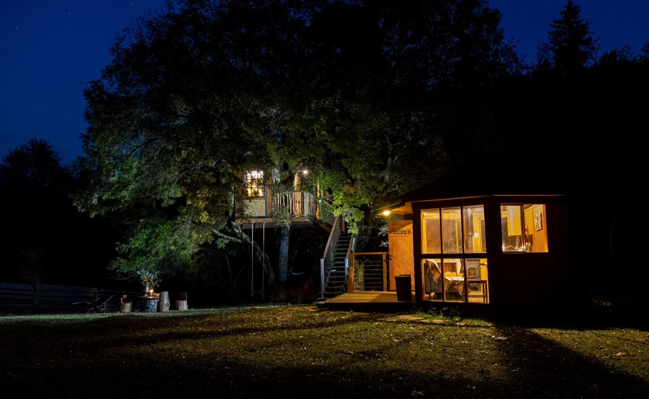 Домик построен на стволе ясеня на высоте 4 метра. С одной стороны от домика находится просторная поляна, с другой - берег горной реки. В домике есть водопровод, отопление и электричество, двухспальная кровать и балкон с видом на горы. Под кроной дерева находится обеденная зона и подвесные качели.