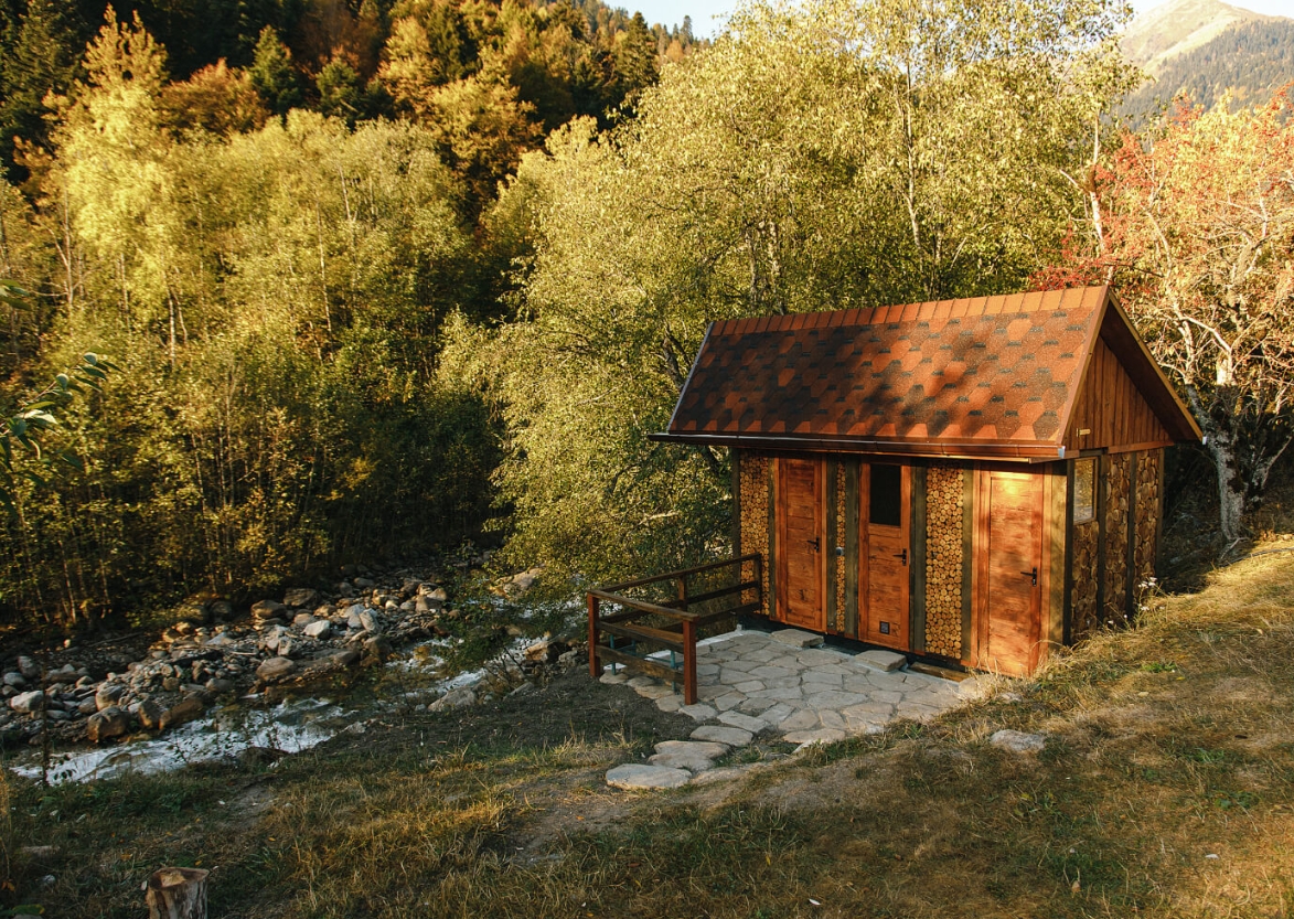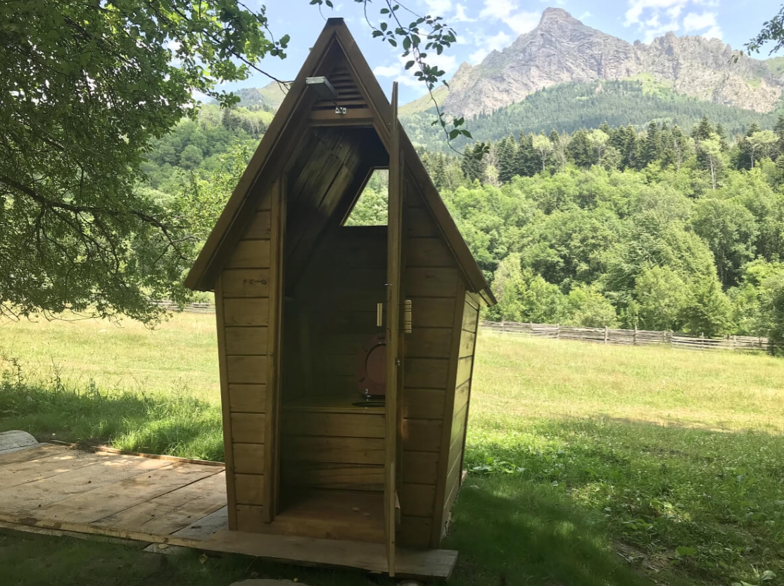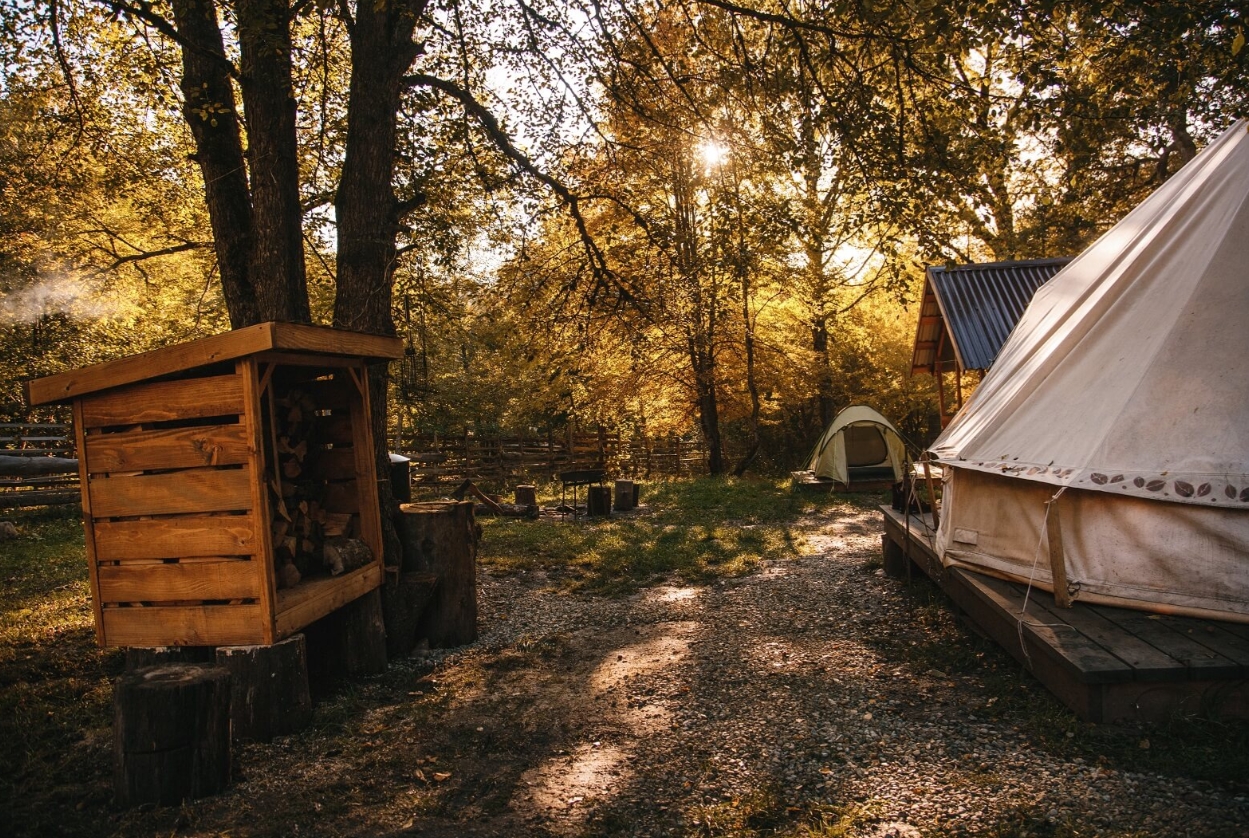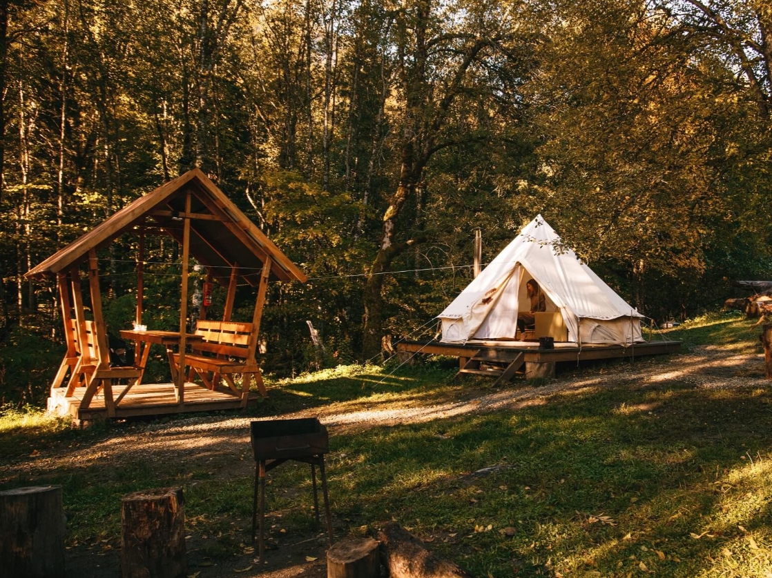 В глэмпинге расположены: современный альпийский домик, двухэтажный сруб у реки, домик на дереве, финские домики, шатёр-кемпинг, баня с бассейном и сибирский чан.
