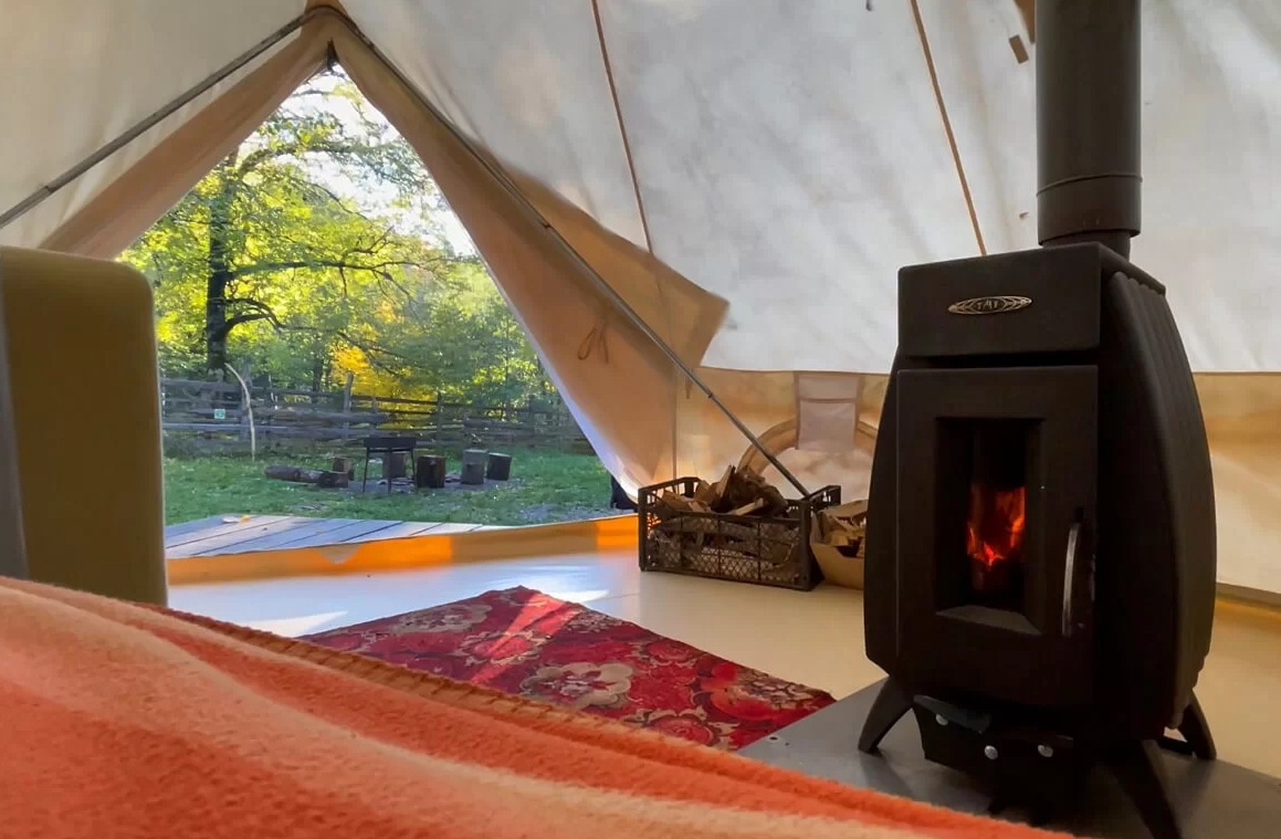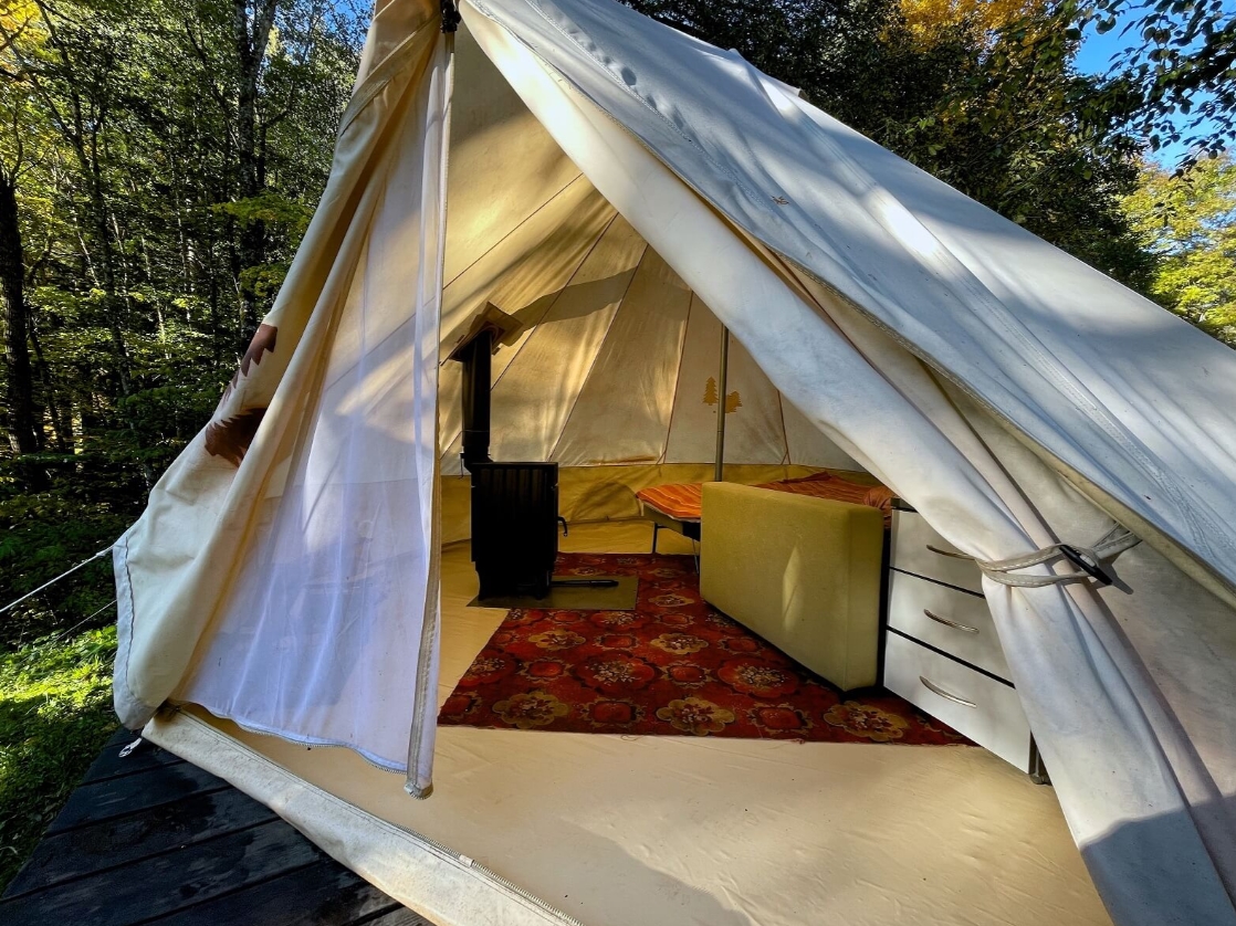 В вашем распоряжении - 2 деревянные площадки (4х4 и 3х3 м.) на одной из которых расположен шатёр с печкой, двуспальным диваном (без постельного белья) и тумбочкой. Беседка с освещением, оборудованное место для приготовления пищи и разведения костра. Имеется водопровод и туалет, природный холодильник.