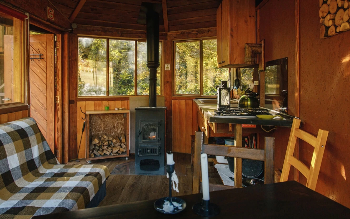 На земле, рядом с домом, стоит утепленная кухня с панорамным остеклением, камином и горячей водой. На кухне есть возможность разместить 2 гостей на раскладном "диване-полуторке". Во время отдыха гости могут использовать мангал с навесом и шезлонг.