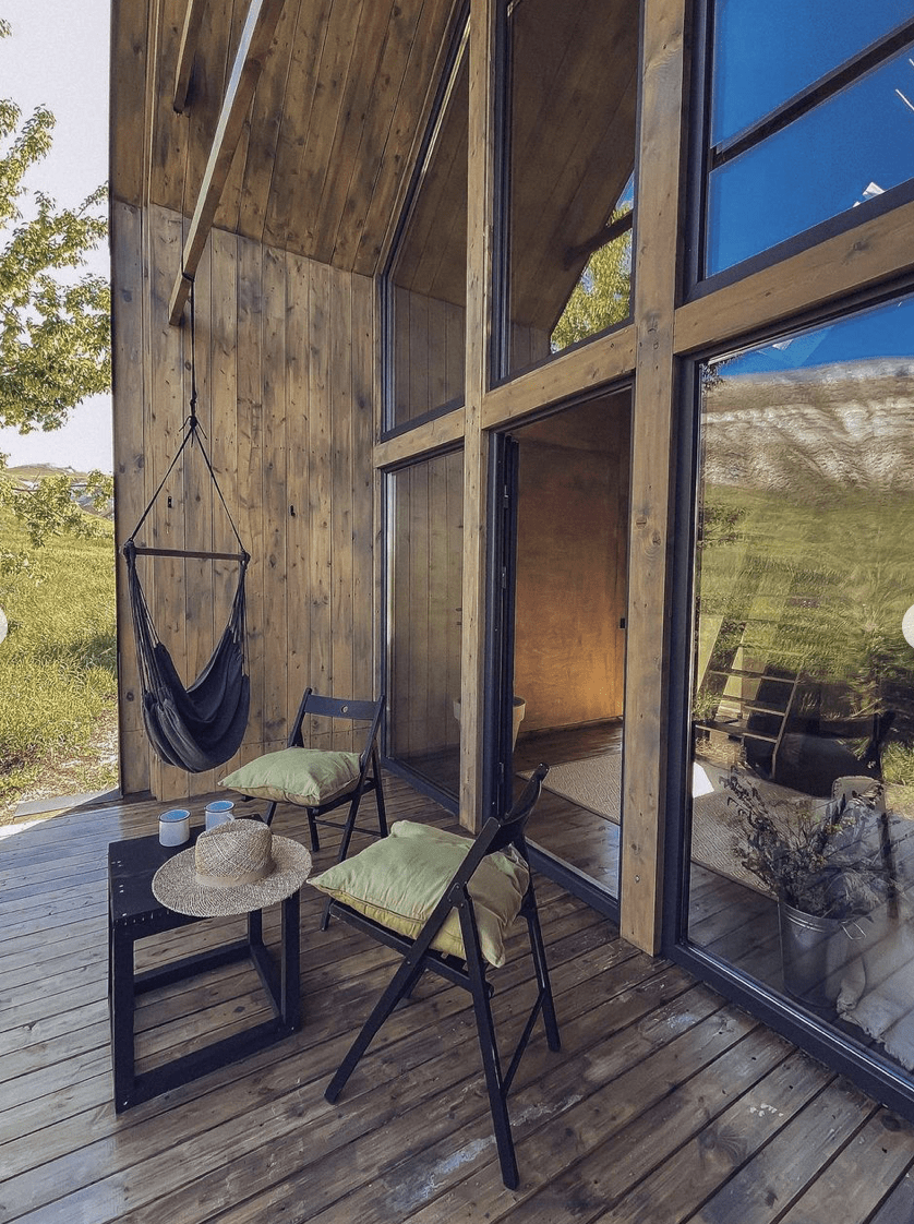 Небольшой tinyhouse оборудованный всем необходимым для комфортного отдыха на природе. Своя мини кухня с посудой, чайником, электроплиткой и холодильником. Санузел с душевой. Двуспальная кровать на мансарде с видом на звездное небо. Небольшая, но наполненная воздухом и светом гостиная. Диван кровать на первом этаже. Небольшая терасса с видом на холмы.