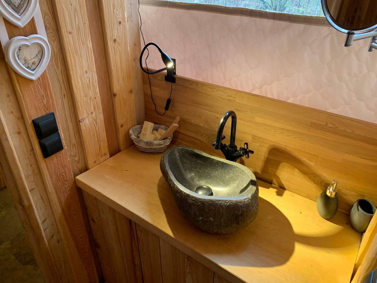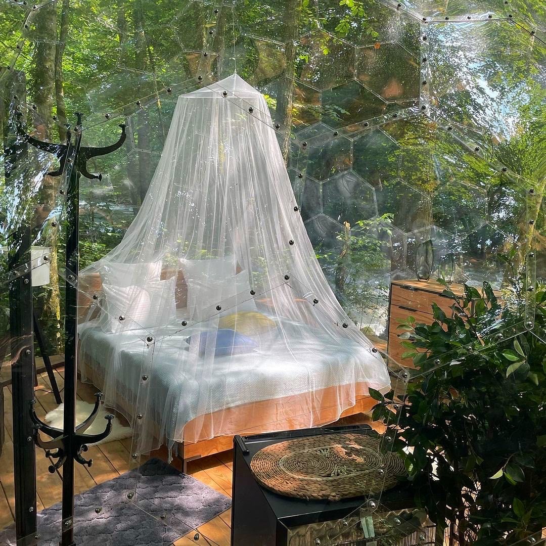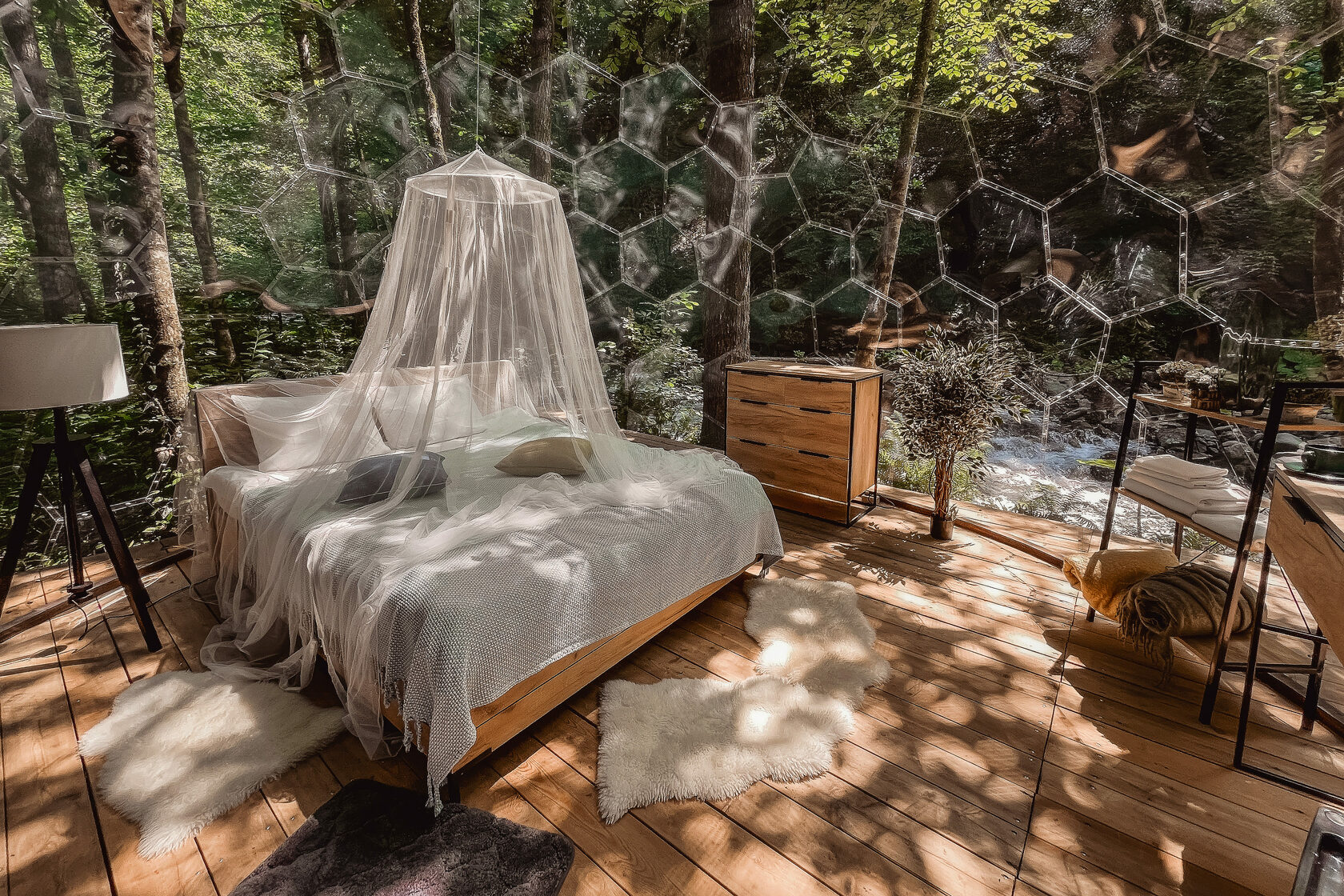 Уединенная сфера на берегу реки 20 кв.м. Оснащена всем необходимым. Большая двухспальная кровать king size. Мини бар, кофе-машина, чайник и угощения, сейф. Халат, тапочки, полотенца. Туалет и ванная 10 кв.м. находятся недалеко от сферы. Меню специализированных подушек