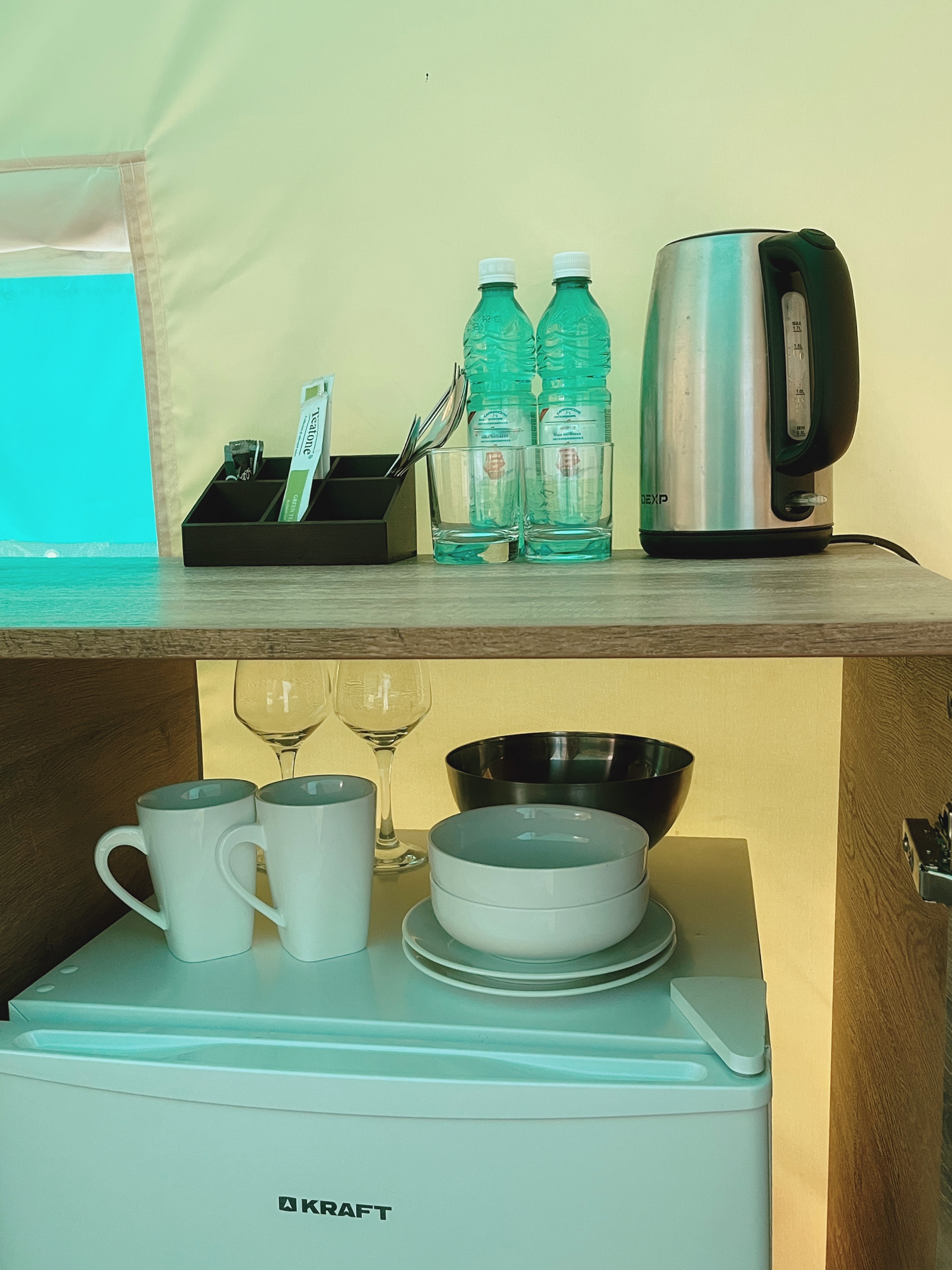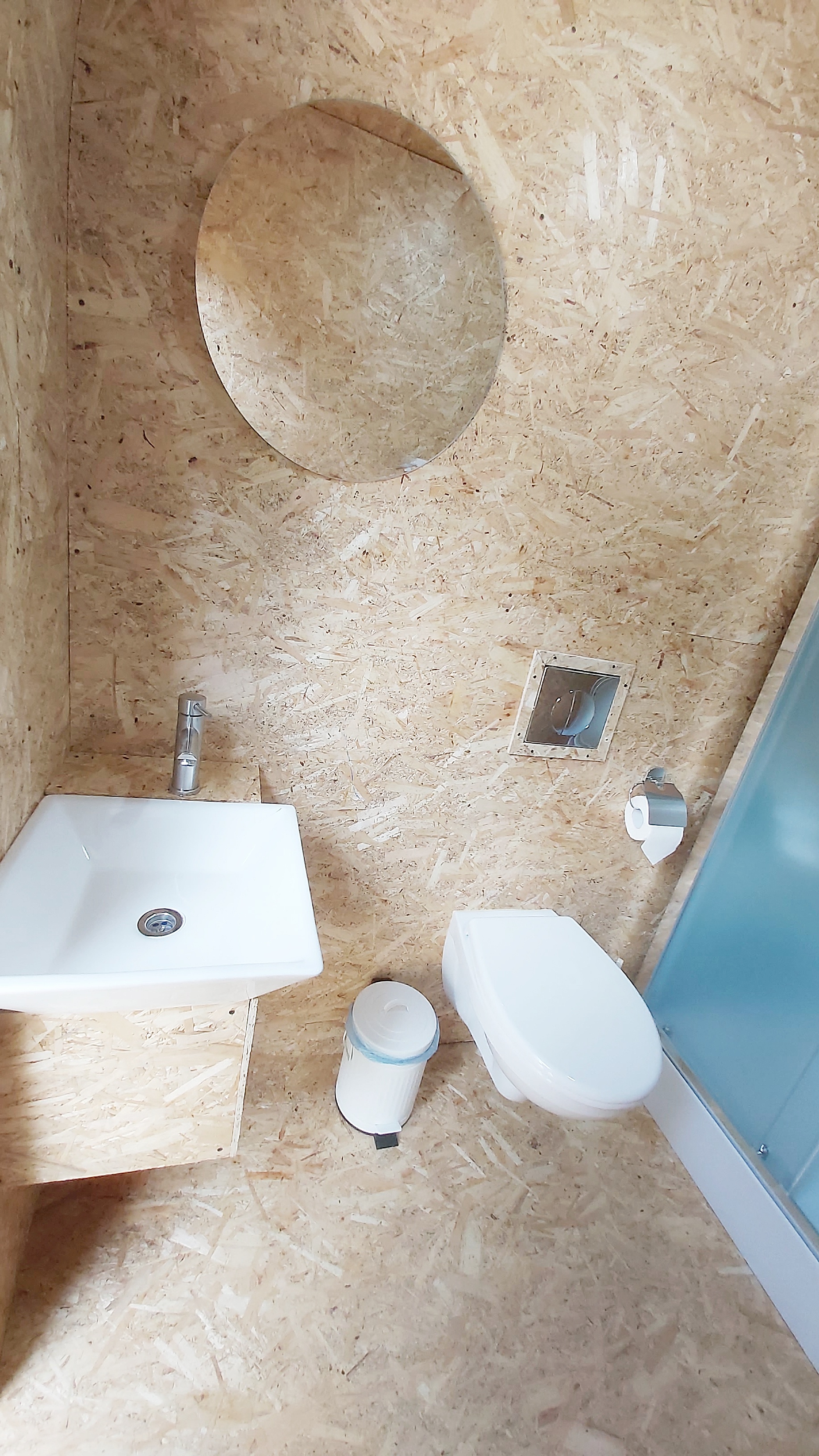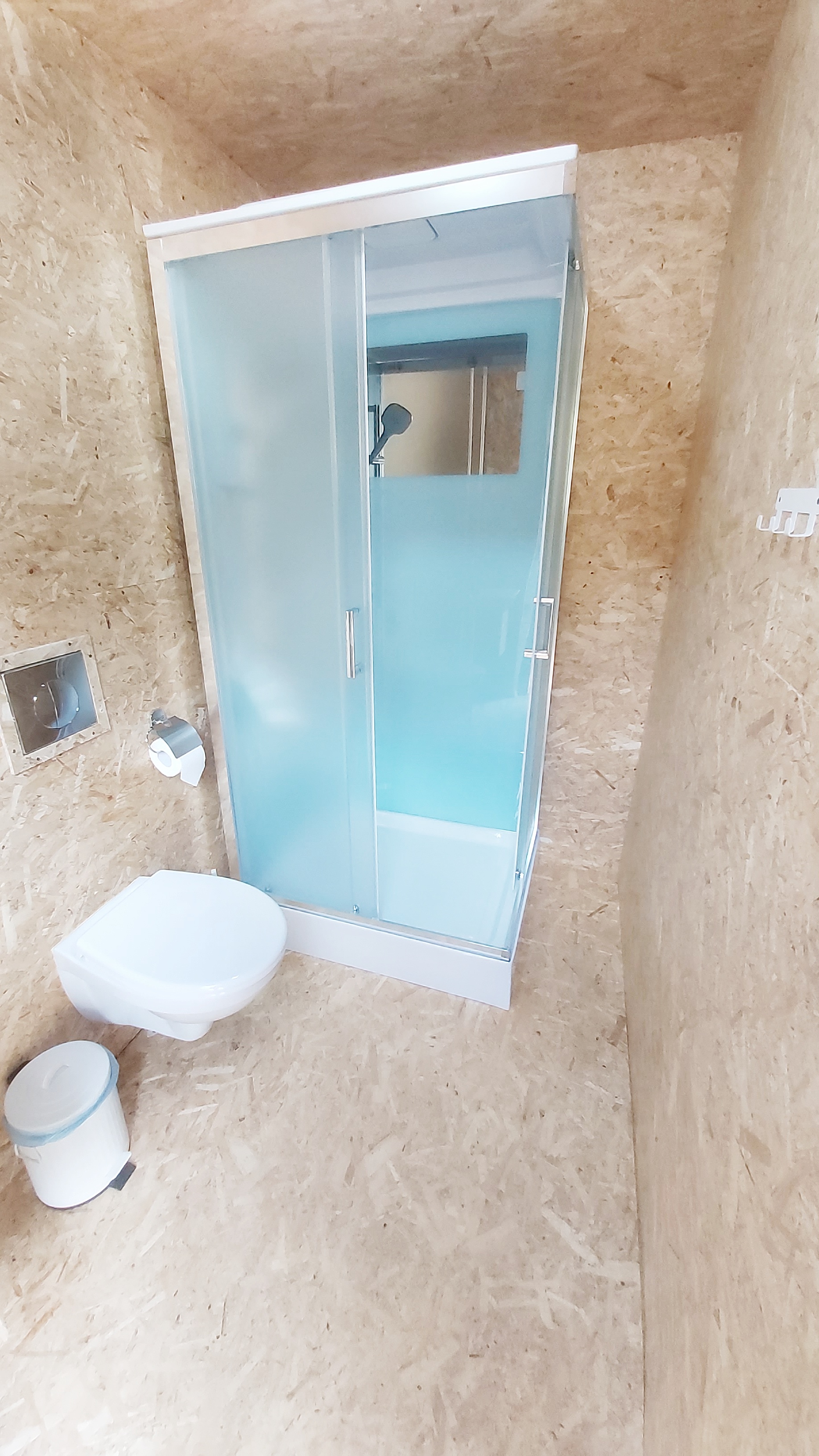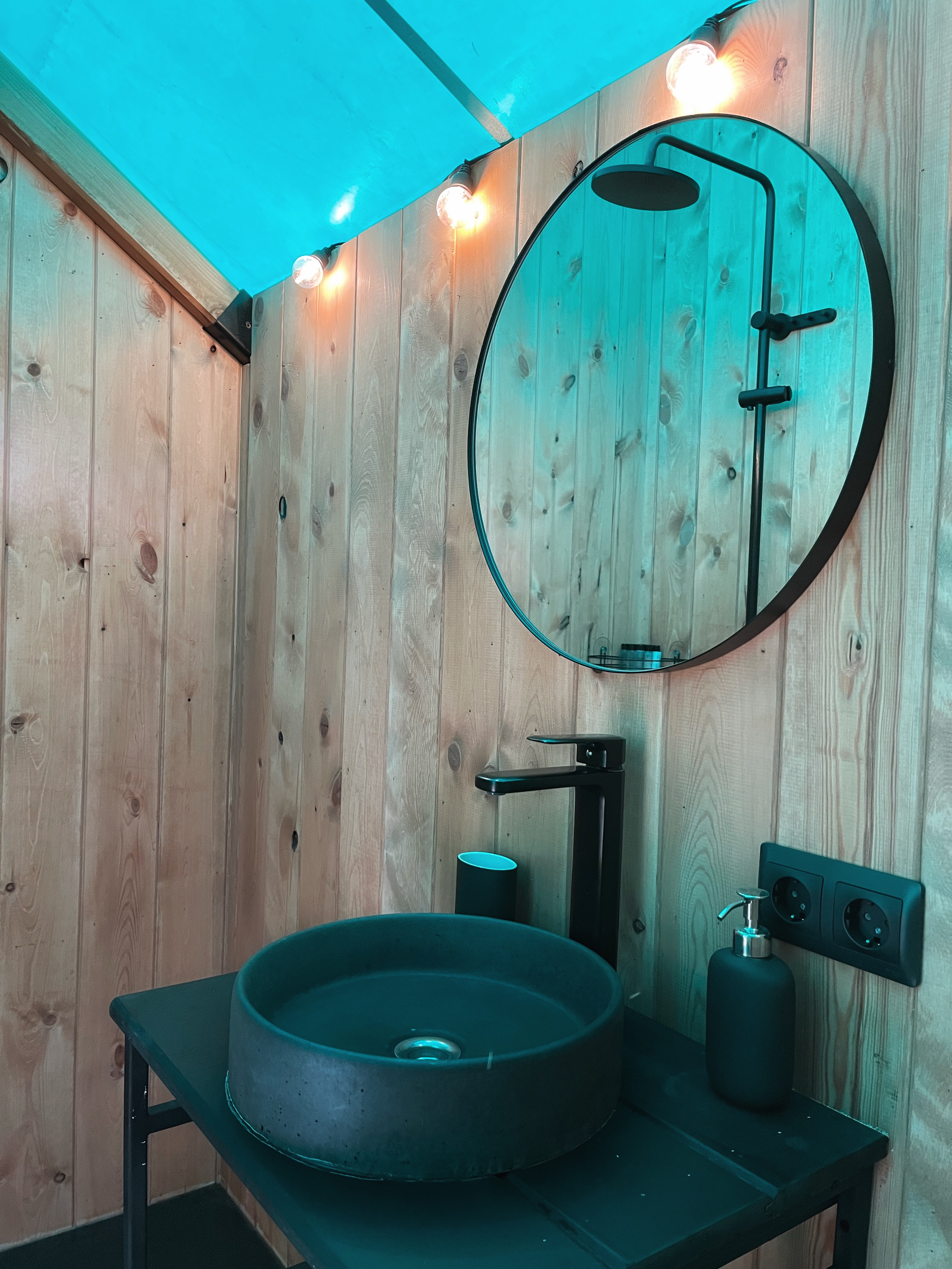 Общий санитарный модуль расположен возле глэмпинга №2 , в нем предусмотрены комнаты с душевой кабиной и раковиной, либо с унитазом и раковиной. Мангальная зона в шаговой доступности, на озере.